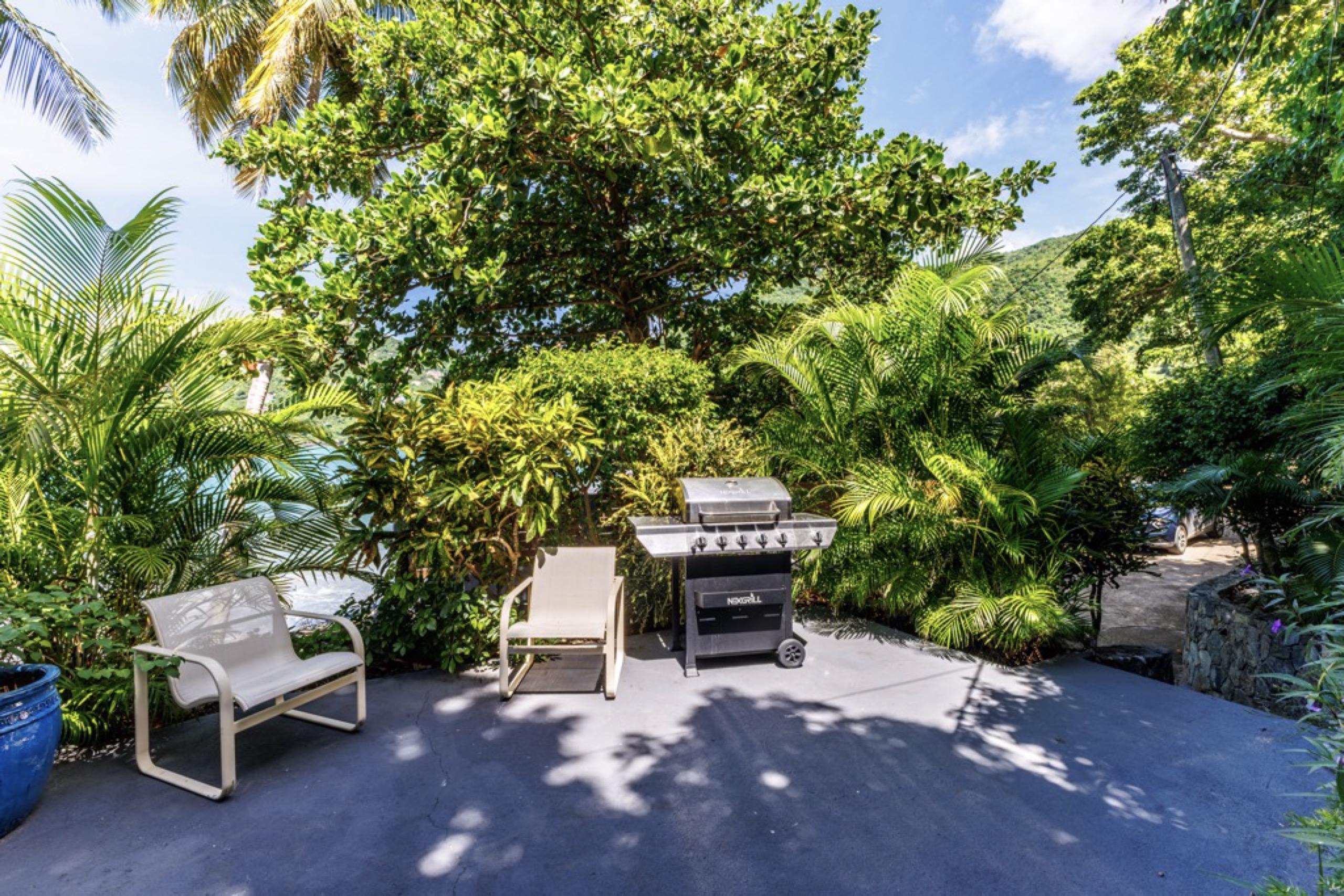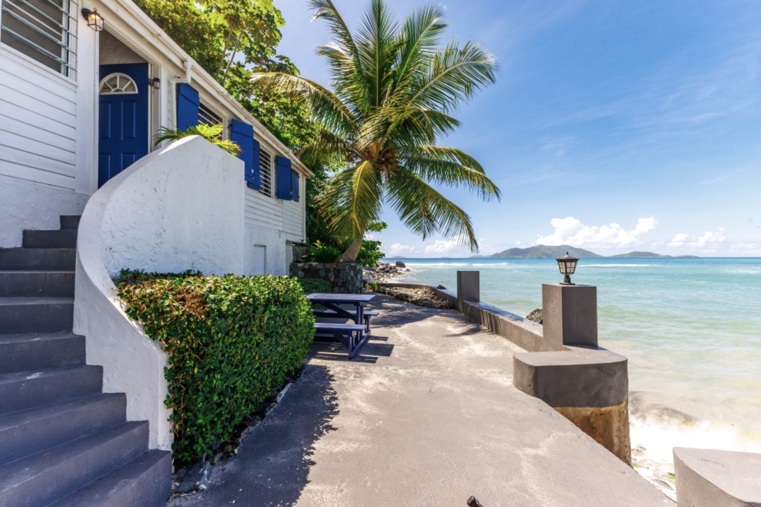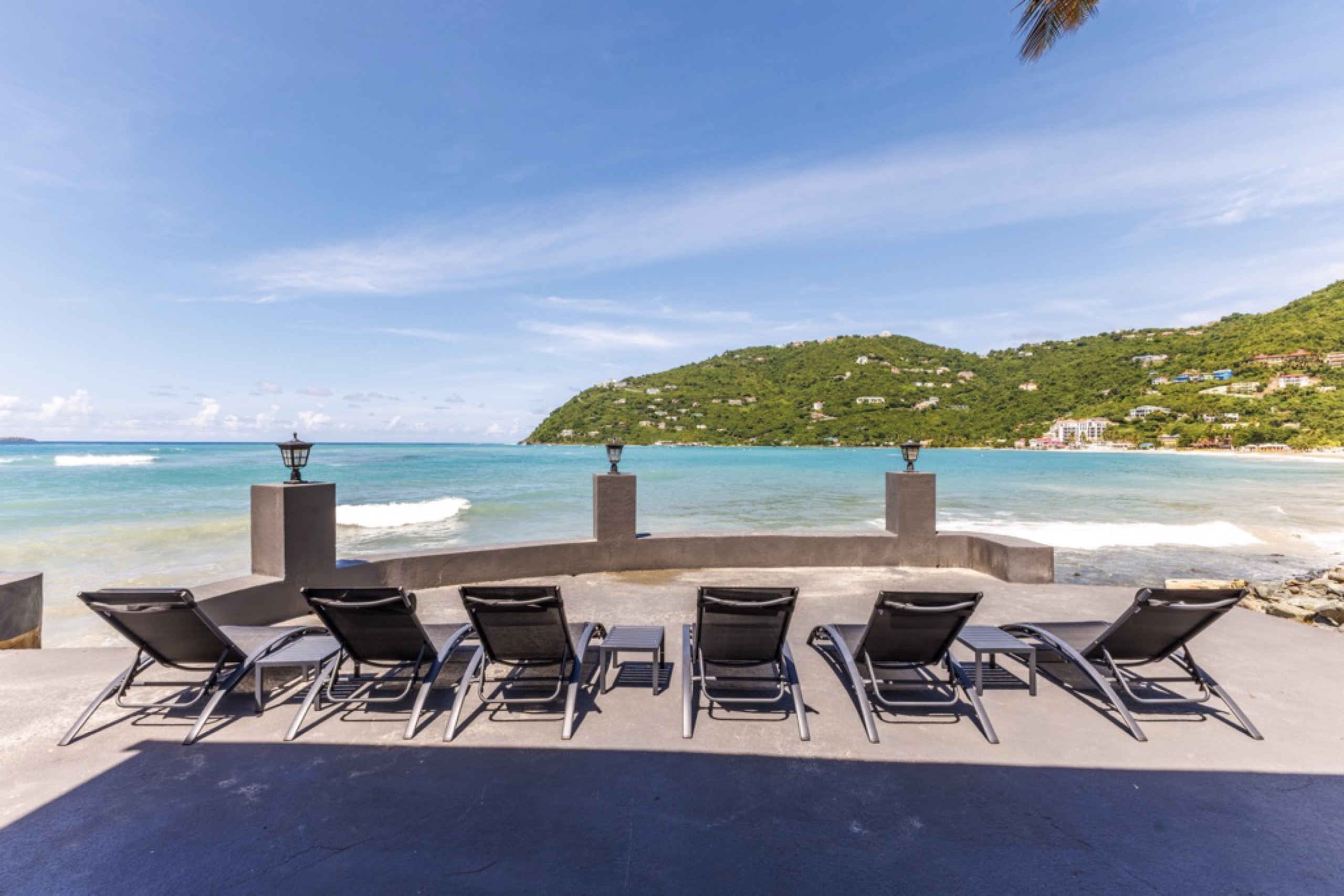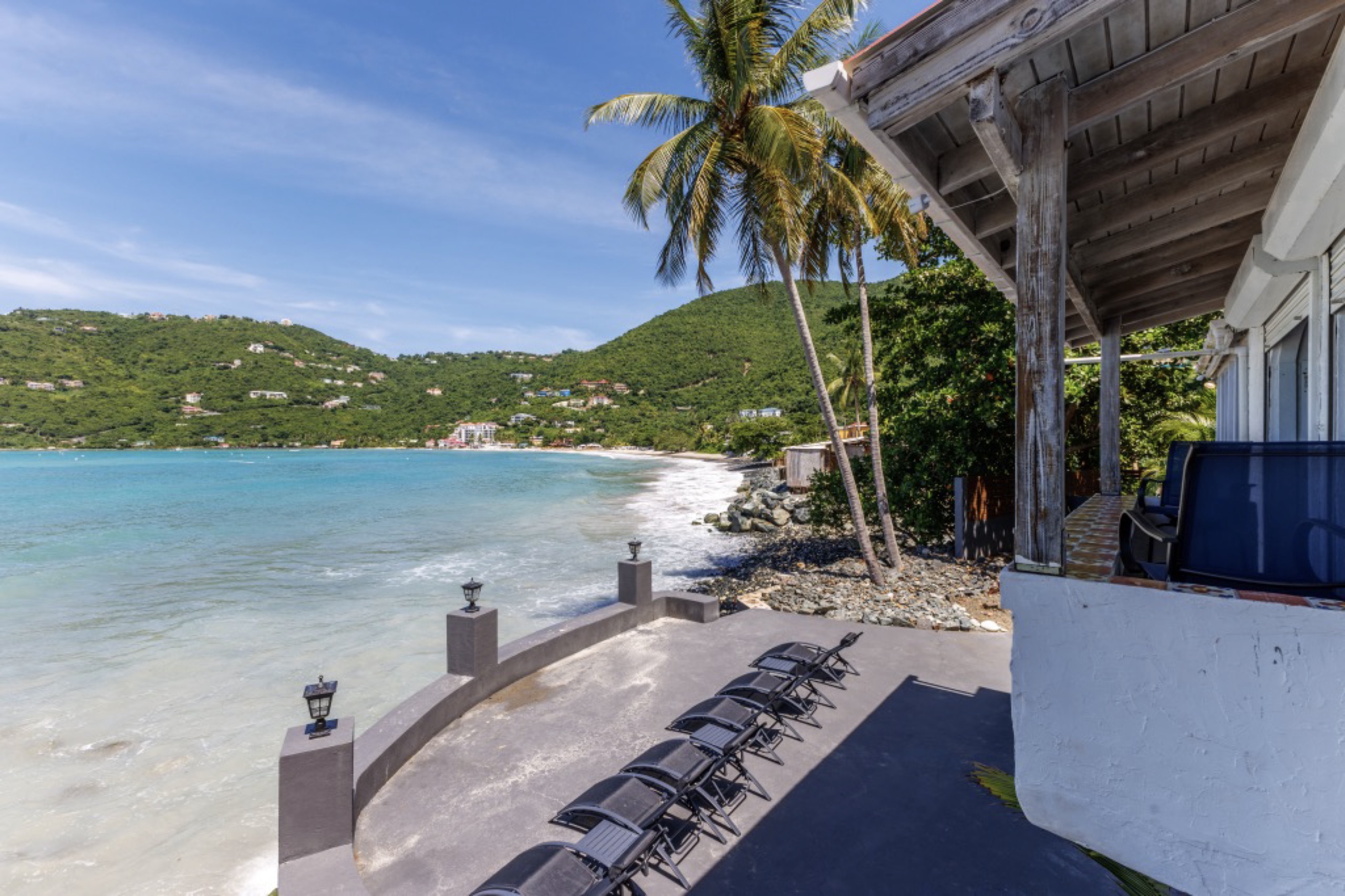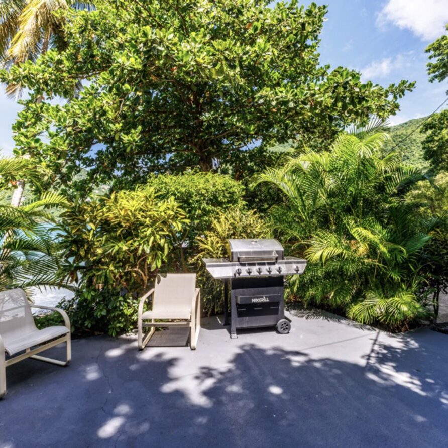 The outside seating area is right on the bay and has loungers, a picnic table and a grill for dining al fresco. Solar lights surround the seating area to provide illumination in the evenings. You may access the beach by a few easy steps from the villa.