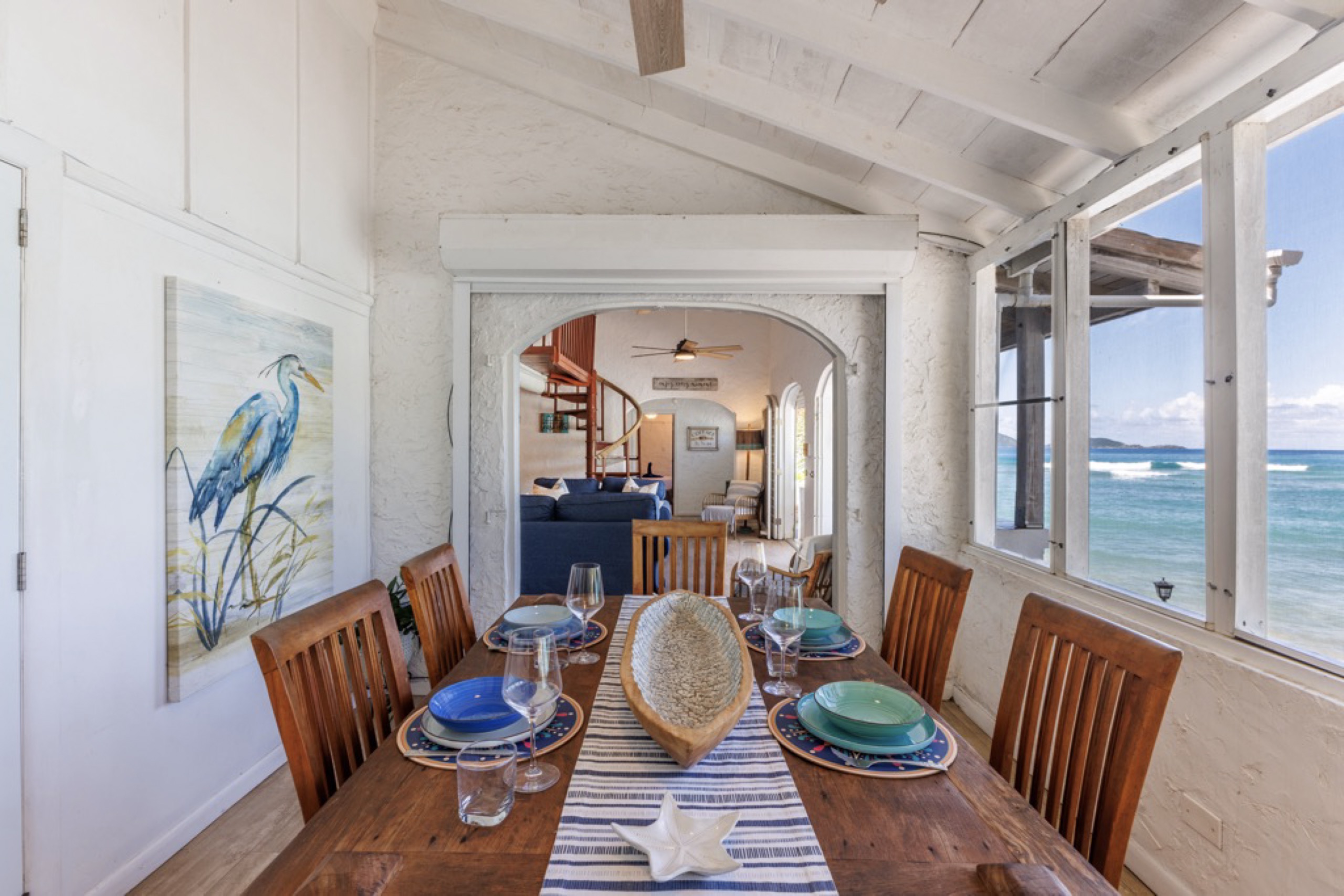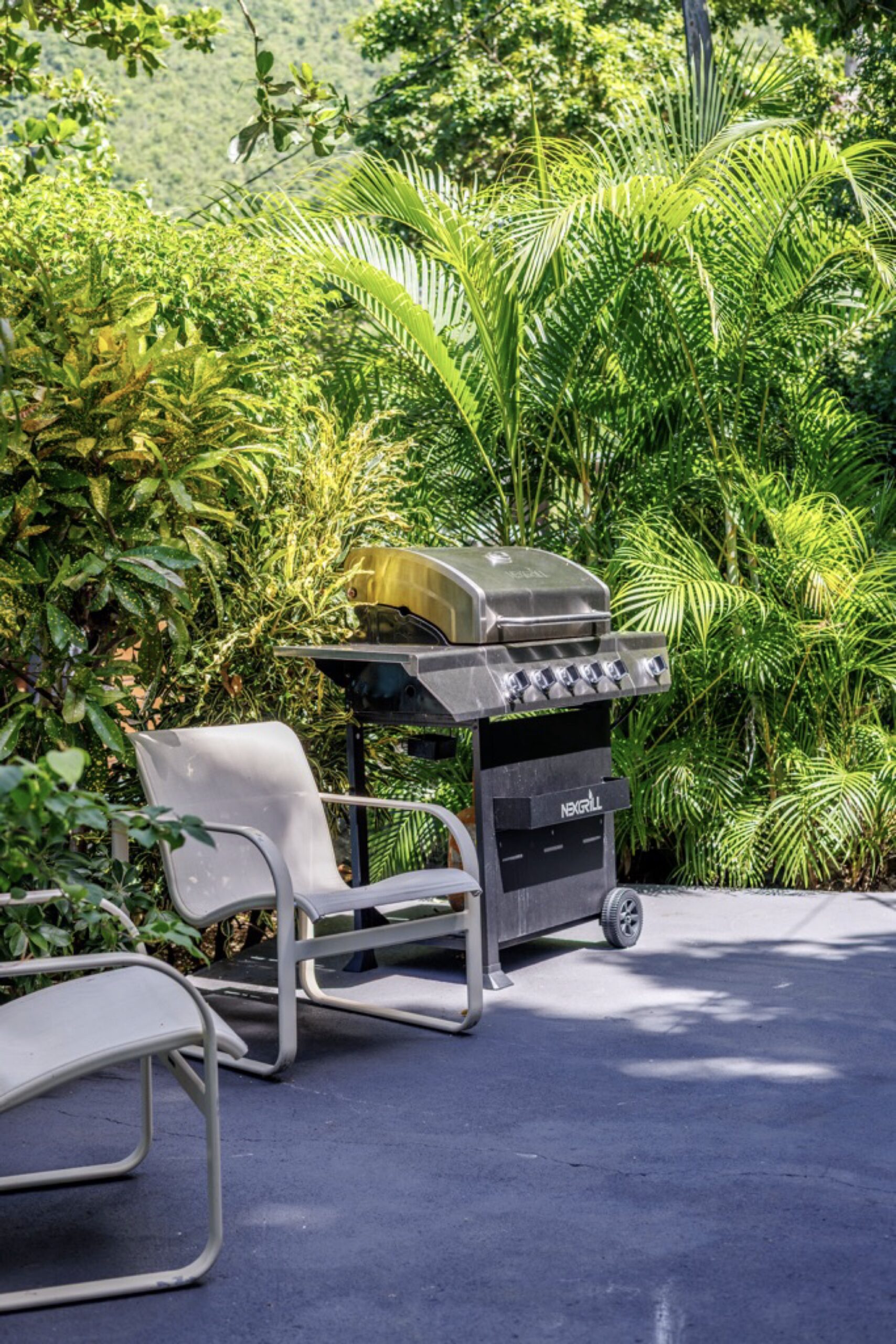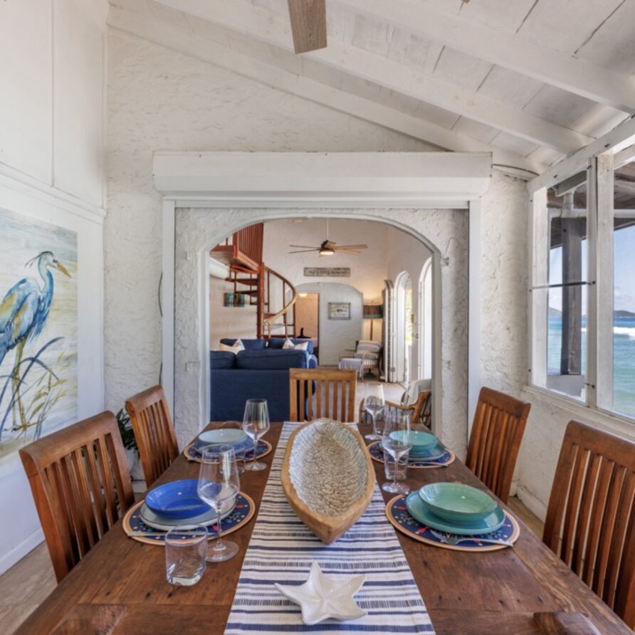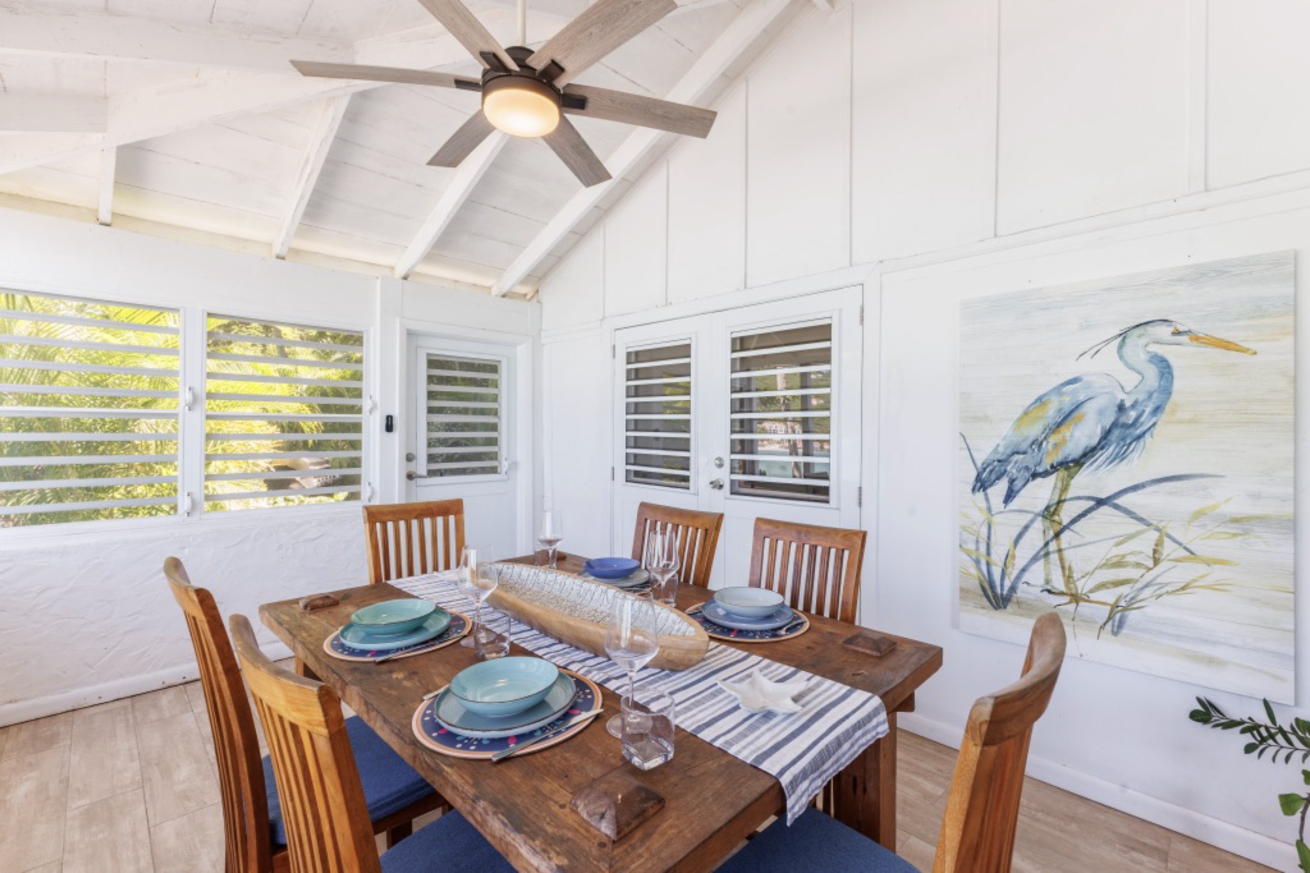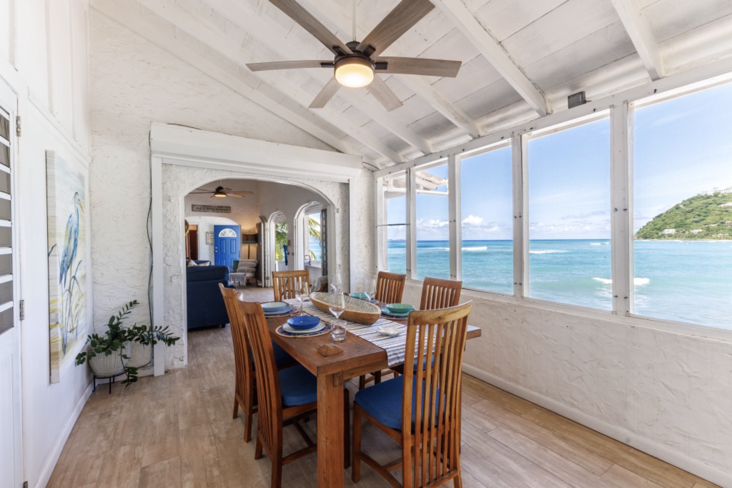 The outside seating area is right on the bay and has loungers, a picnic table and a grill for dining al fresco. Solar lights surround the seating area to provide illumination in the evenings. You may access the beach by a few easy steps from the villa.