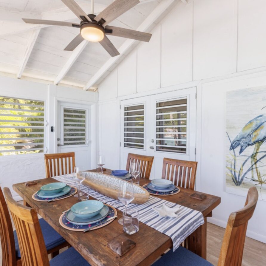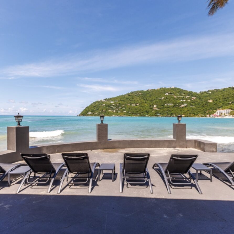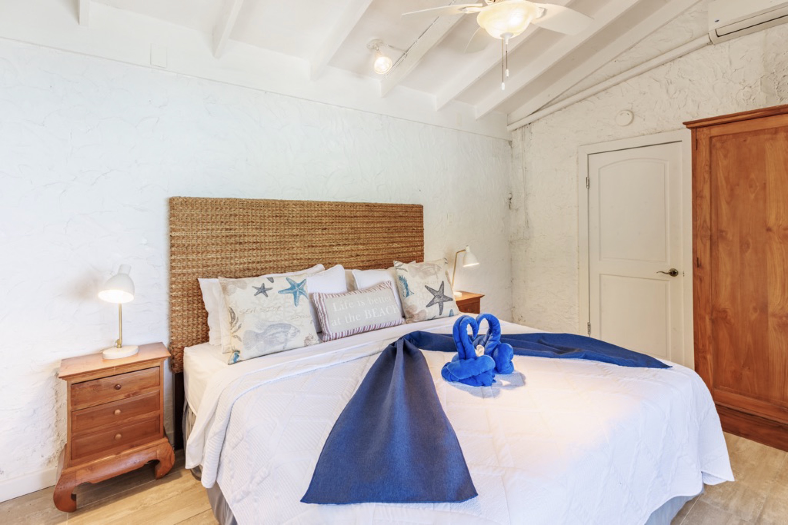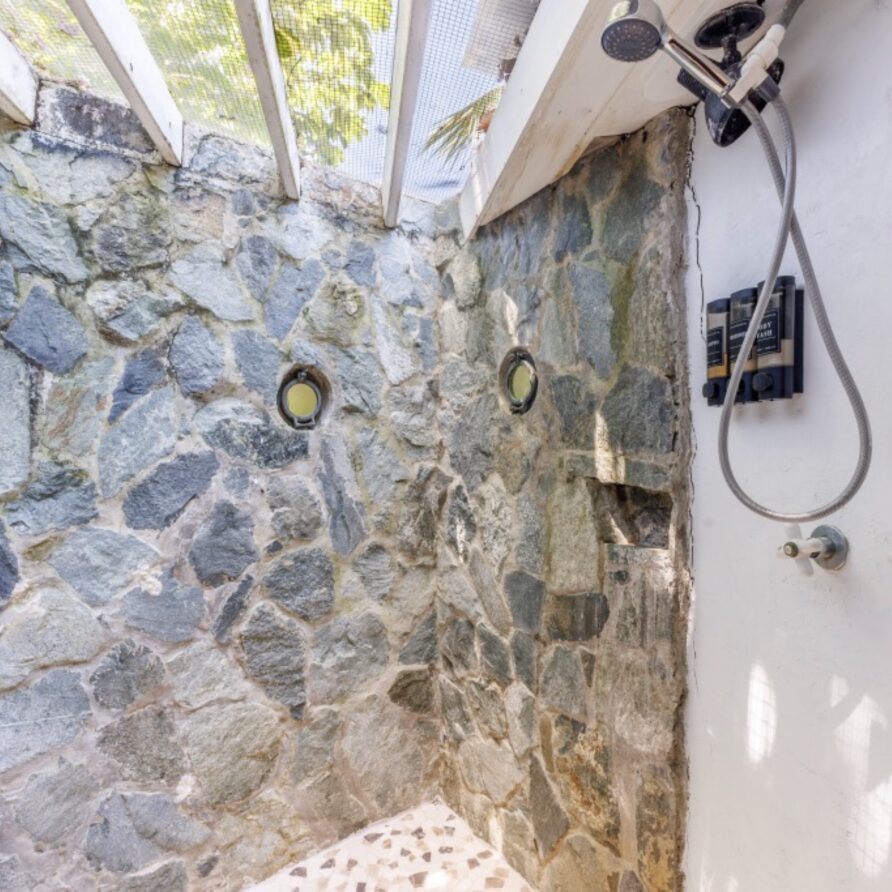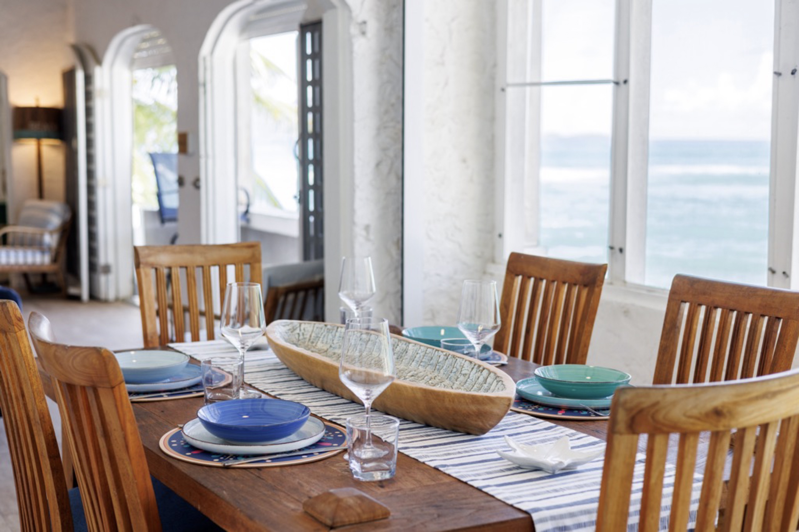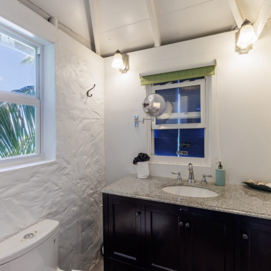 The outside seating area is right on the bay and has loungers, a picnic table and a grill for dining al fresco. Solar lights surround the seating area to provide illumination in the evenings. You may access the beach by a few easy steps from the villa.