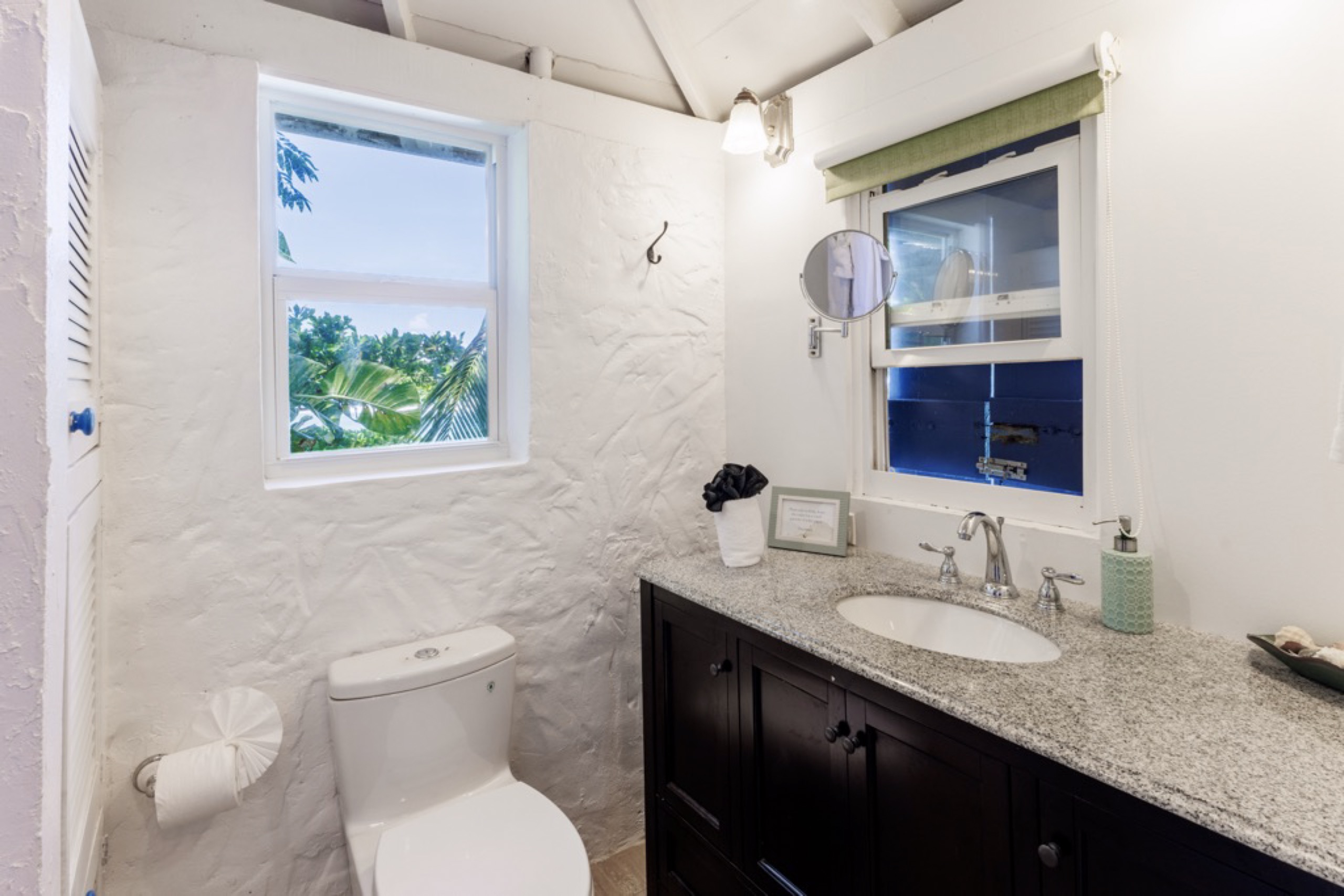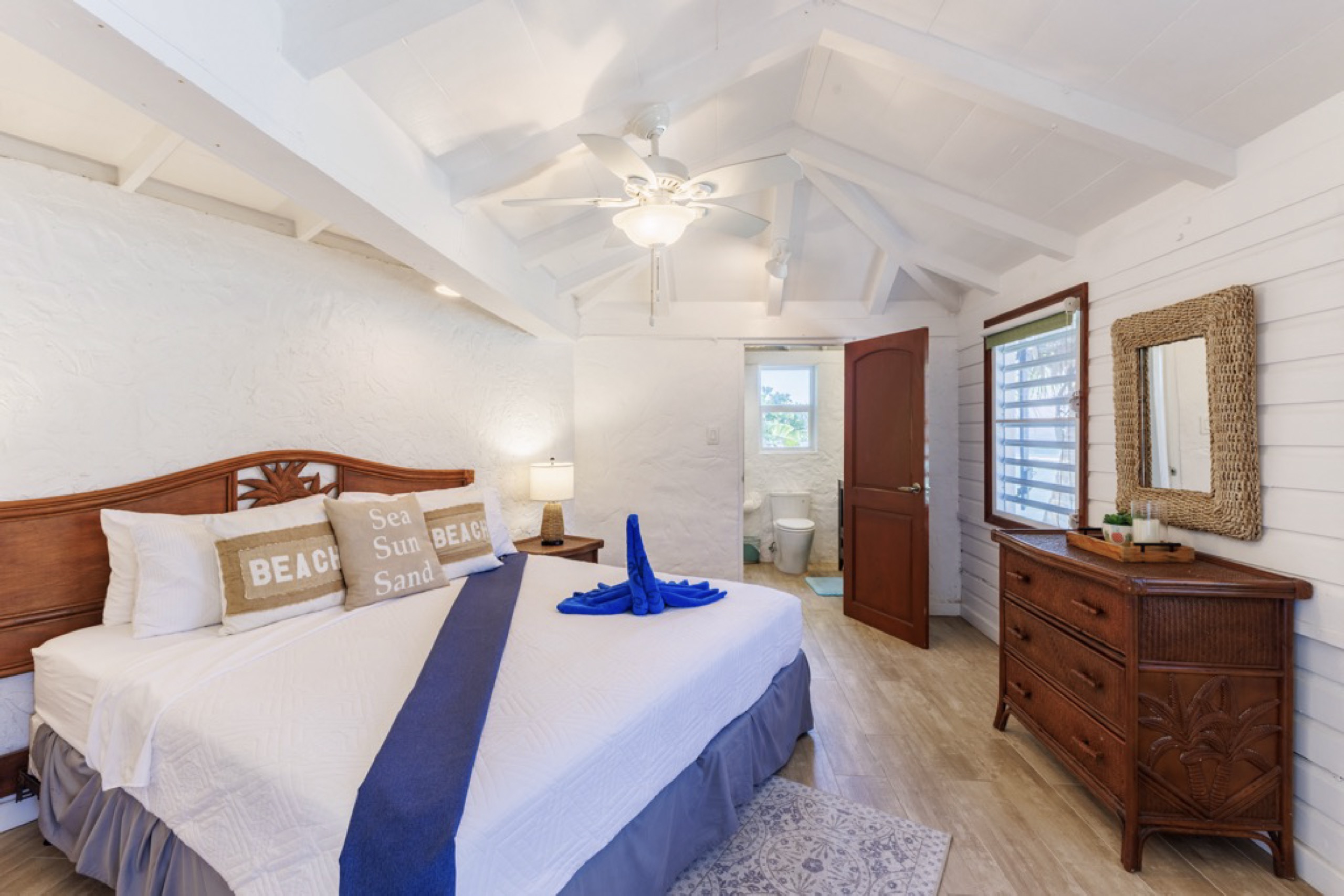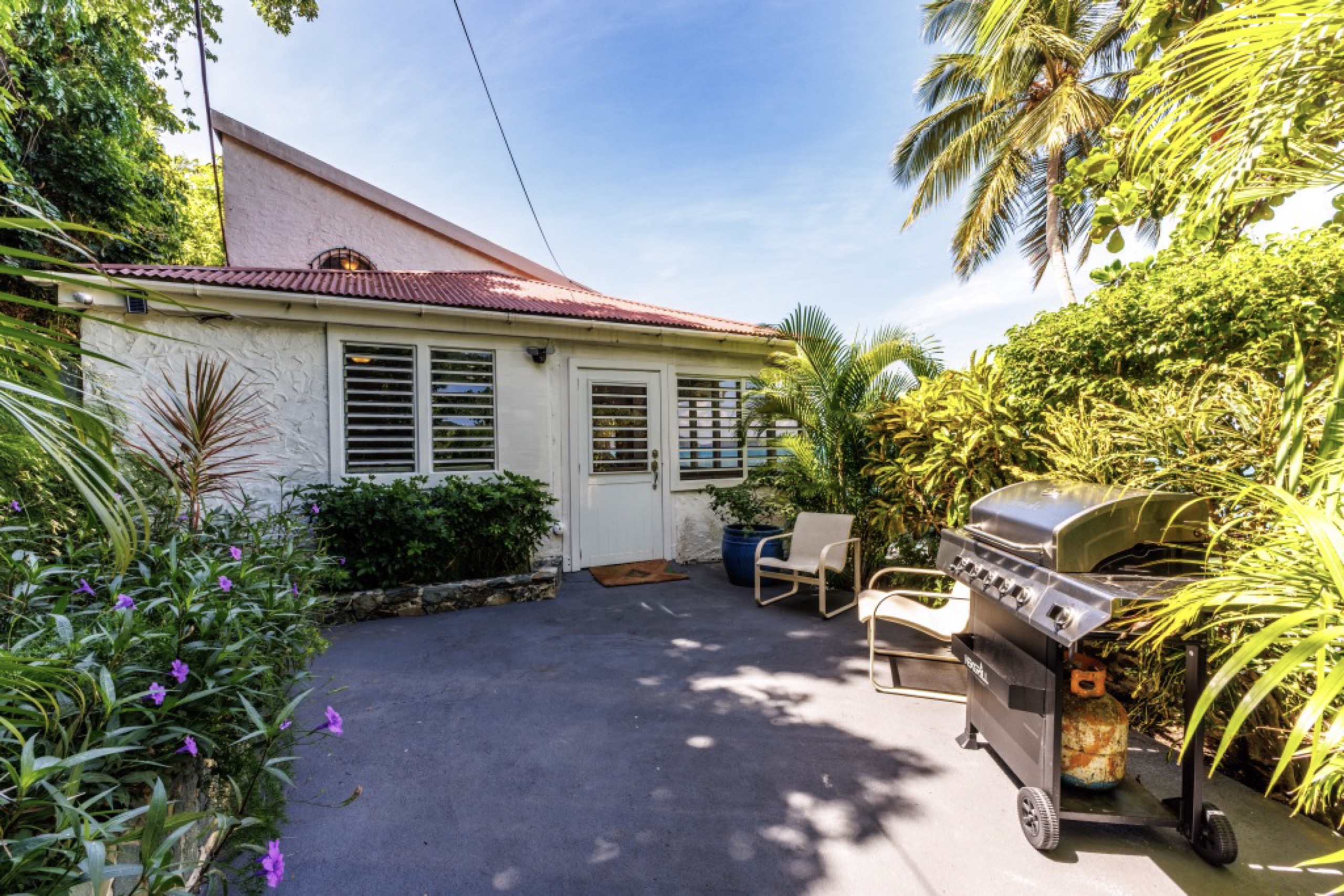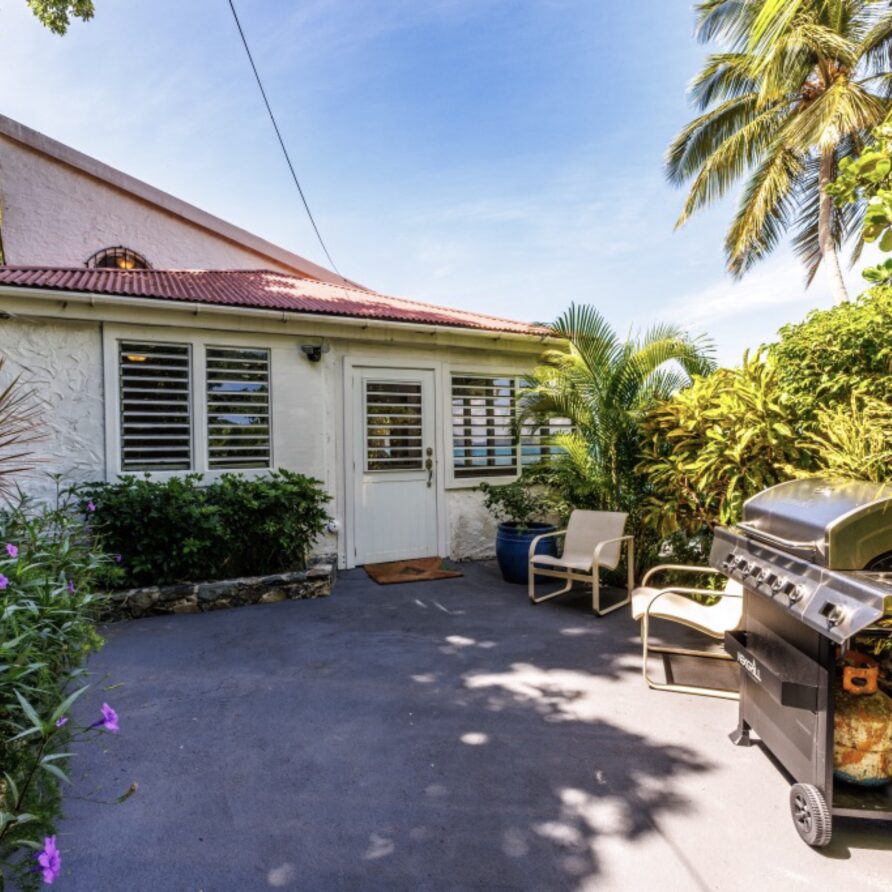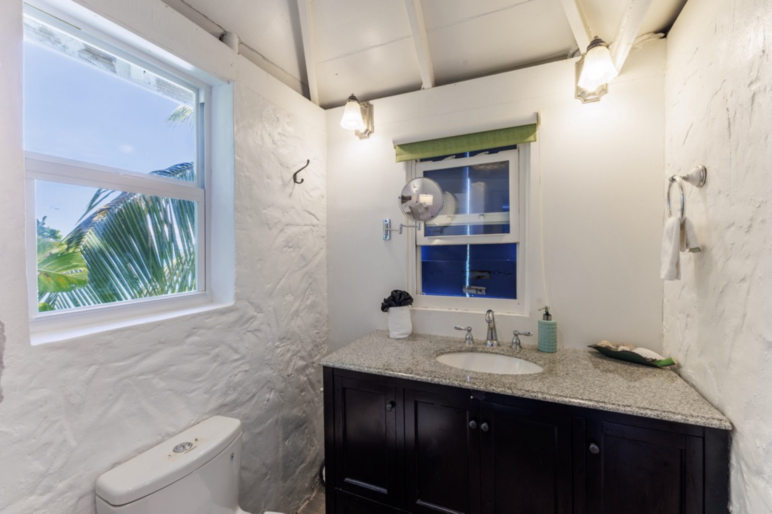 The outside seating area is right on the bay and has loungers, a picnic table and a grill for dining al fresco. Solar lights surround the seating area to provide illumination in the evenings. You may access the beach by a few easy steps from the villa.
