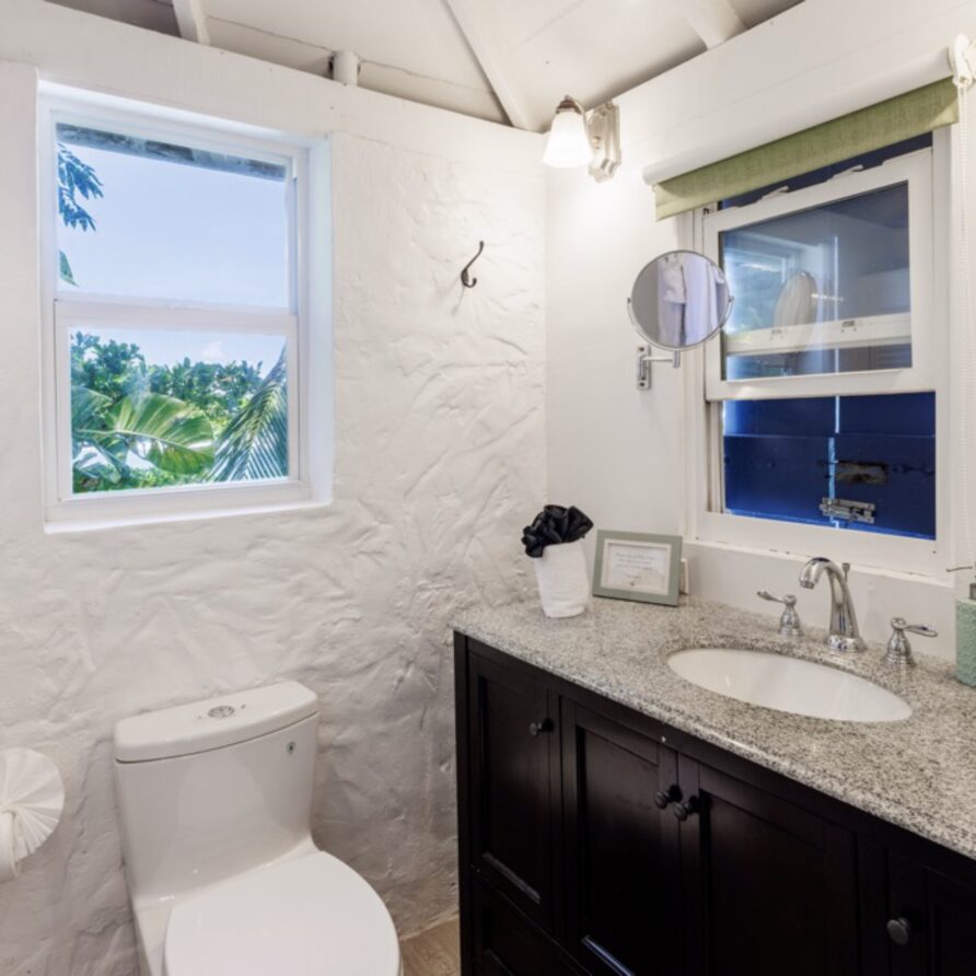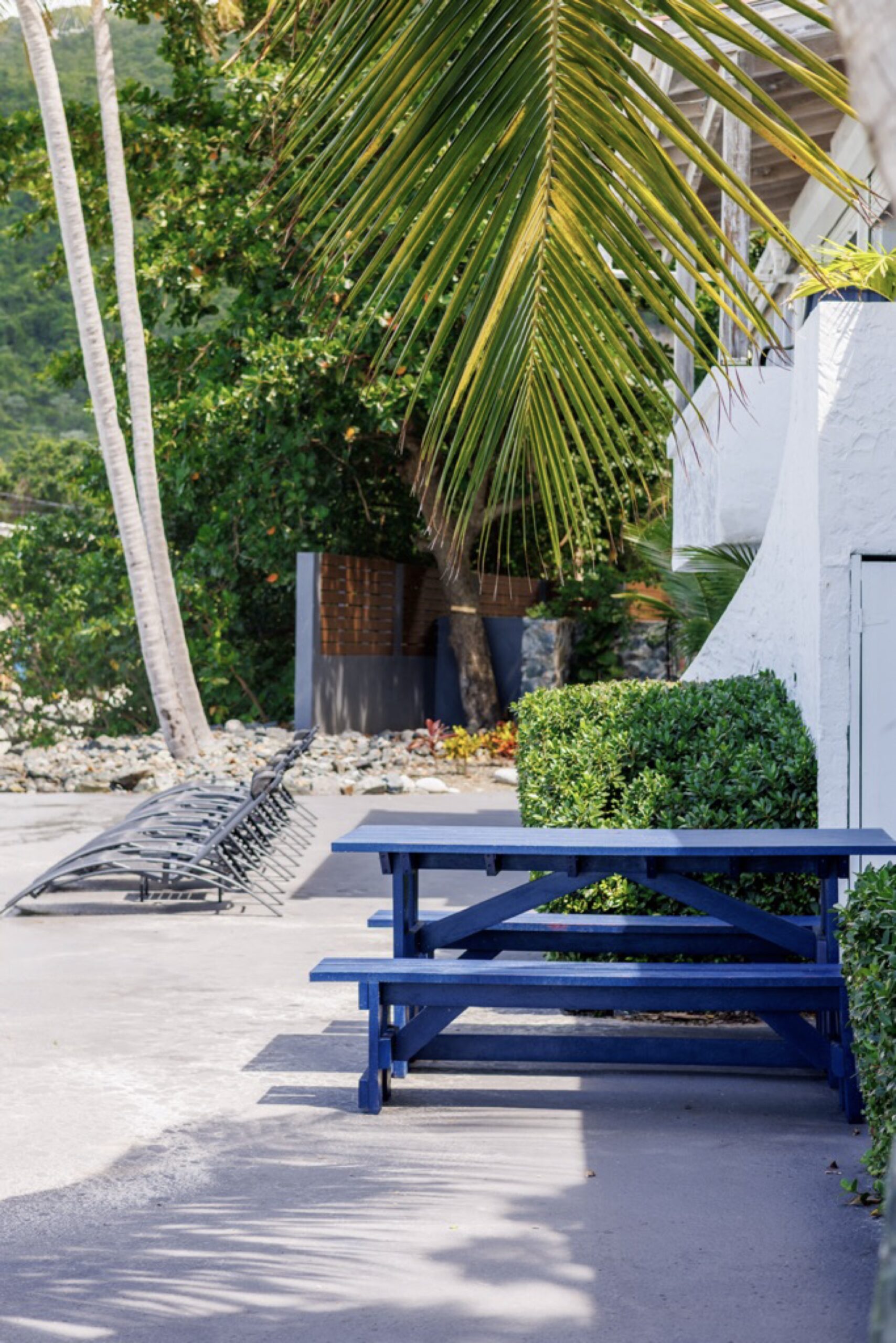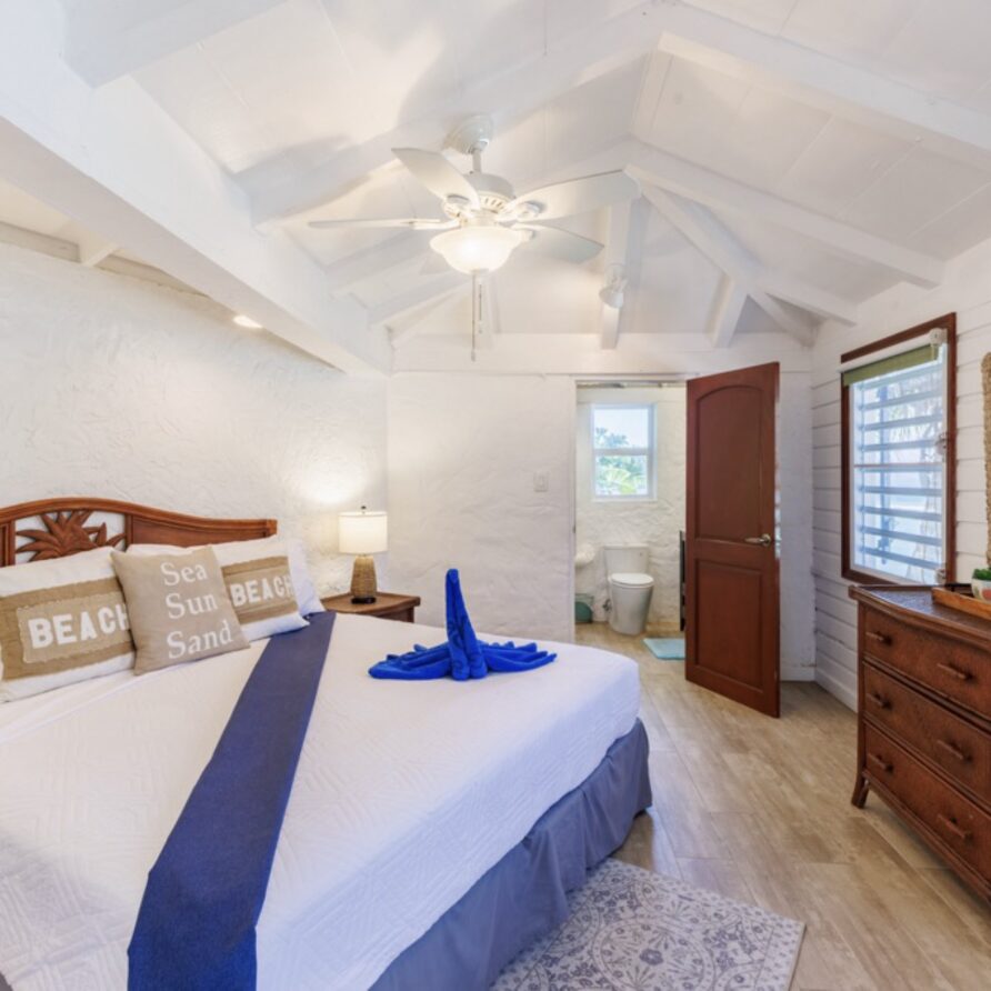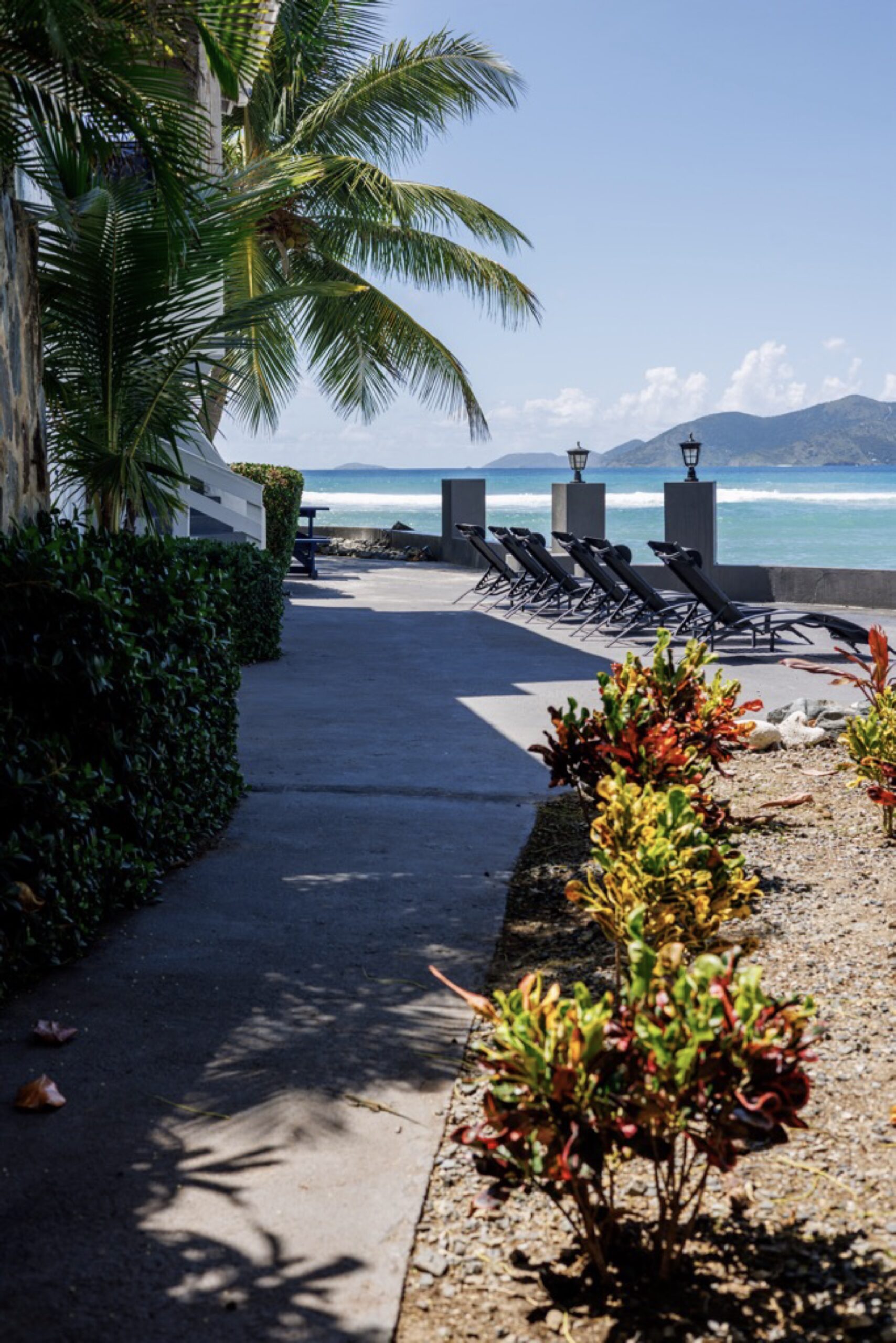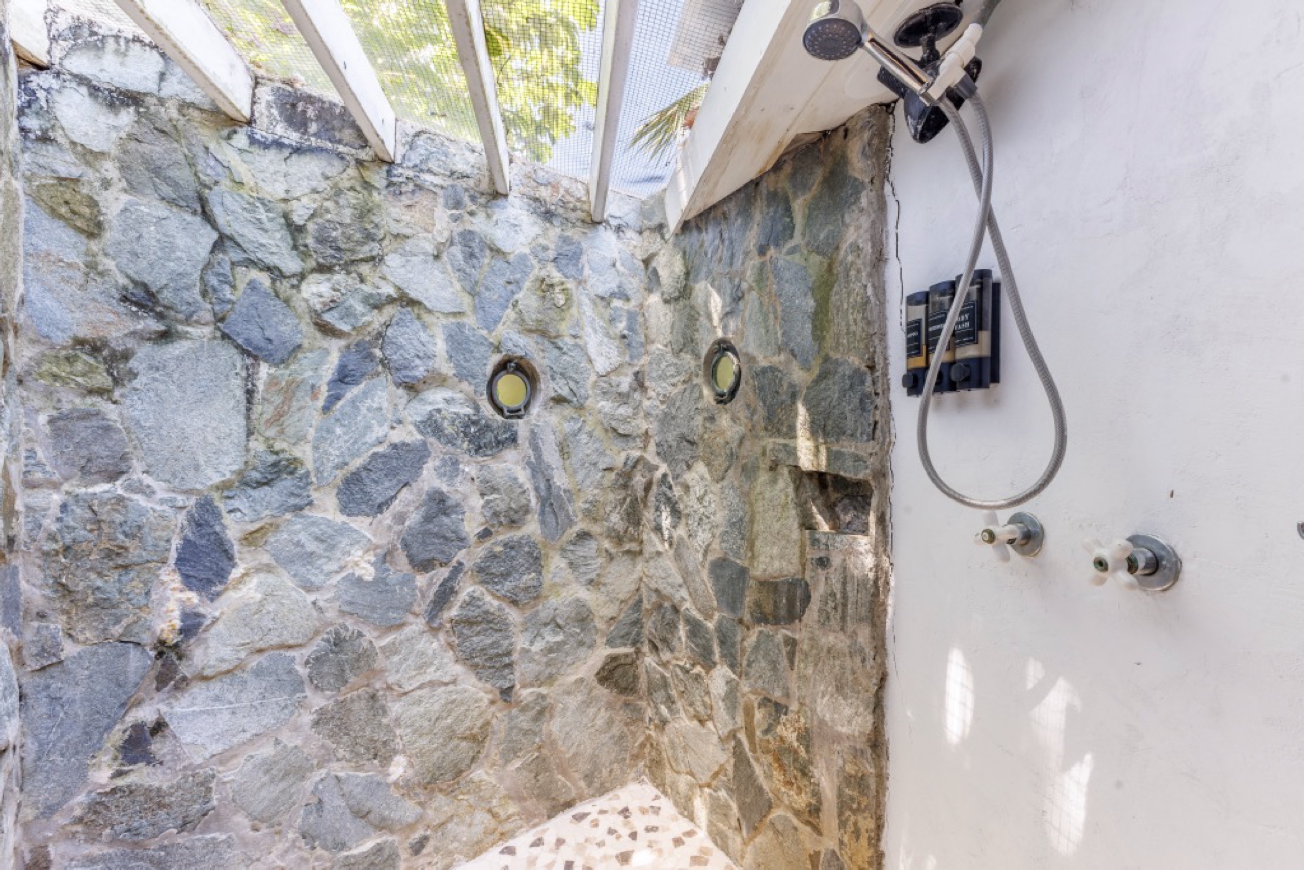 The outside seating area is right on the bay and has loungers, a picnic table and a grill for dining al fresco. Solar lights surround the seating area to provide illumination in the evenings. You may access the beach by a few easy steps from the villa.