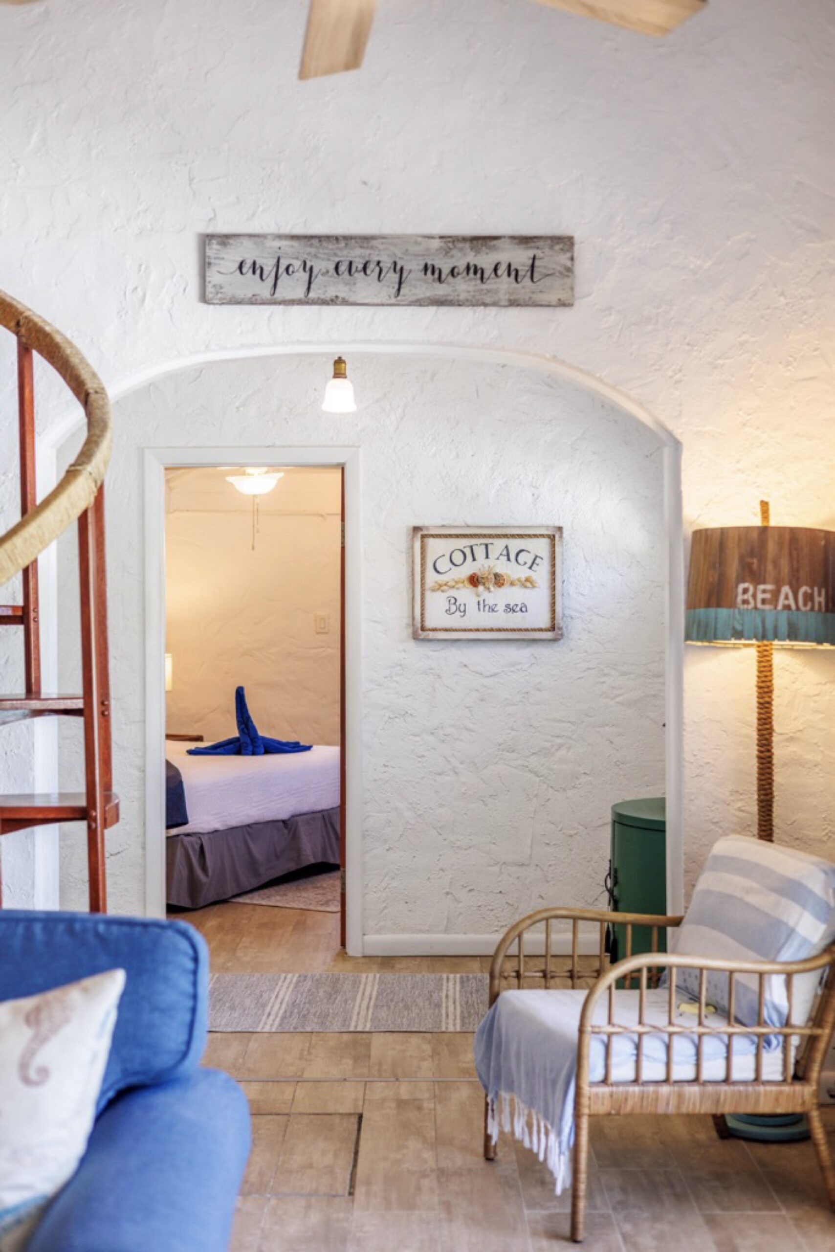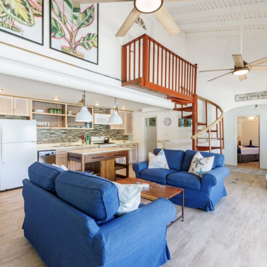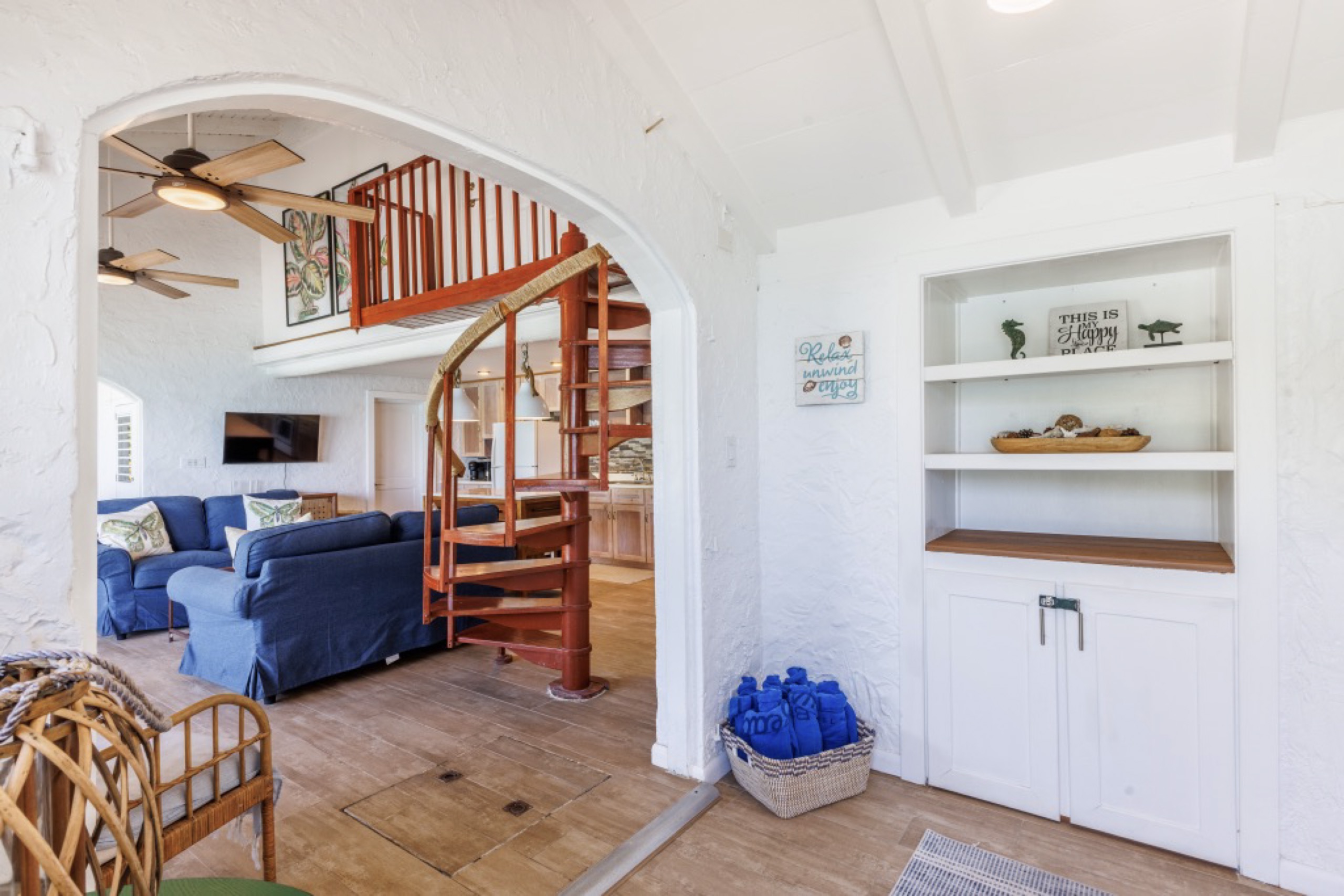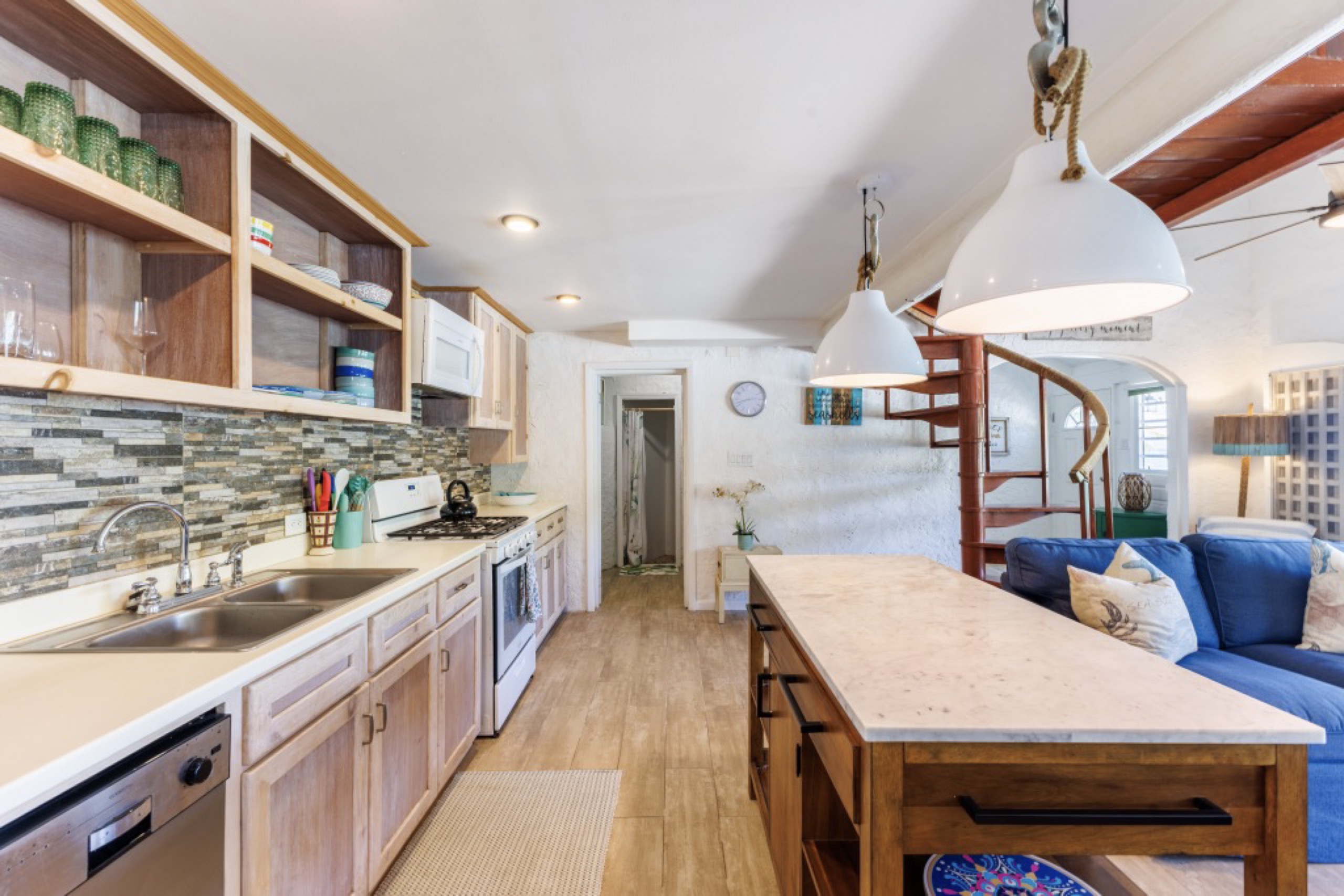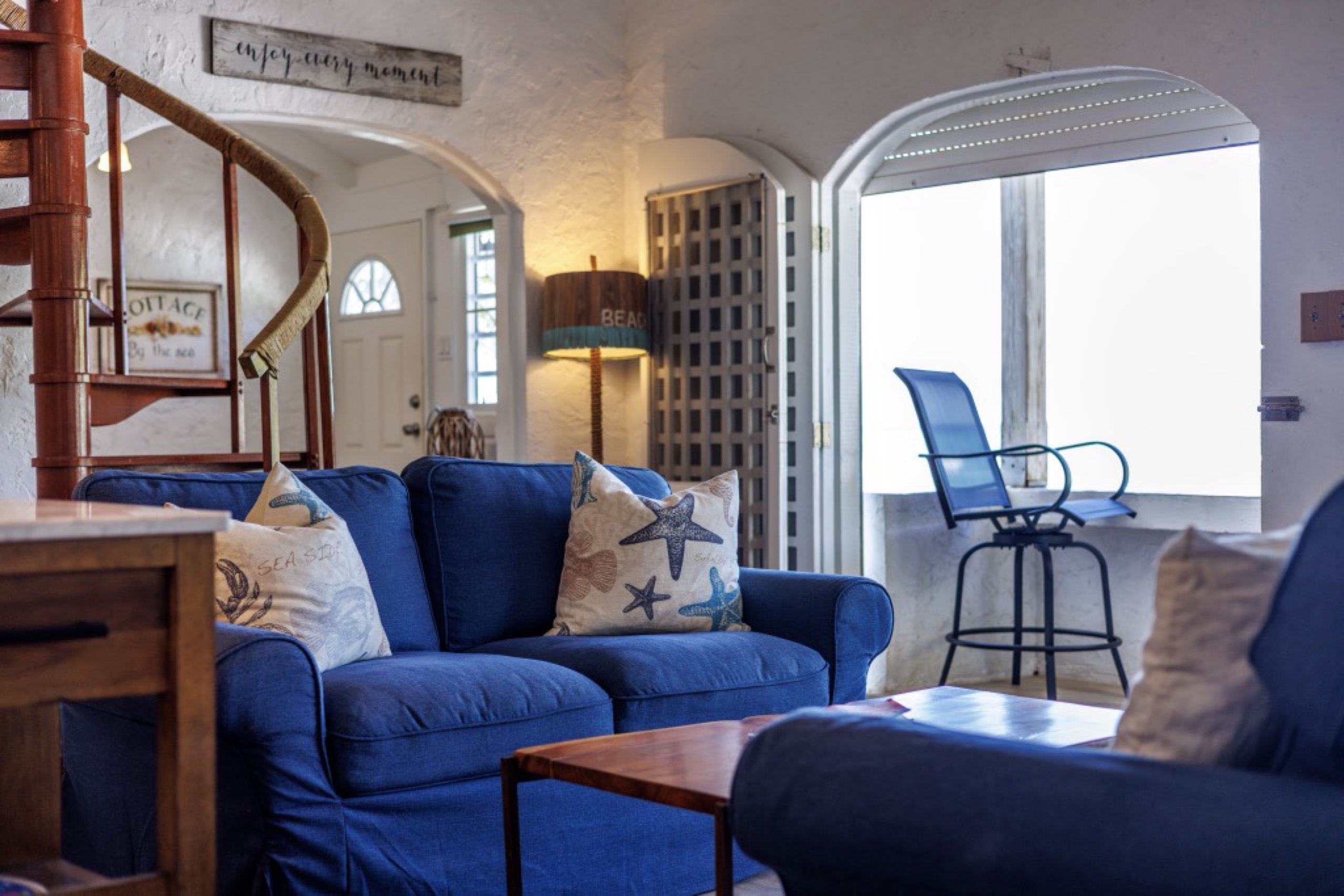 The outside seating area is right on the bay and has loungers, a picnic table and a grill for dining al fresco. Solar lights surround the seating area to provide illumination in the evenings. You may access the beach by a few easy steps from the villa.