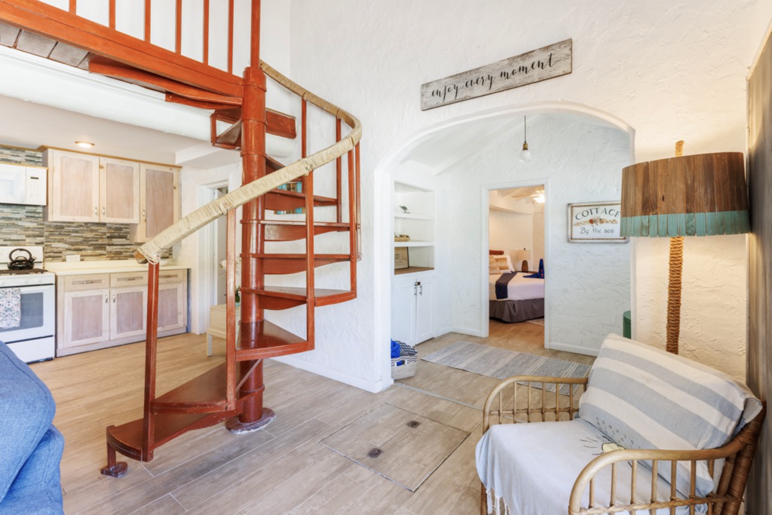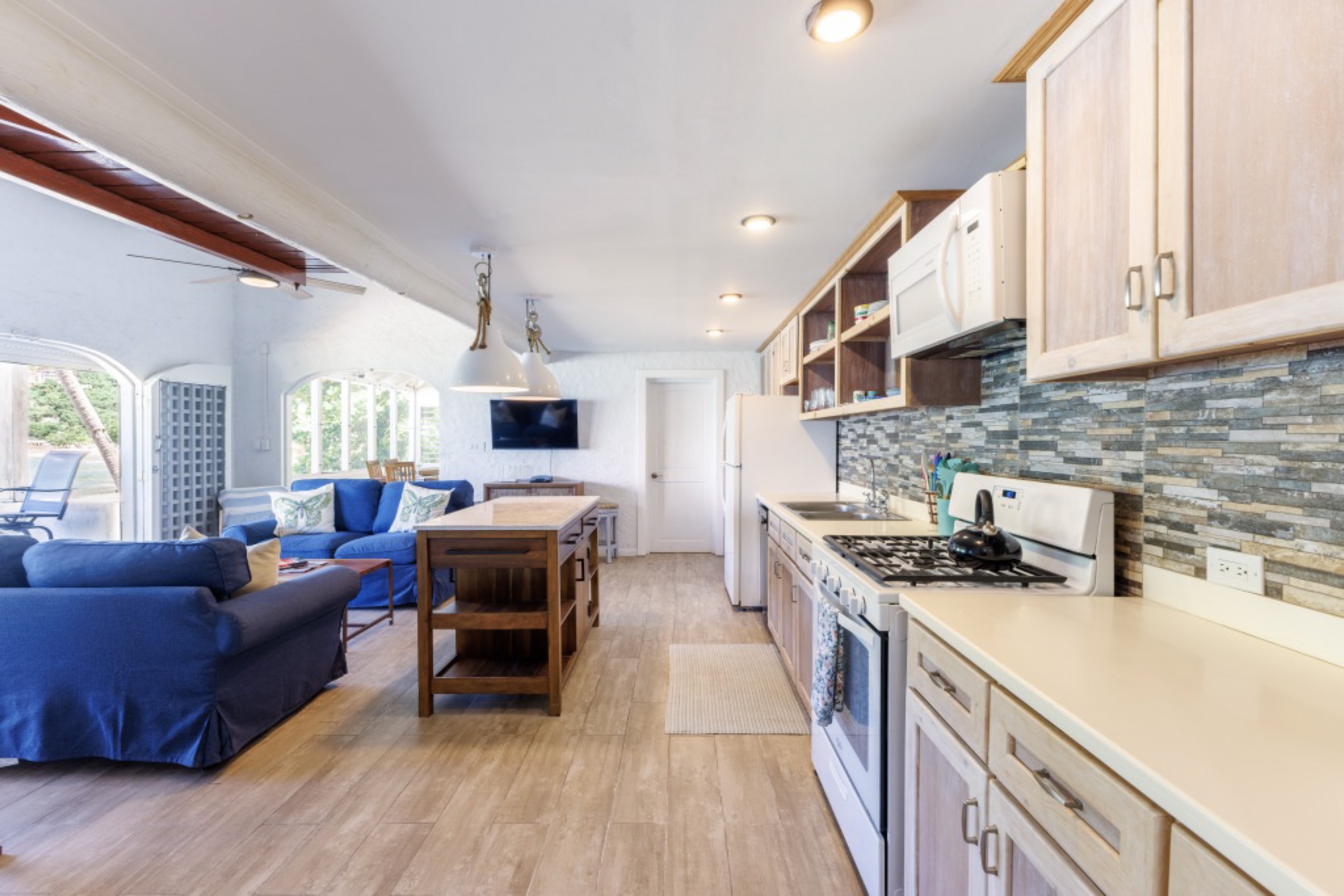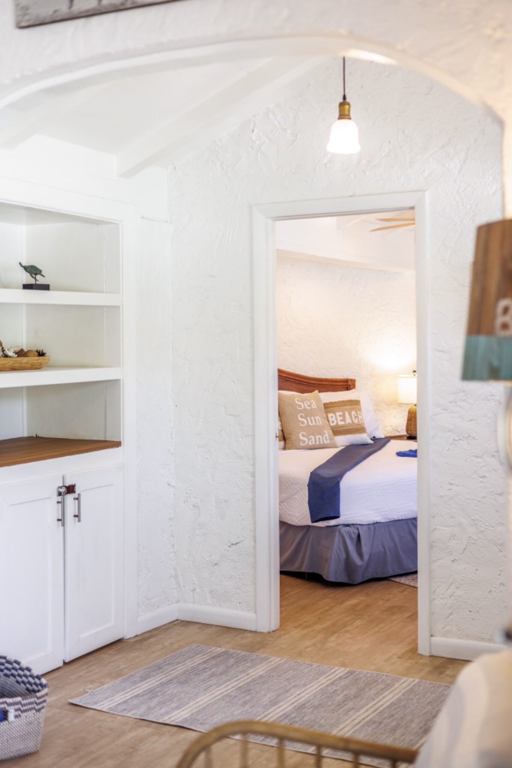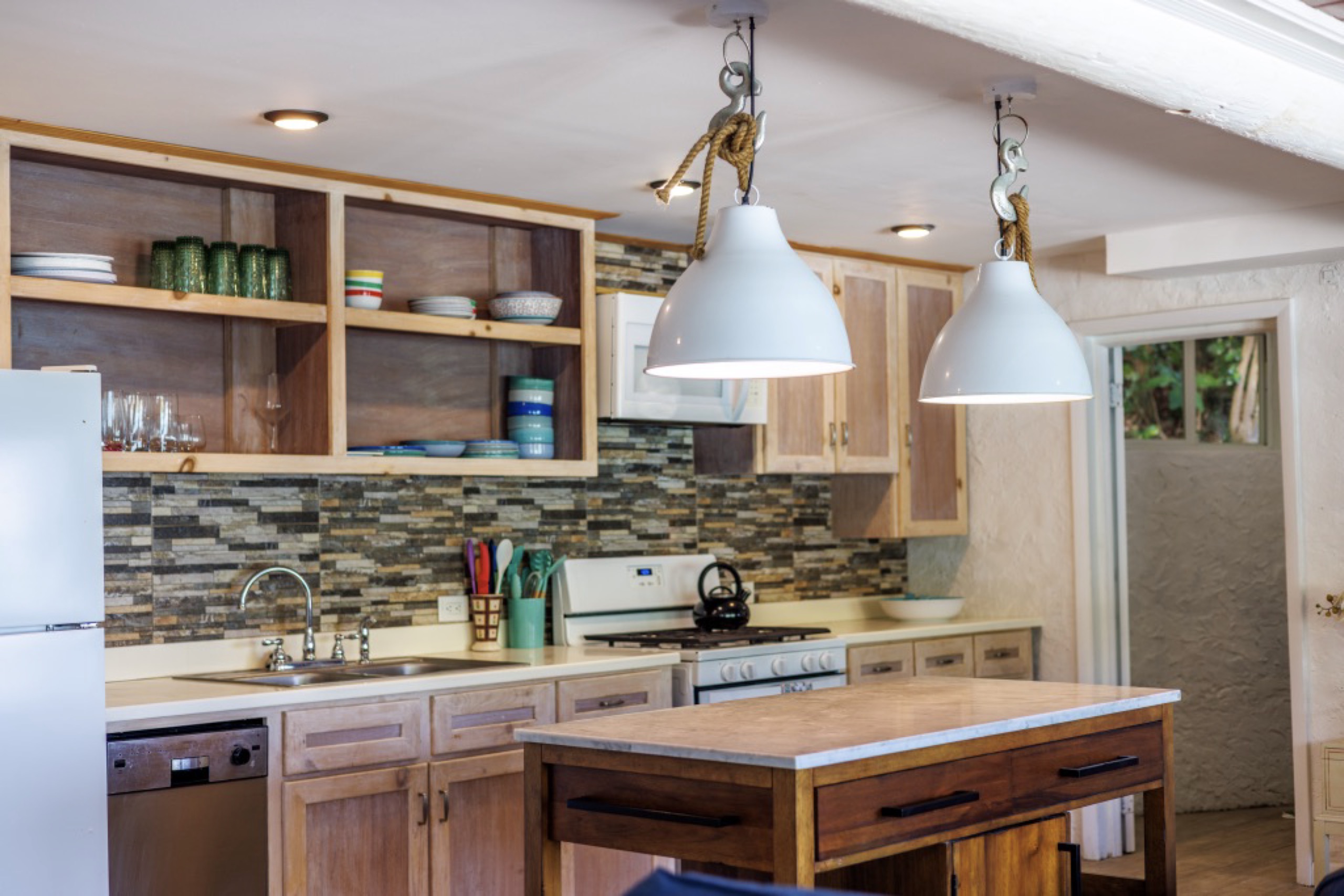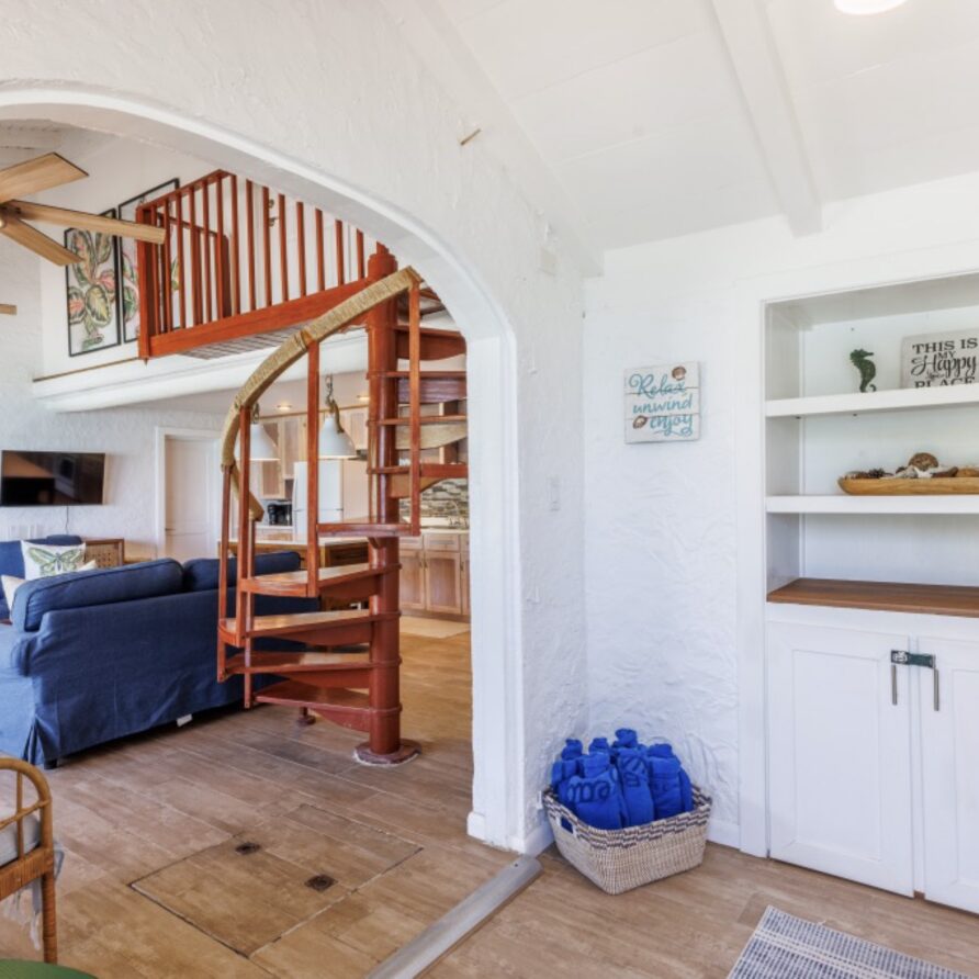 The outside seating area is right on the bay and has loungers, a picnic table and a grill for dining al fresco. Solar lights surround the seating area to provide illumination in the evenings. You may access the beach by a few easy steps from the villa.