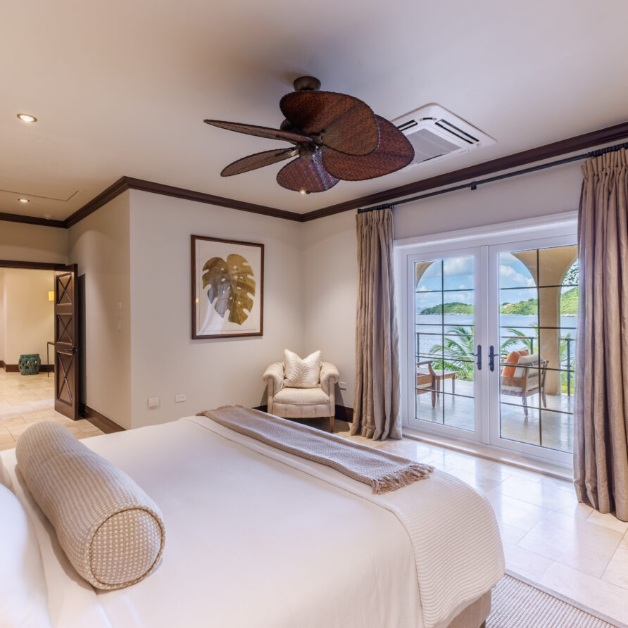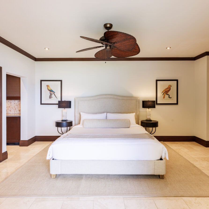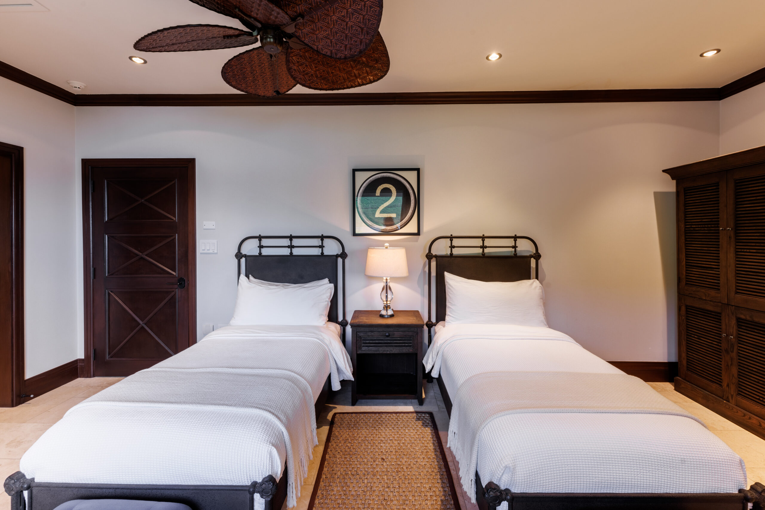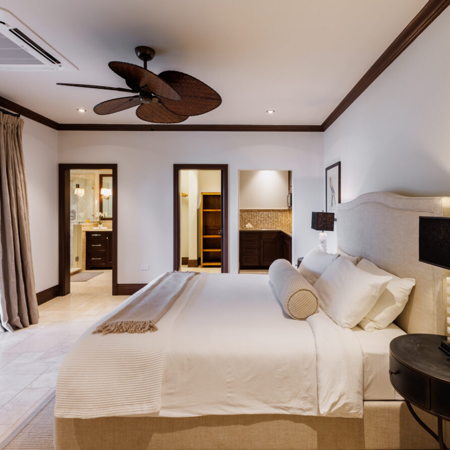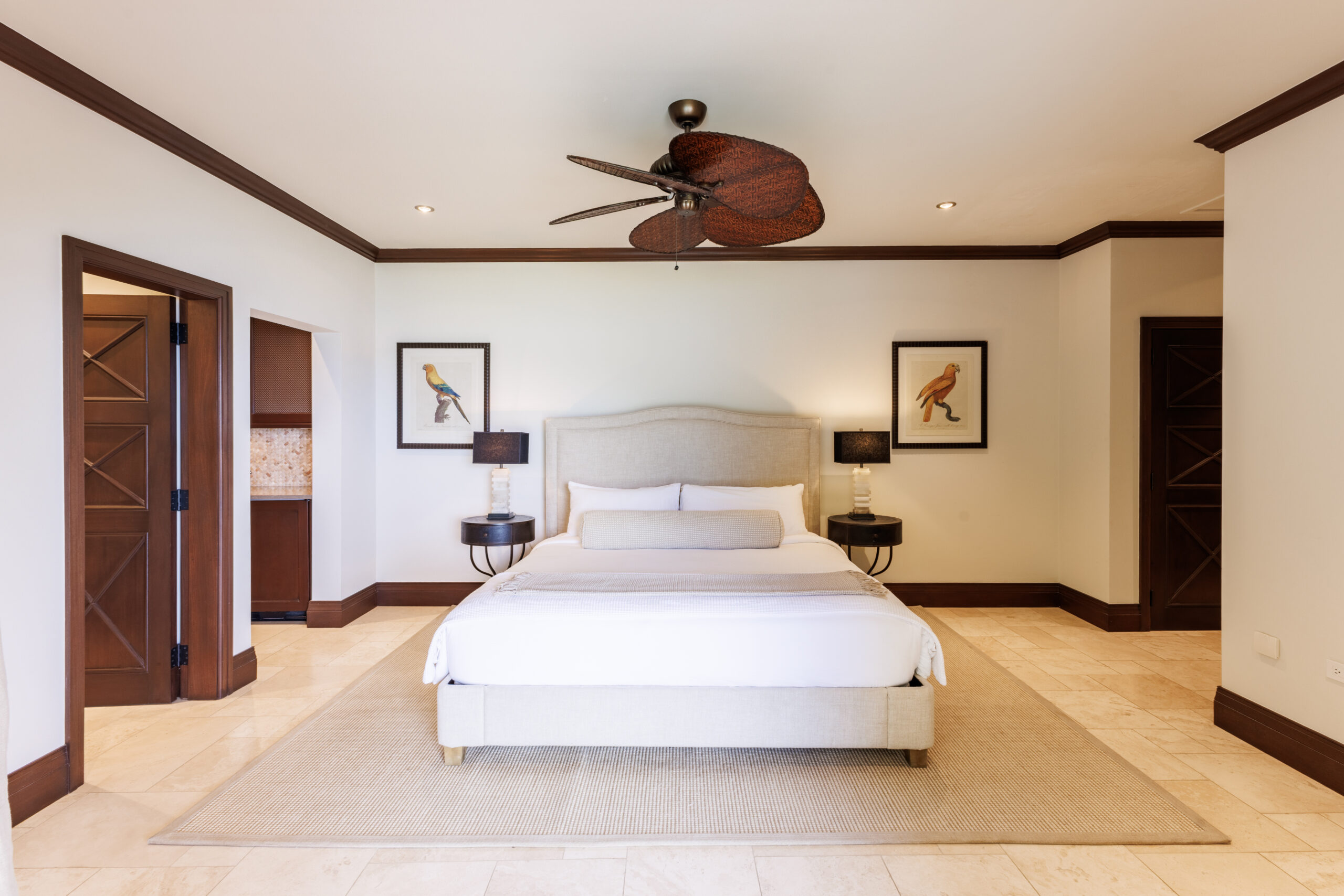The entry level offers a full service kitchen with Wolf appliances, and enough fridge and freezer space to stock up for a full week. The breakfast bar opens up in to a spacious living room, with a large smart TV and an adjoining office and guest bathroom. A fully covered deck wraps across the front of the villa, and includes a dining area for eight, and a walk up bar for cocktail hour. Just off the kitchen is the master suite, with a large step out balcony, en suite bathroom with glass enclosed shower, and a walk in closet.Â