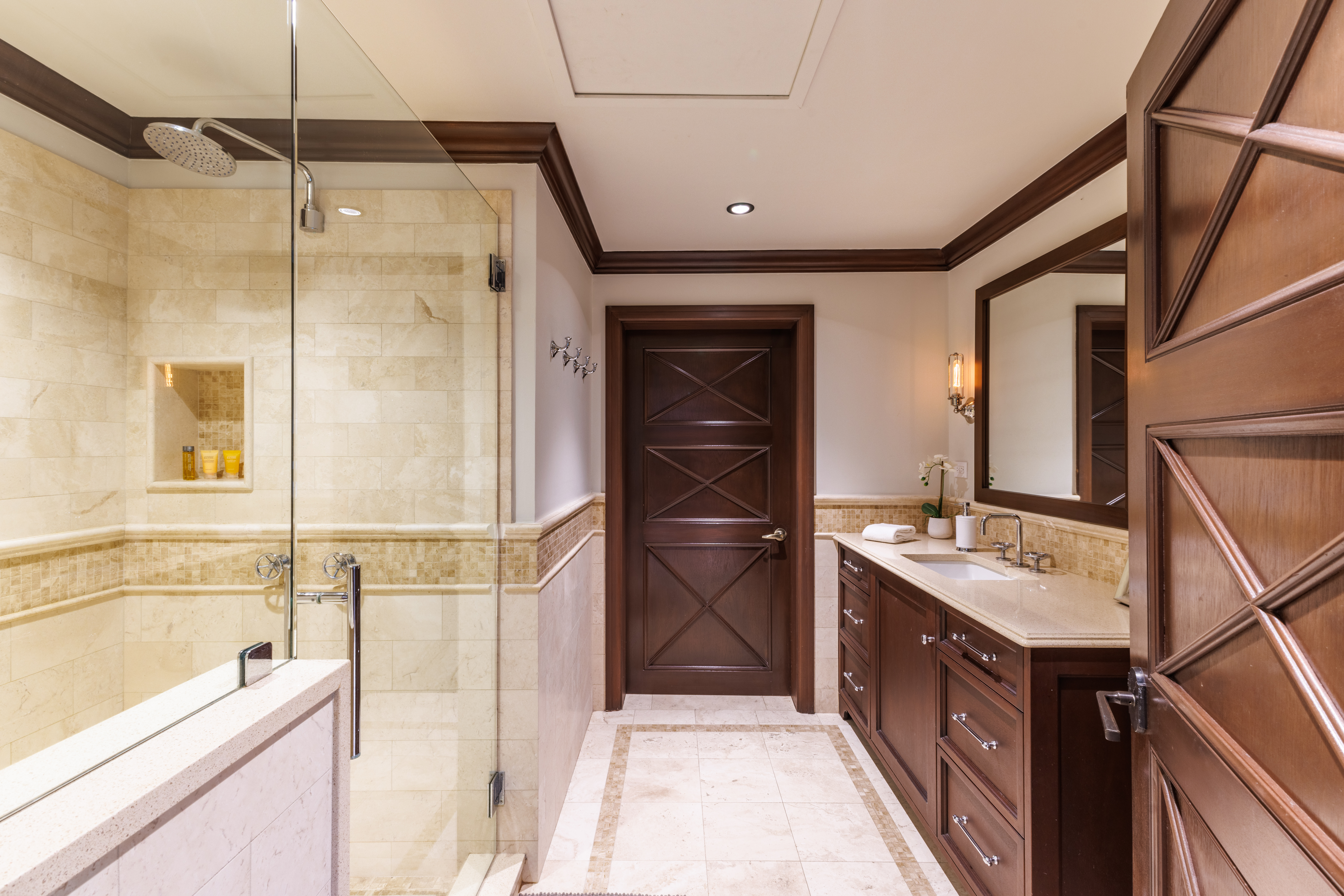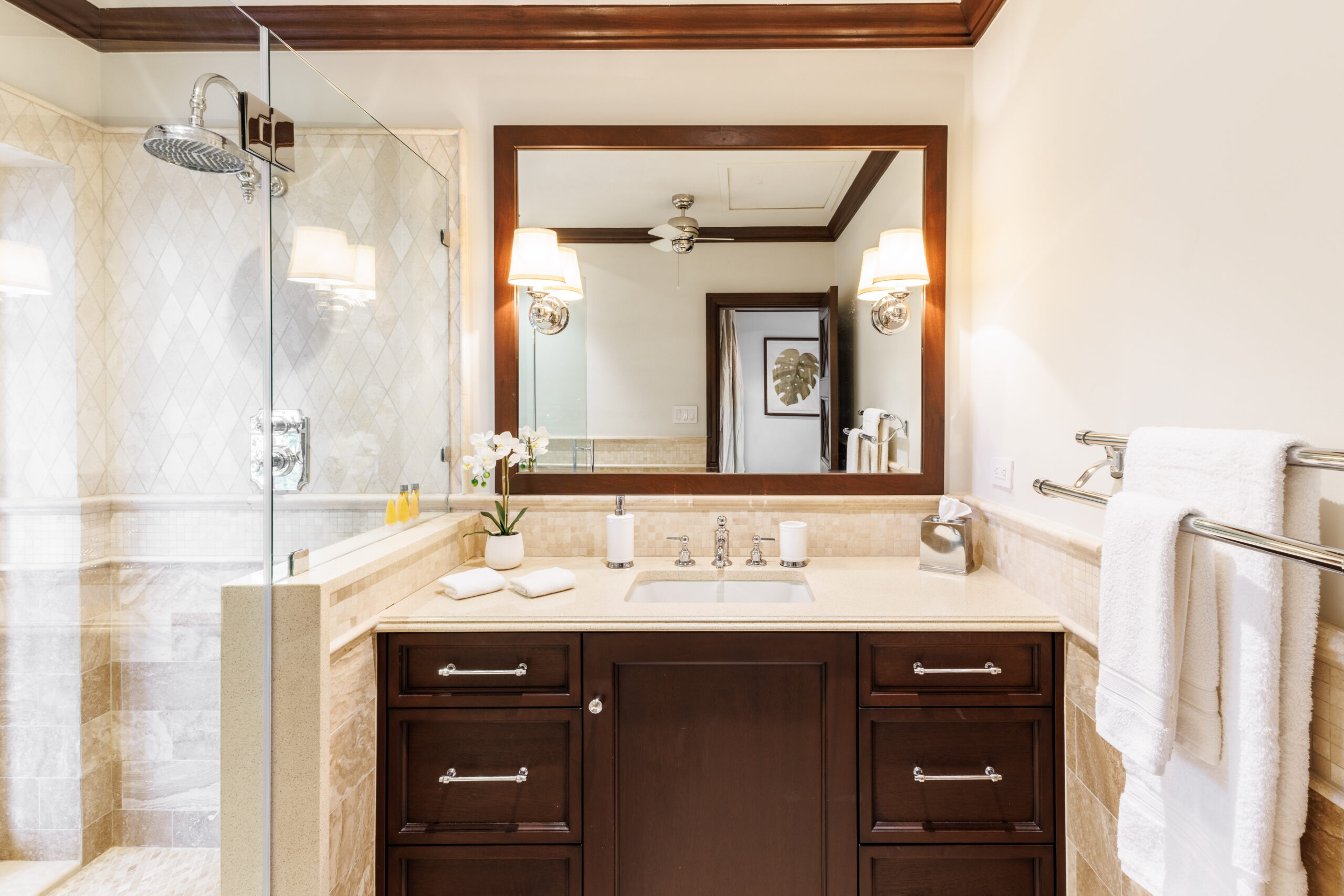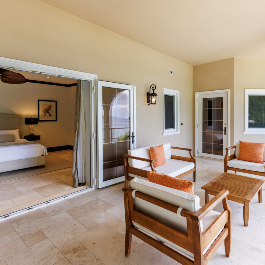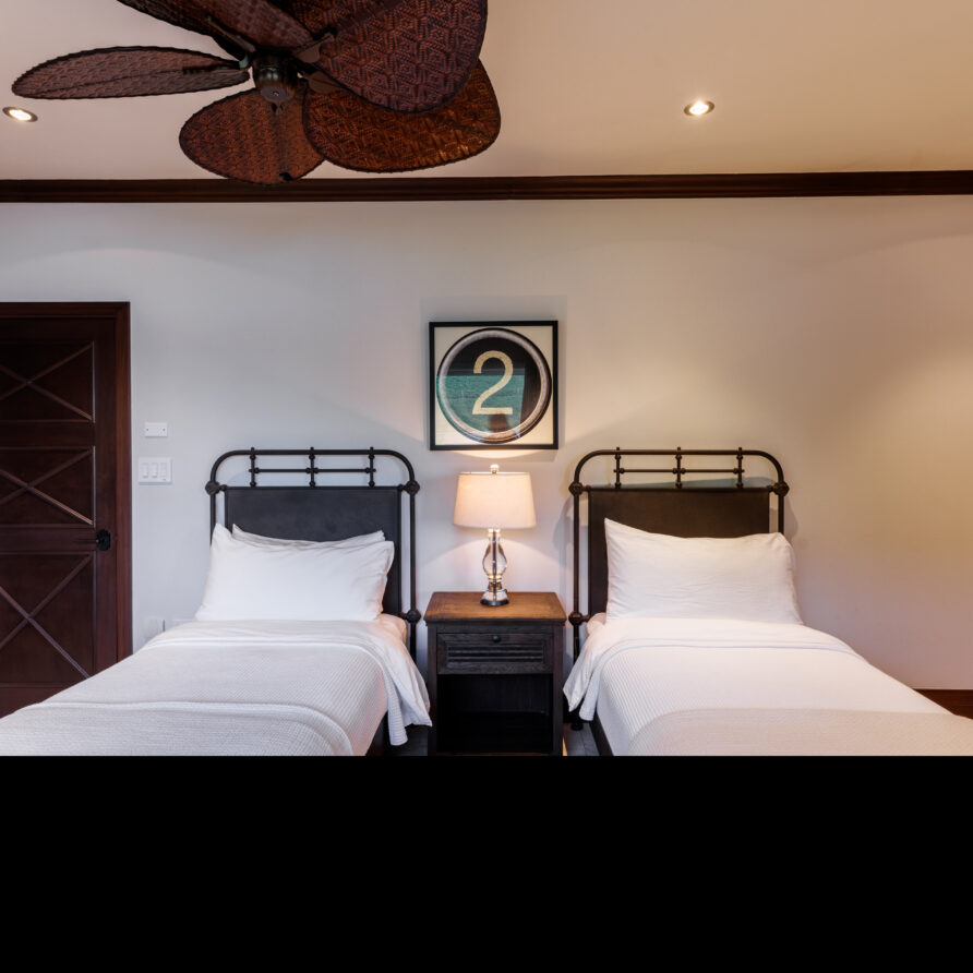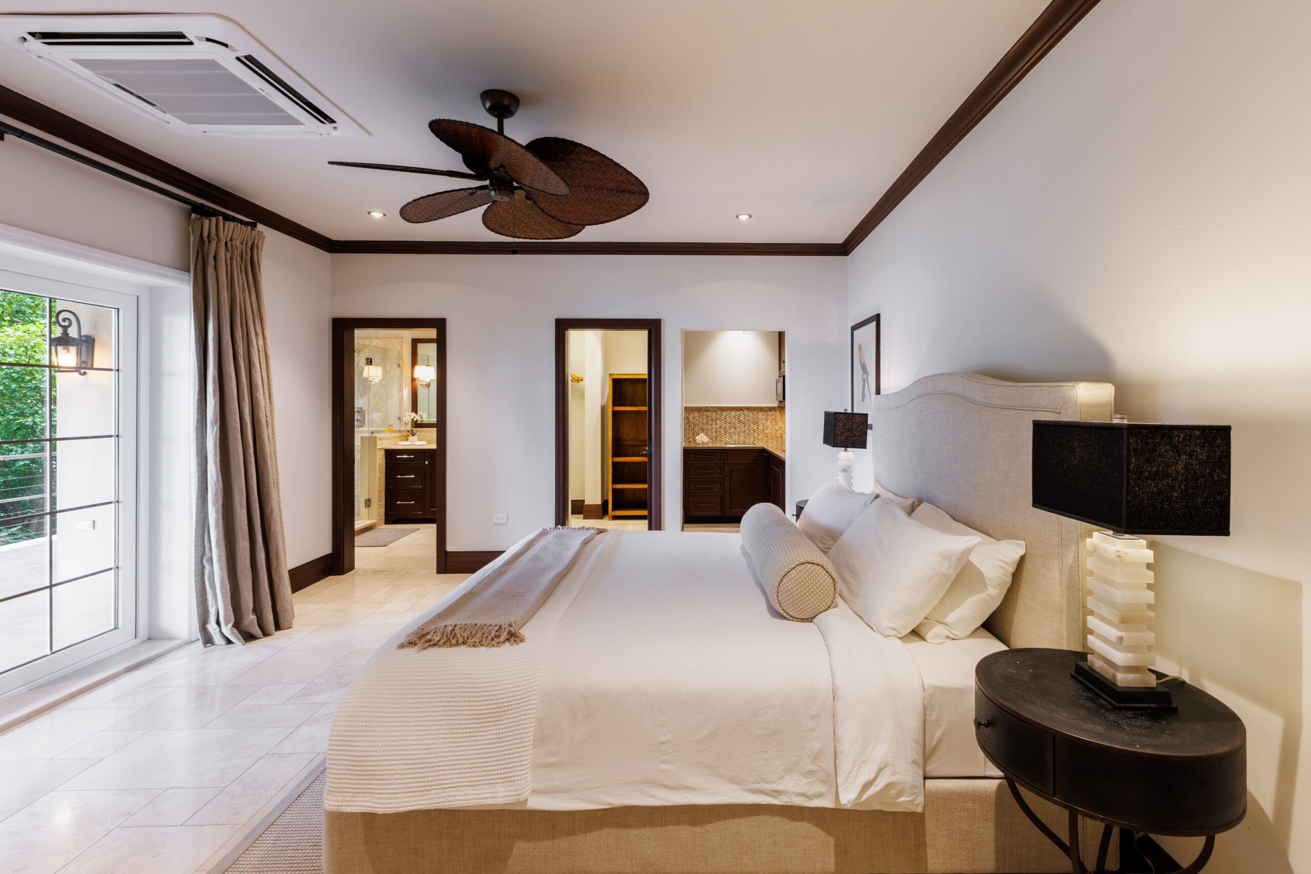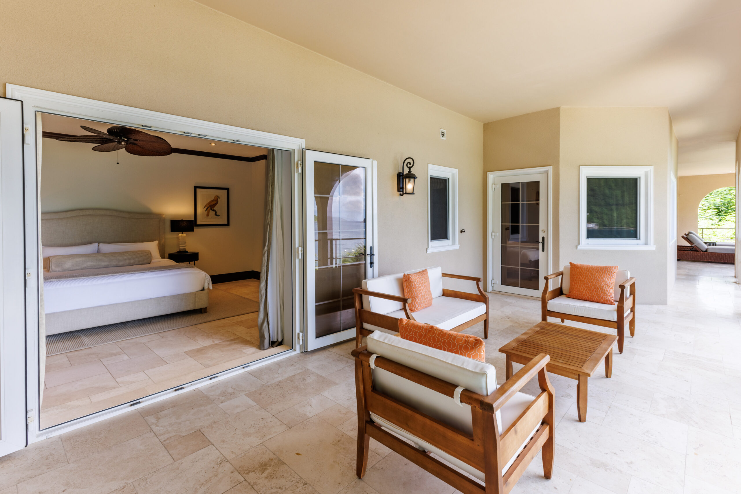 The entry level offers a full service kitchen with Wolf appliances, and enough fridge and freezer space to stock up for a full week. The breakfast bar opens up in to a spacious living room, with a large smart TV and an adjoining office and guest bathroom. A fully covered deck wraps across the front of the villa, and includes a dining area for eight, and a walk up bar for cocktail hour. Just off the kitchen is the master suite, with a large step out balcony, en suite bathroom with glass enclosed shower, and a walk in closet.Â