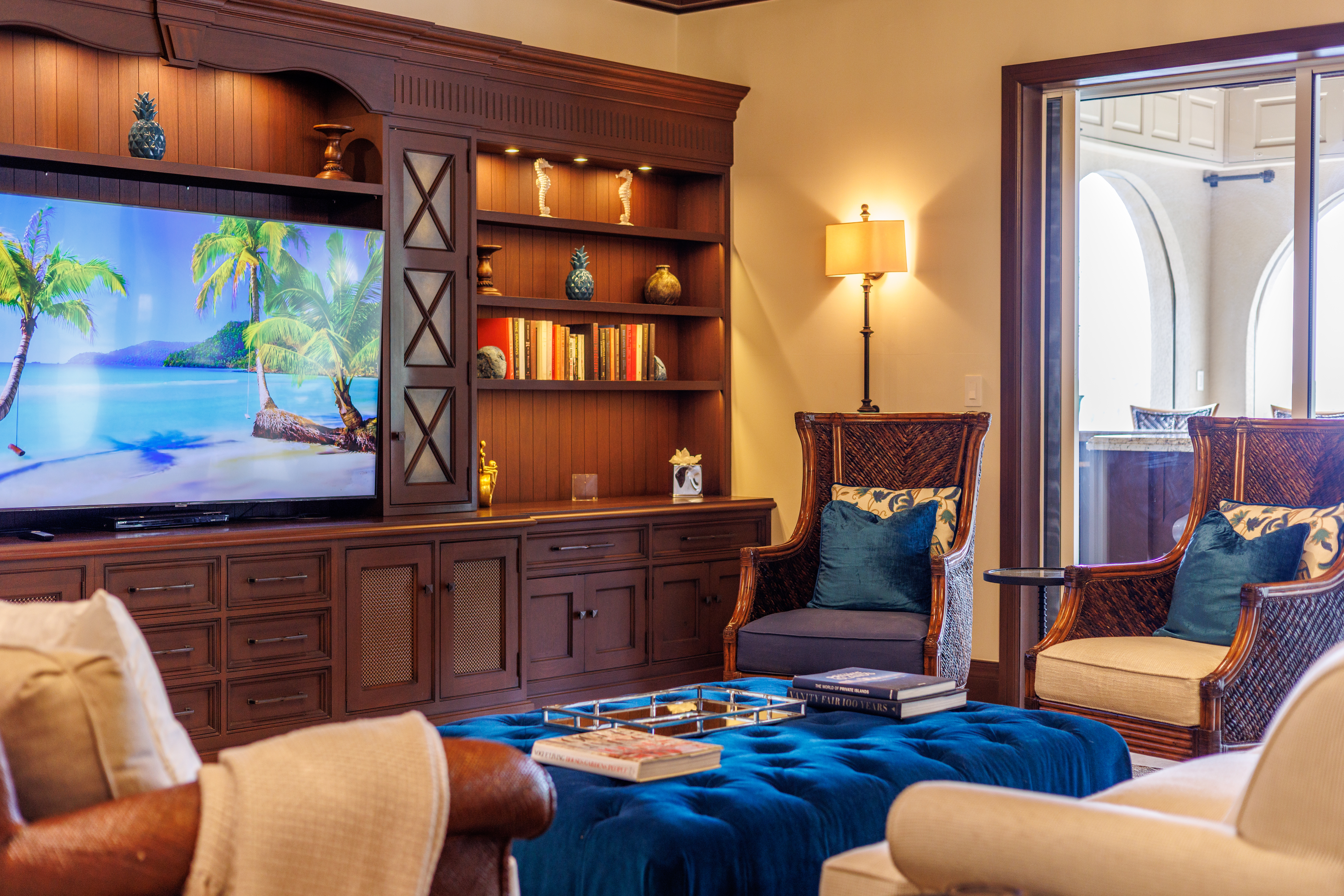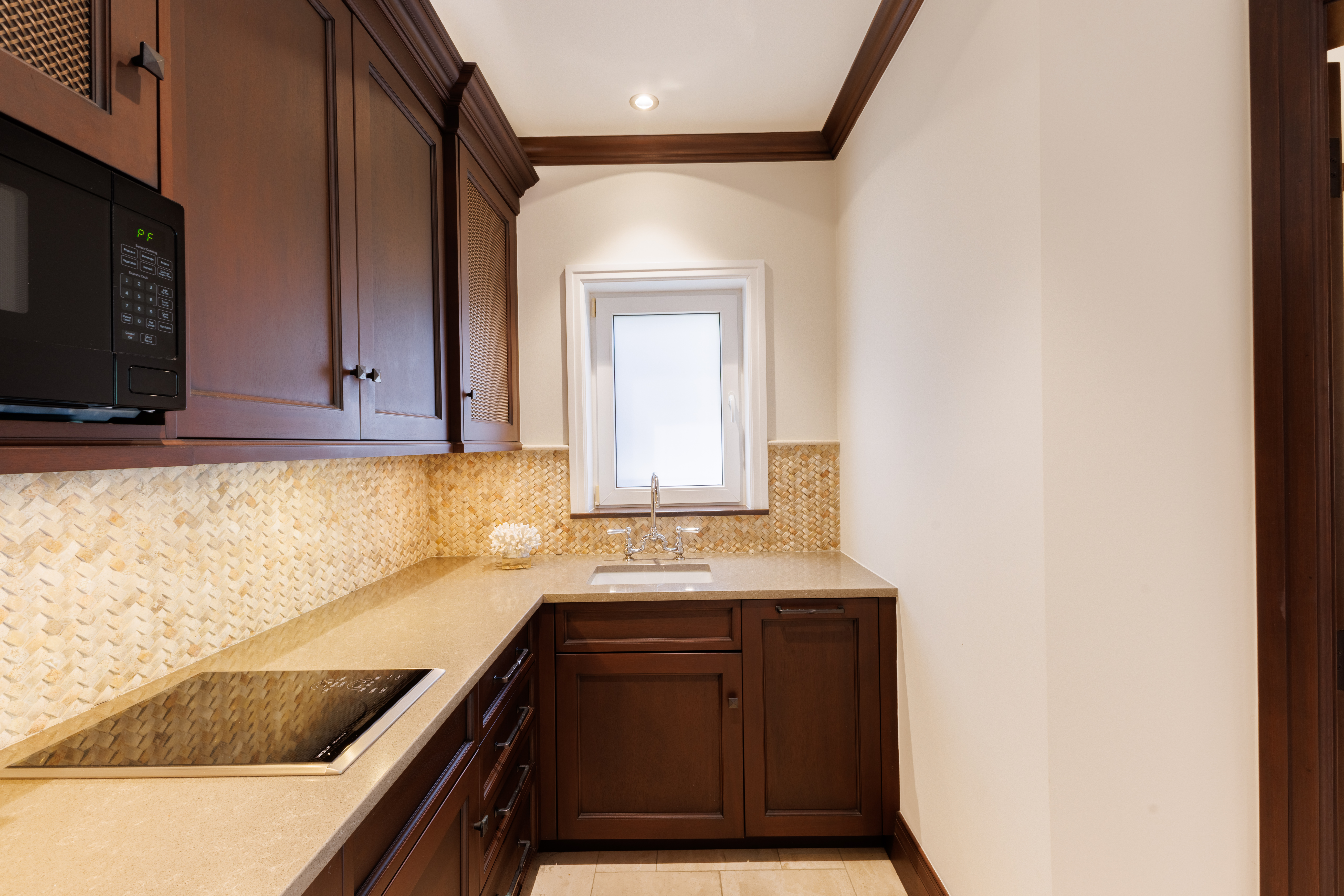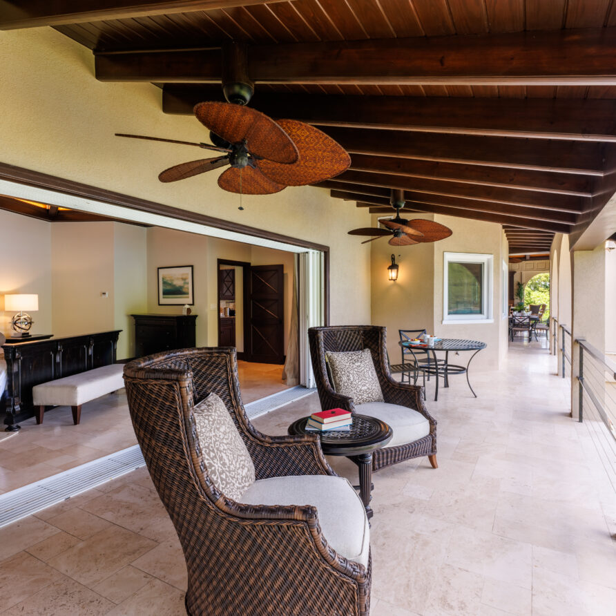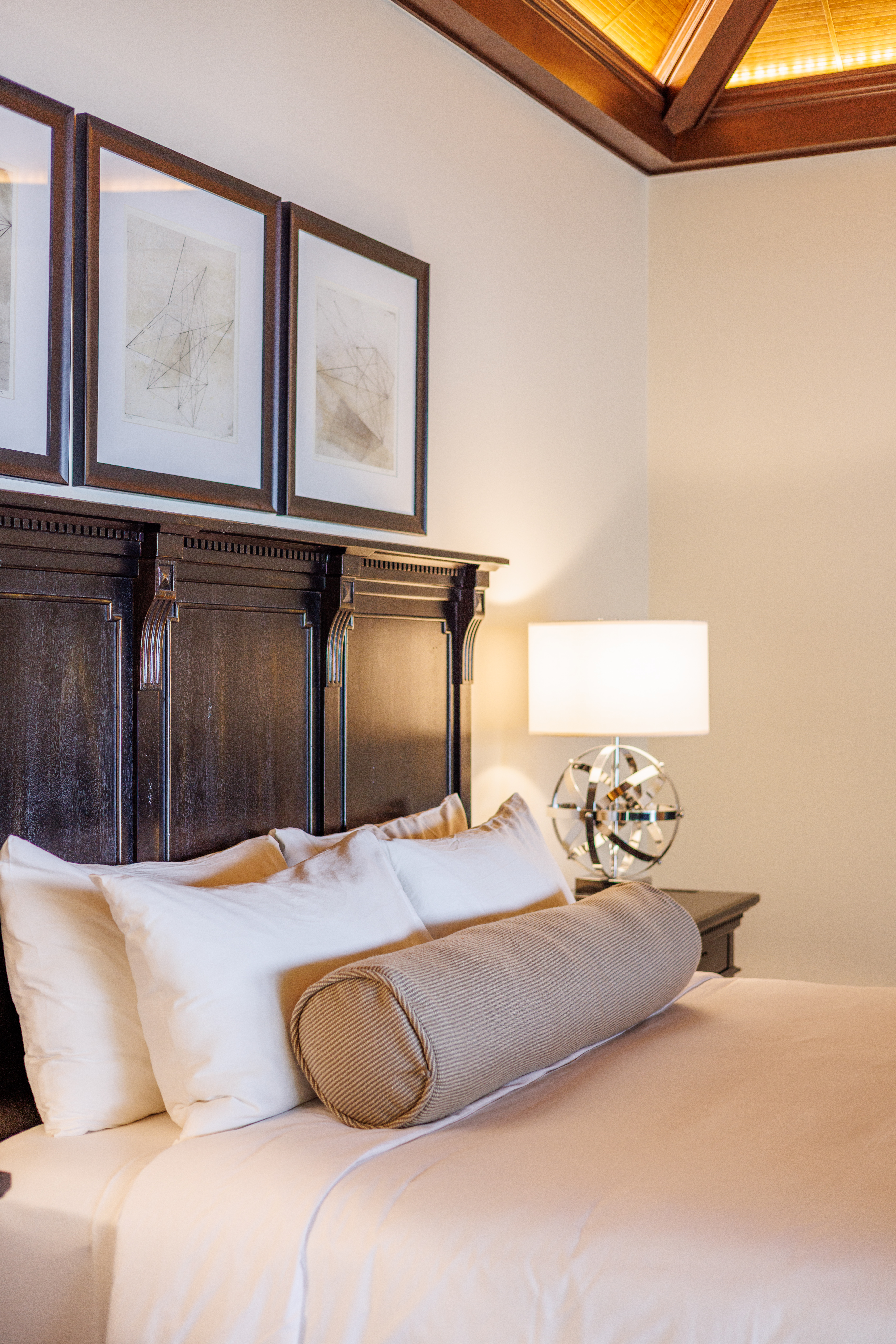 The entry level offers a full service kitchen with Wolf appliances, and enough fridge and freezer space to stock up for a full week. The breakfast bar opens up in to a spacious living room, with a large smart TV and an adjoining office and guest bathroom. A fully covered deck wraps across the front of the villa, and includes a dining area for eight, and a walk up bar for cocktail hour. Just off the kitchen is the master suite, with a large step out balcony, en suite bathroom with glass enclosed shower, and a walk in closet.Â
