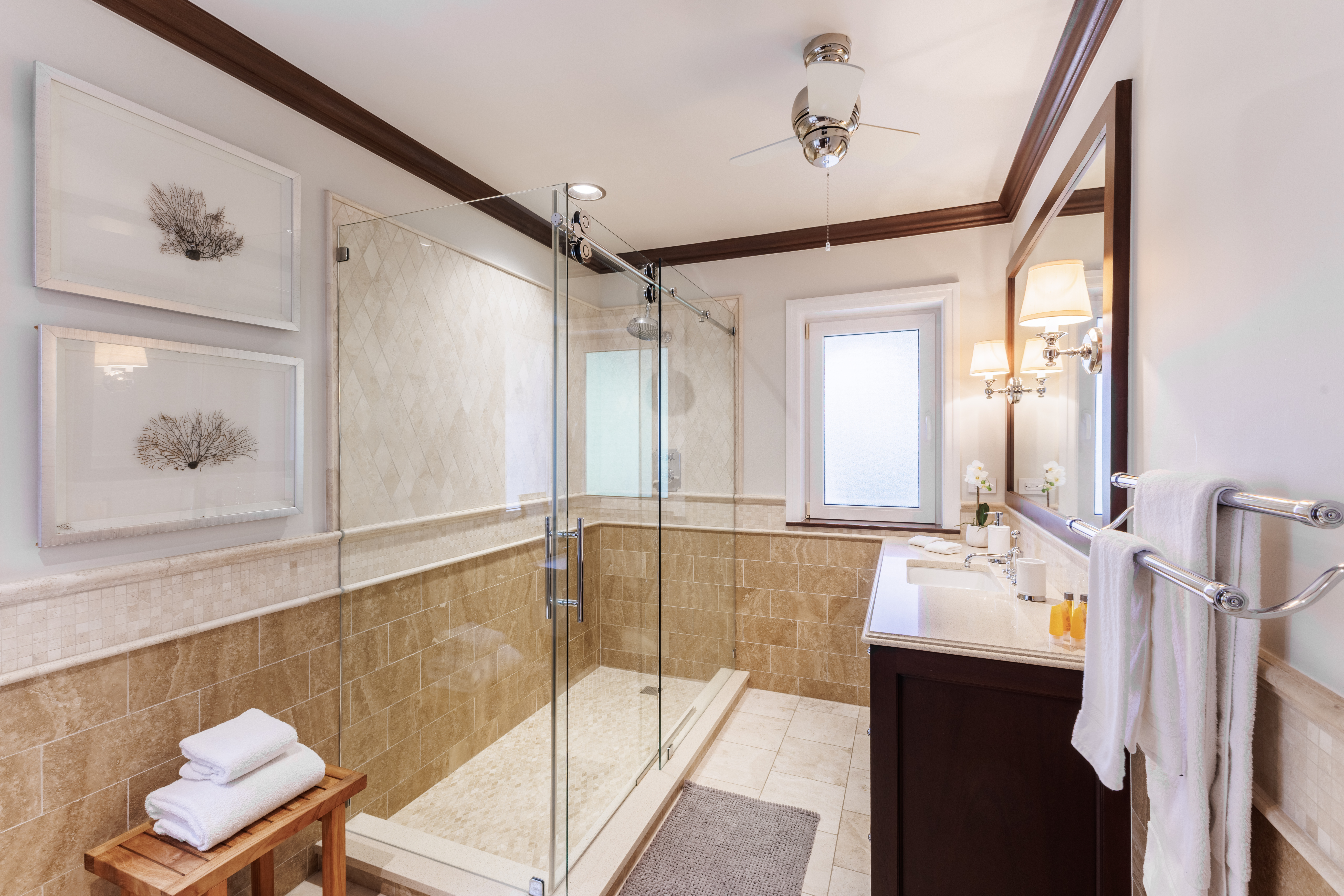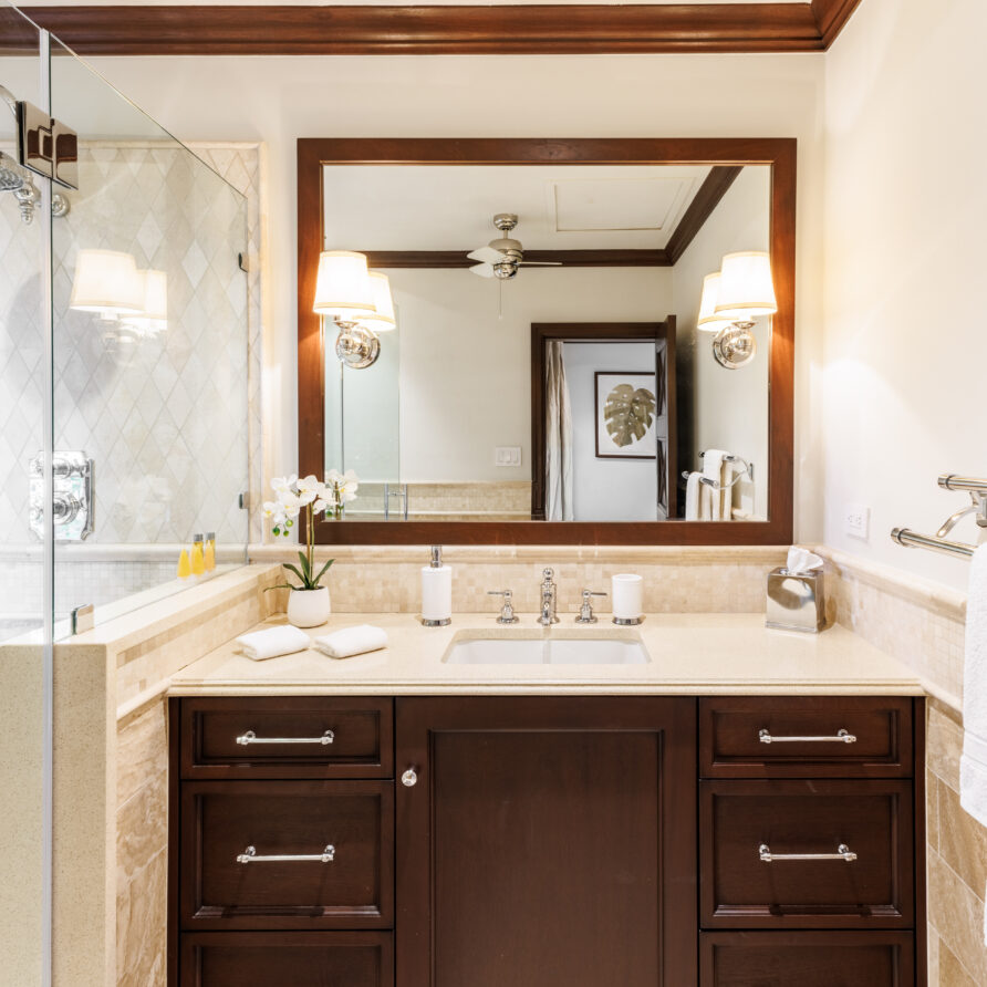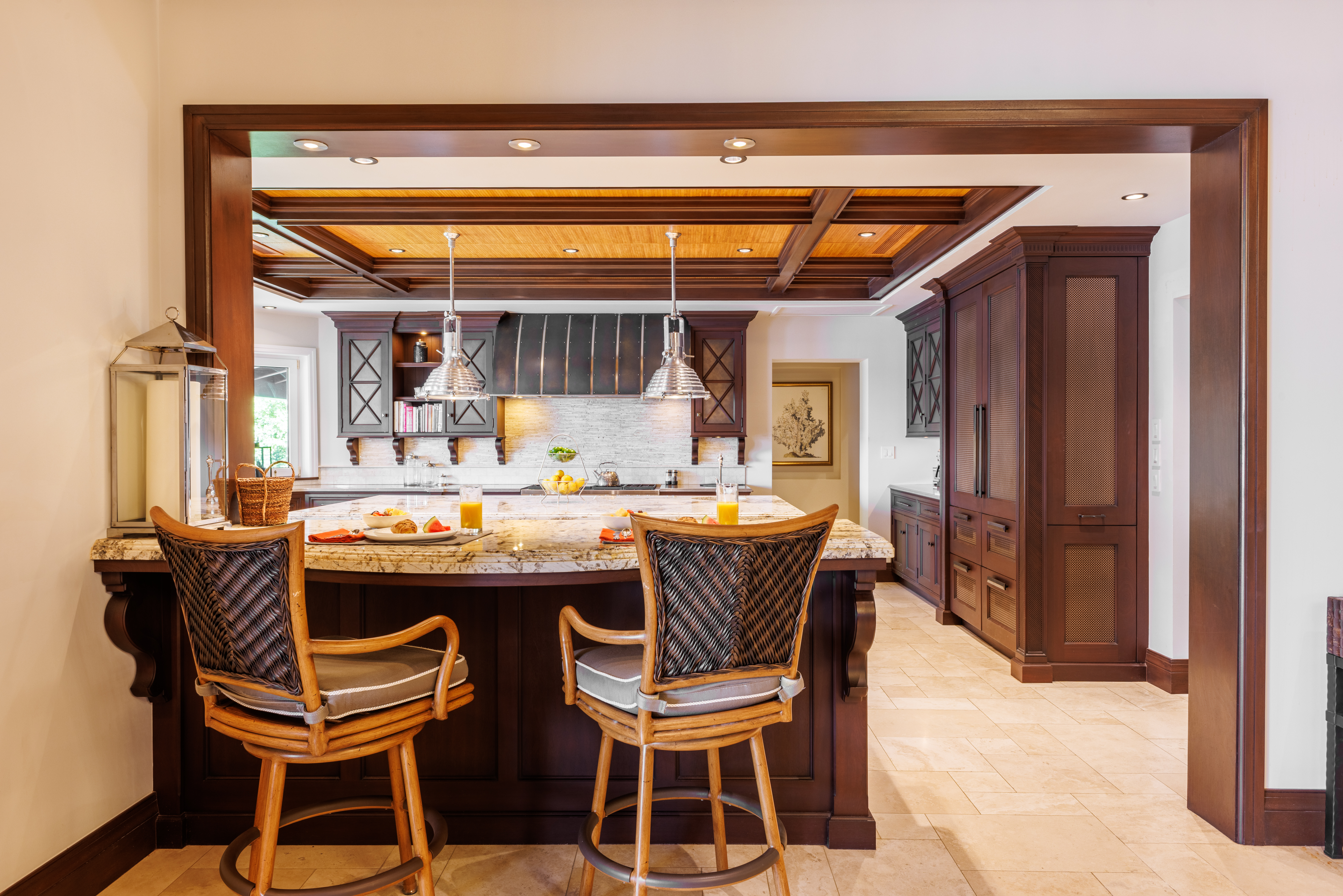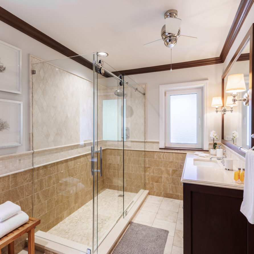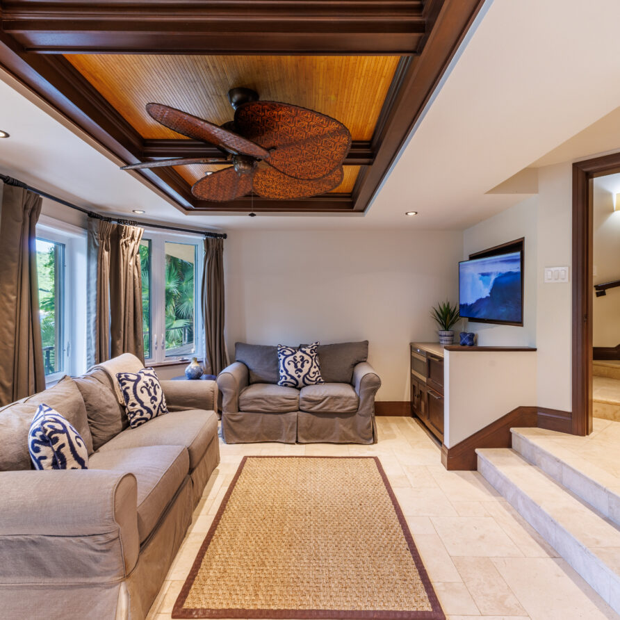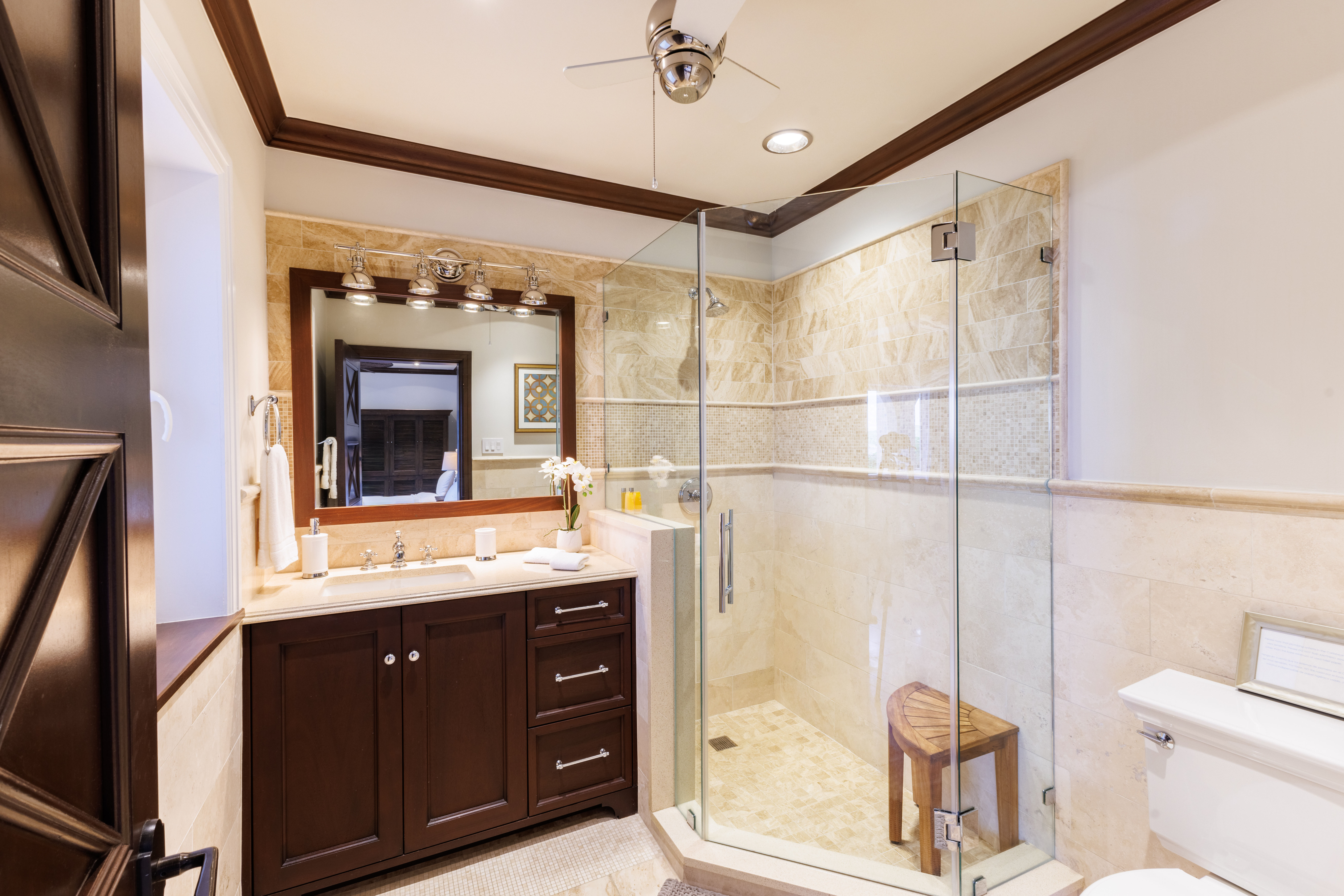 The entry level offers a full service kitchen with Wolf appliances, and enough fridge and freezer space to stock up for a full week. The breakfast bar opens up in to a spacious living room, with a large smart TV and an adjoining office and guest bathroom. A fully covered deck wraps across the front of the villa, and includes a dining area for eight, and a walk up bar for cocktail hour. Just off the kitchen is the master suite, with a large step out balcony, en suite bathroom with glass enclosed shower, and a walk in closet.Â