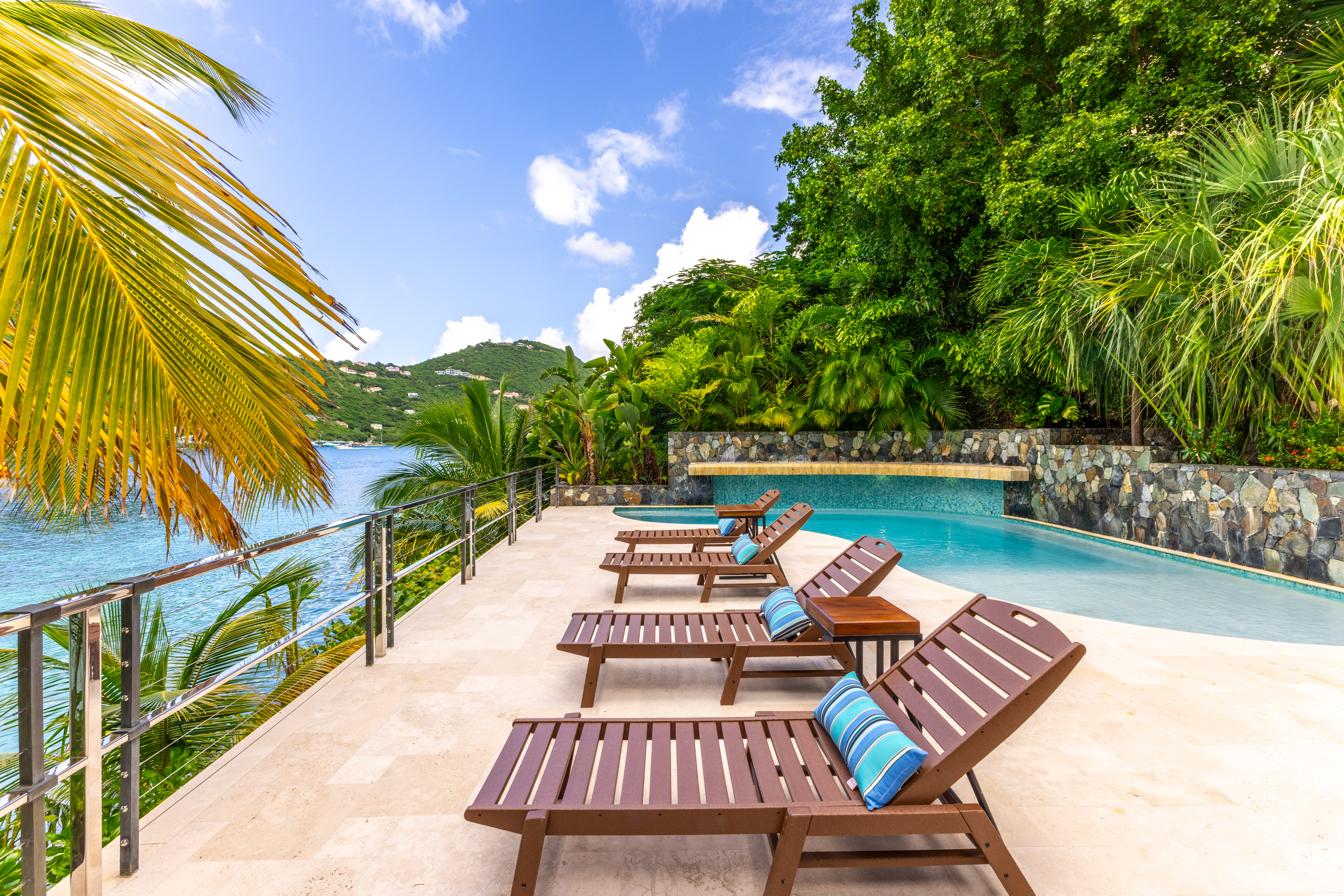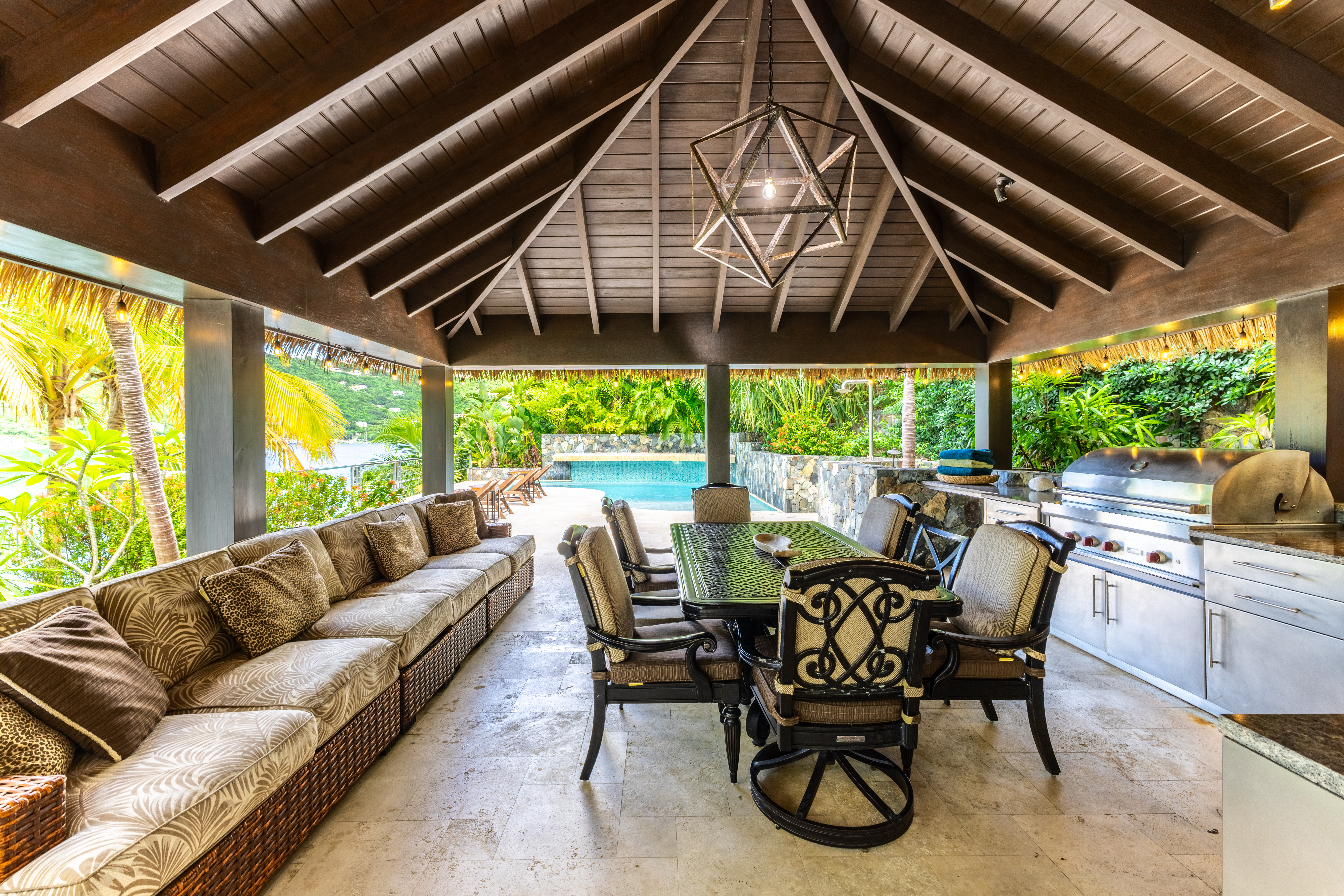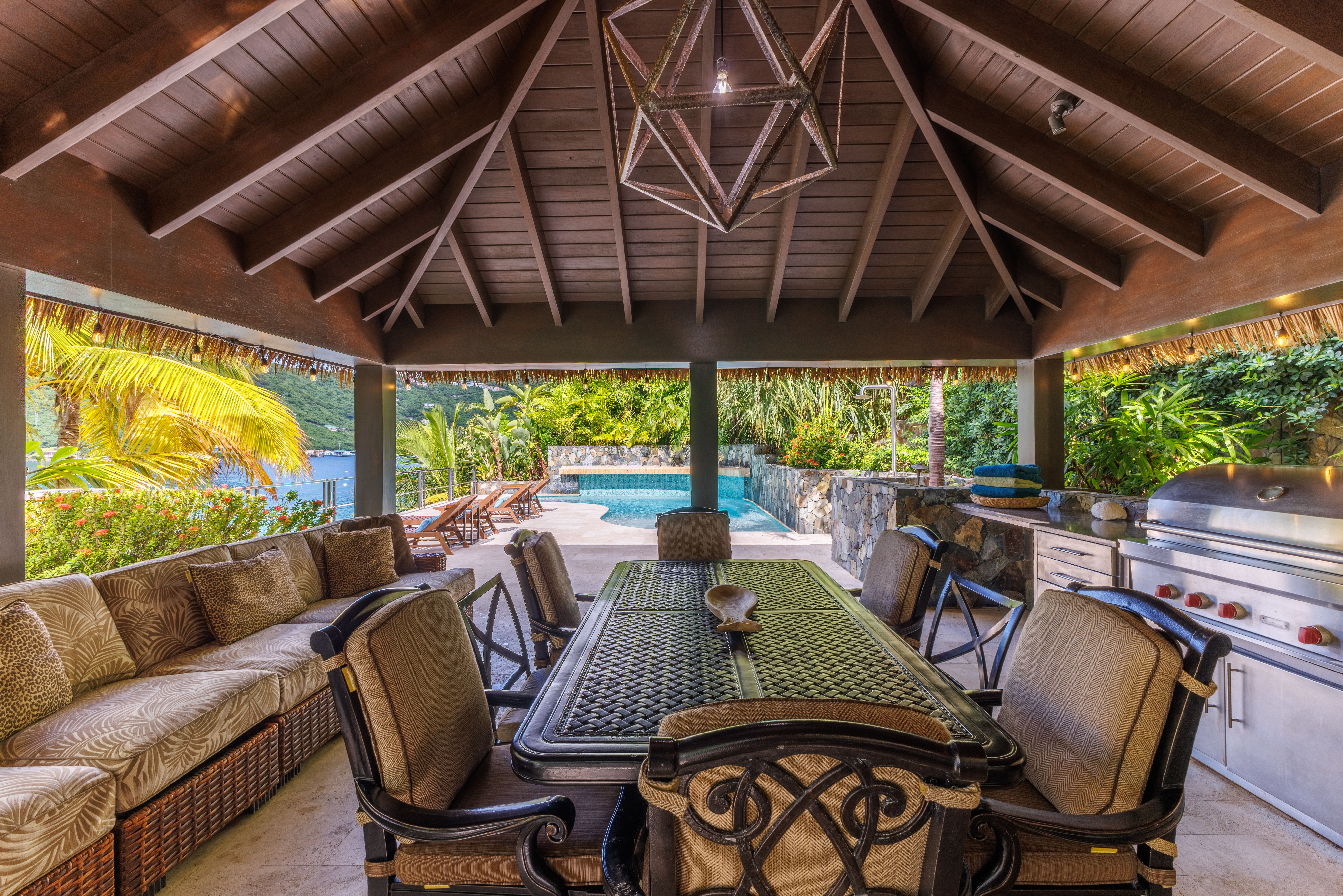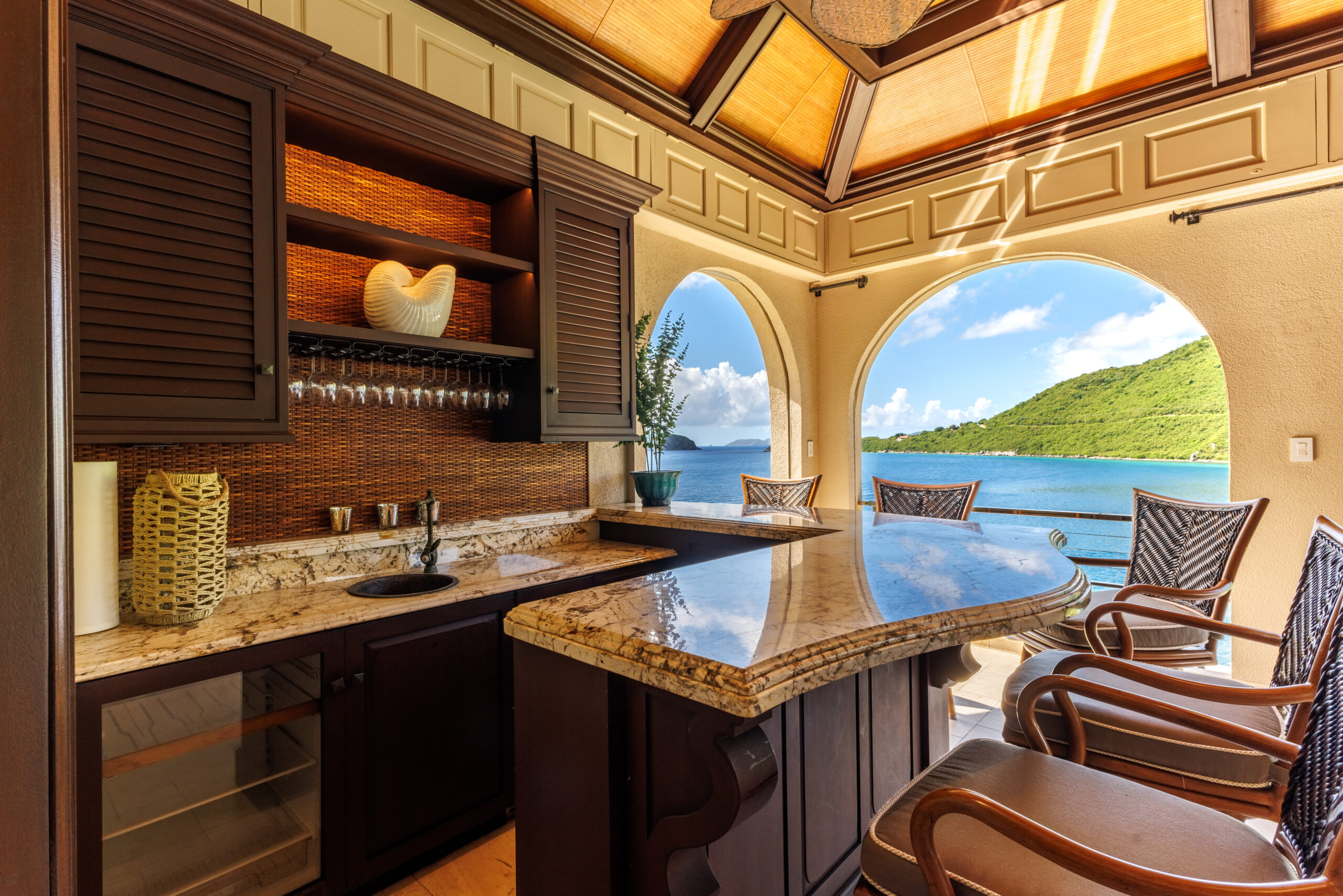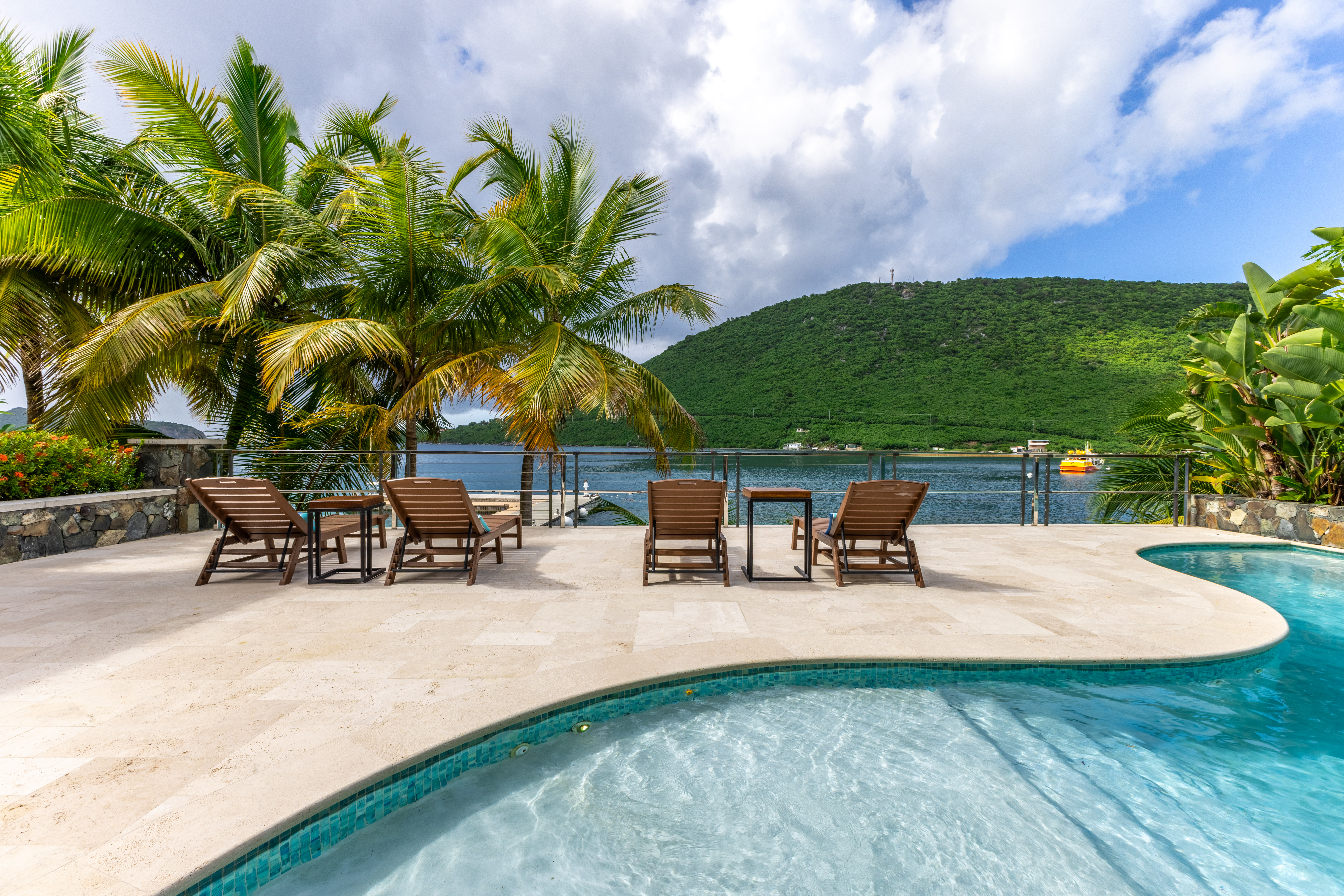 The lower level is home to a workout / yoga area and another full bathroom convenient to the swimming pool and dock. The pool deck is accessed via a second alfresco dining and BBQ area, with sun loungers and couches to relax by the water’s edge, and marvel at the sun setting over Great Thatch. The private dock is available for day charter pickups, leaping in to the crystal clear waters of Sopers Hole, or just dipping your toes in the sea as you watch the pelicans dive for their dinner. Â