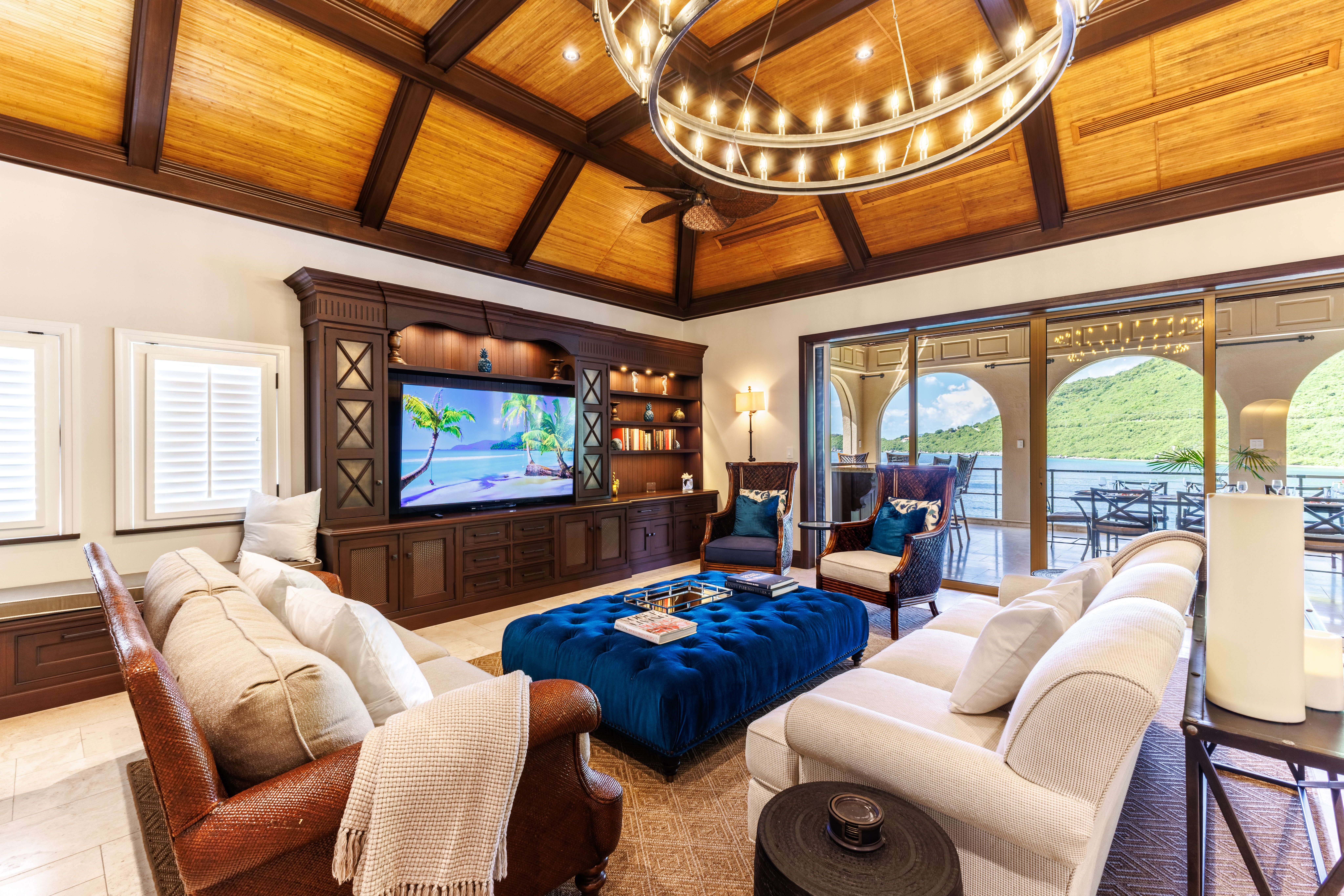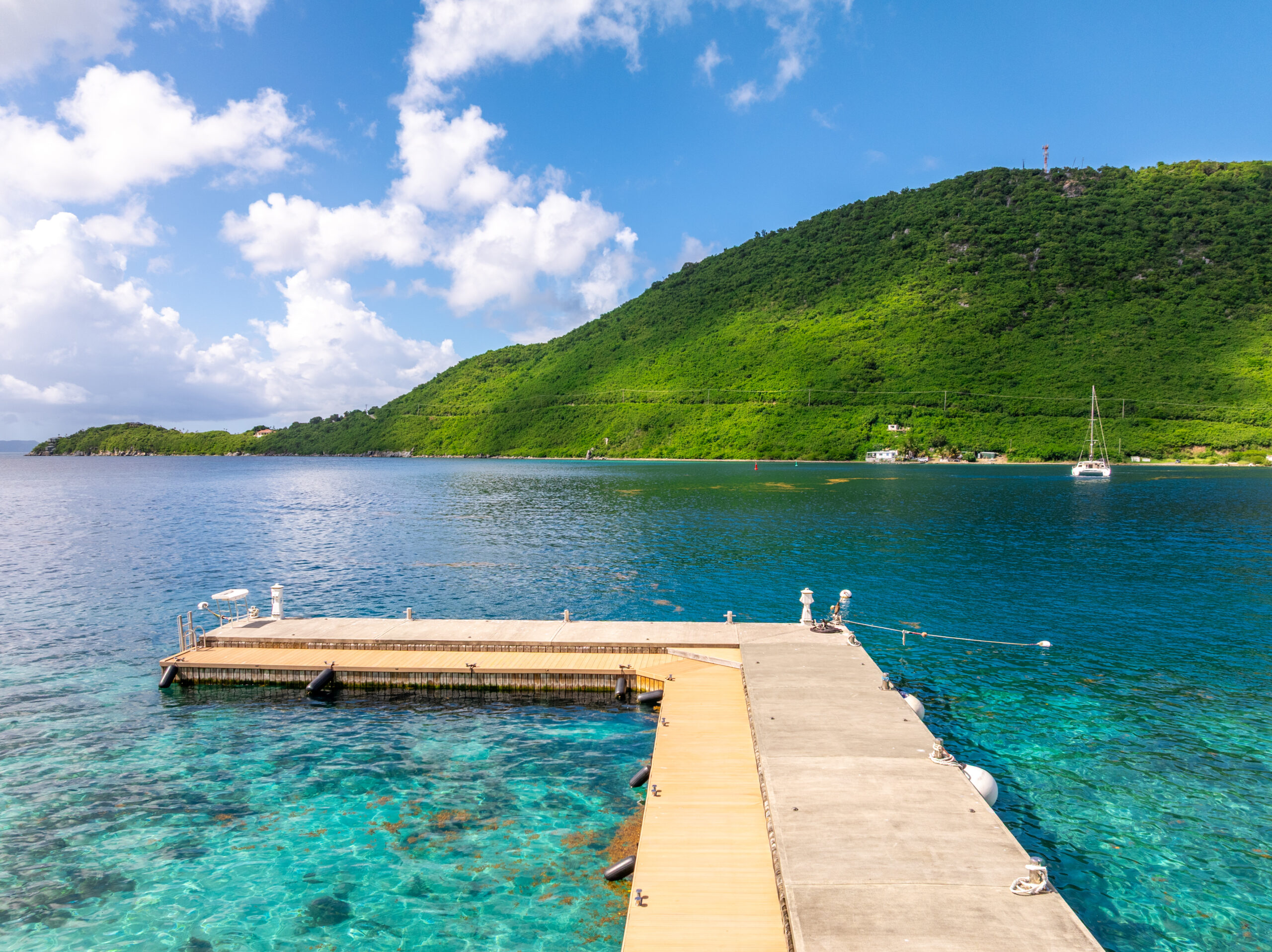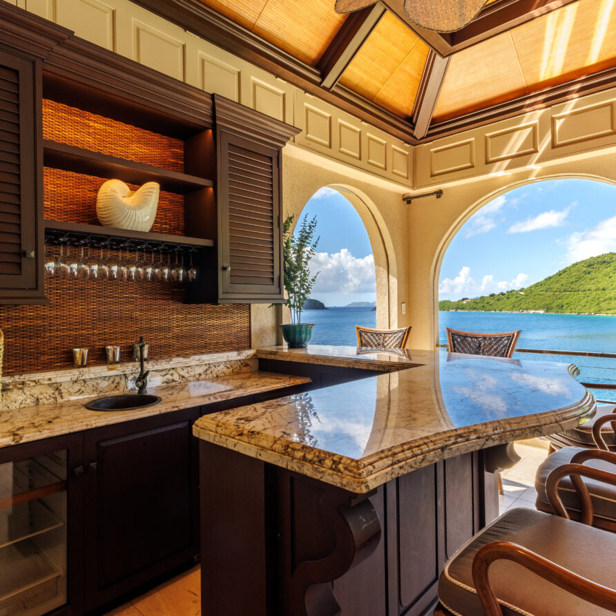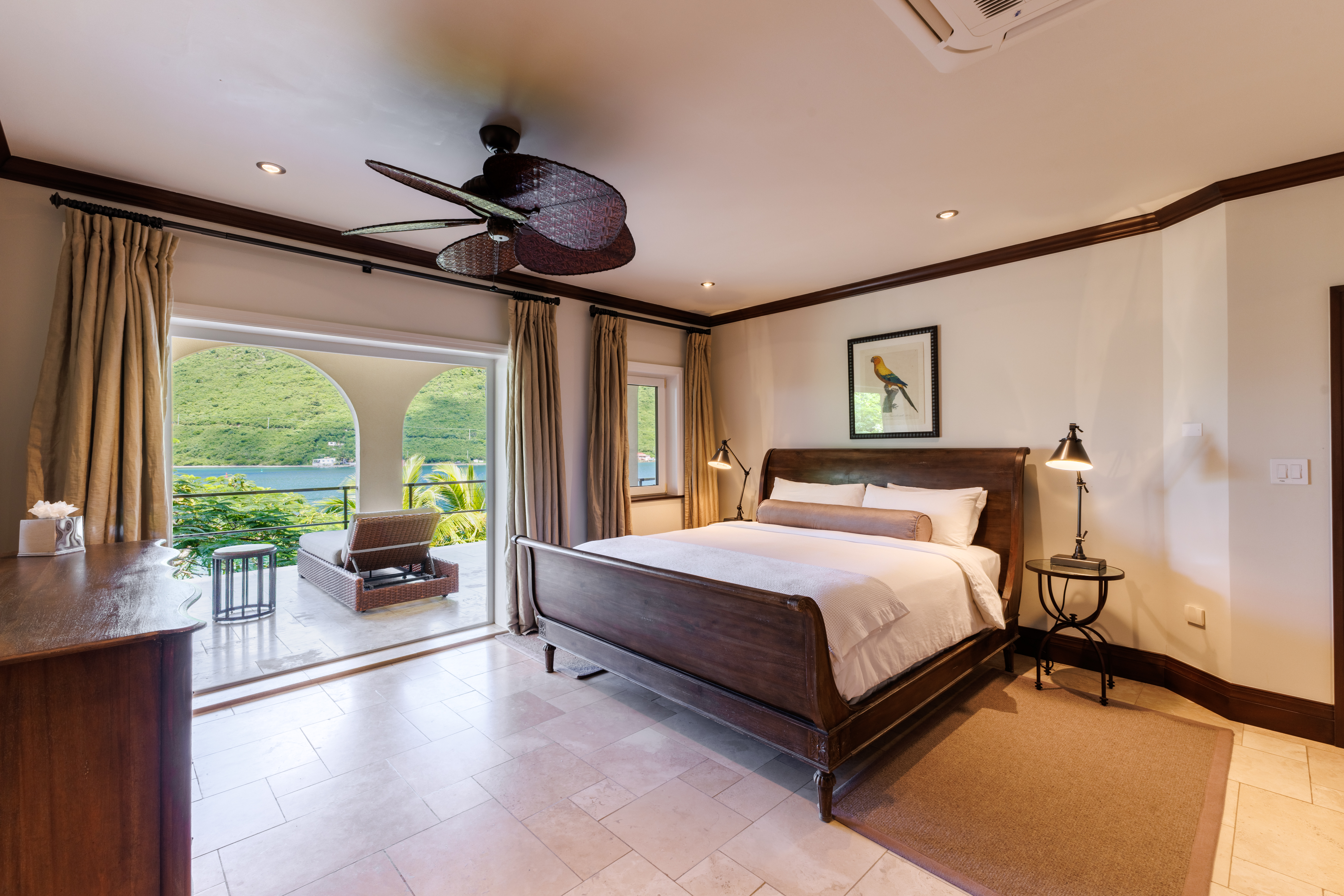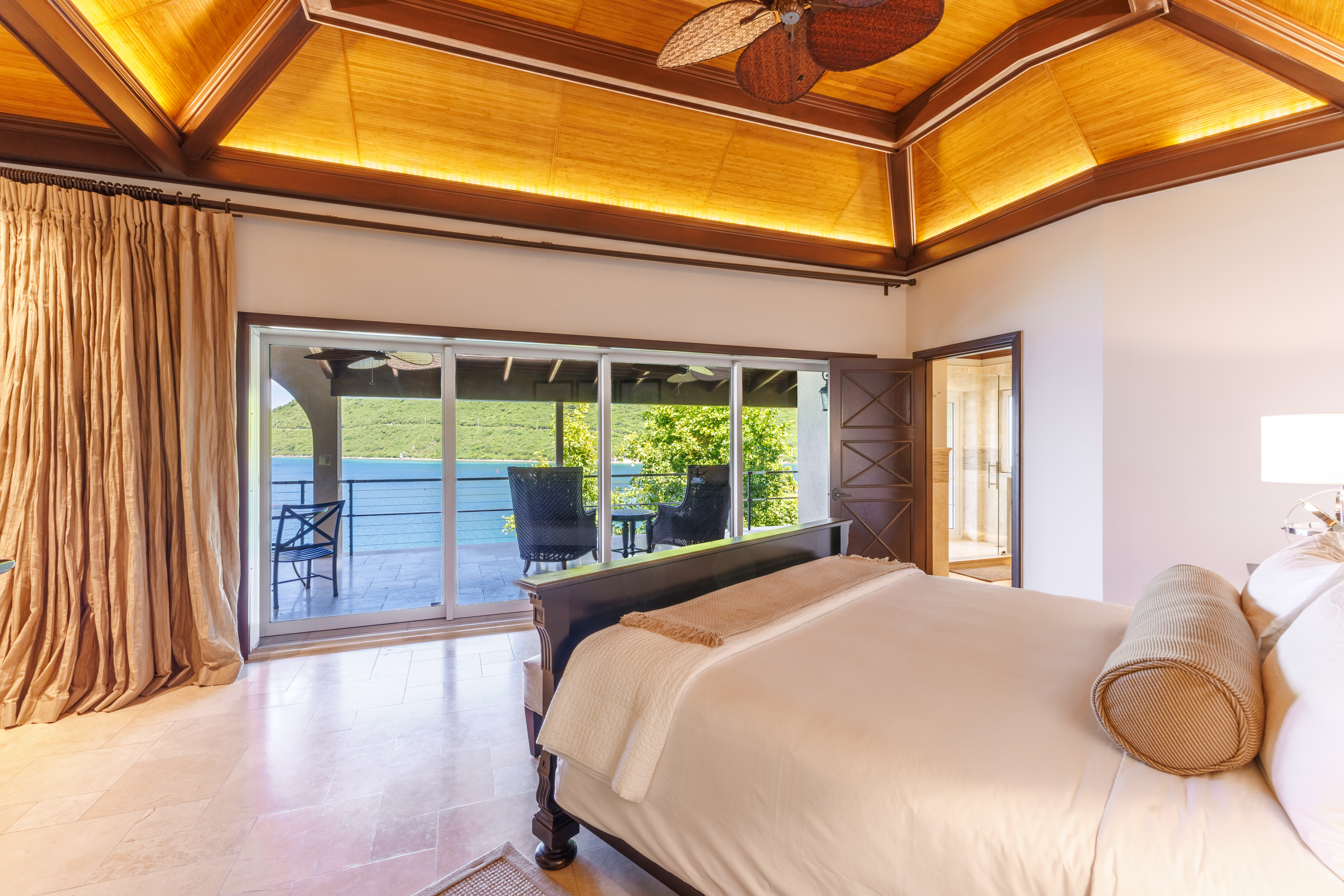 The lower level is home to a workout / yoga area and another full bathroom convenient to the swimming pool and dock. The pool deck is accessed via a second alfresco dining and BBQ area, with sun loungers and couches to relax by the water’s edge, and marvel at the sun setting over Great Thatch. The private dock is available for day charter pickups, leaping in to the crystal clear waters of Sopers Hole, or just dipping your toes in the sea as you watch the pelicans dive for their dinner. Â