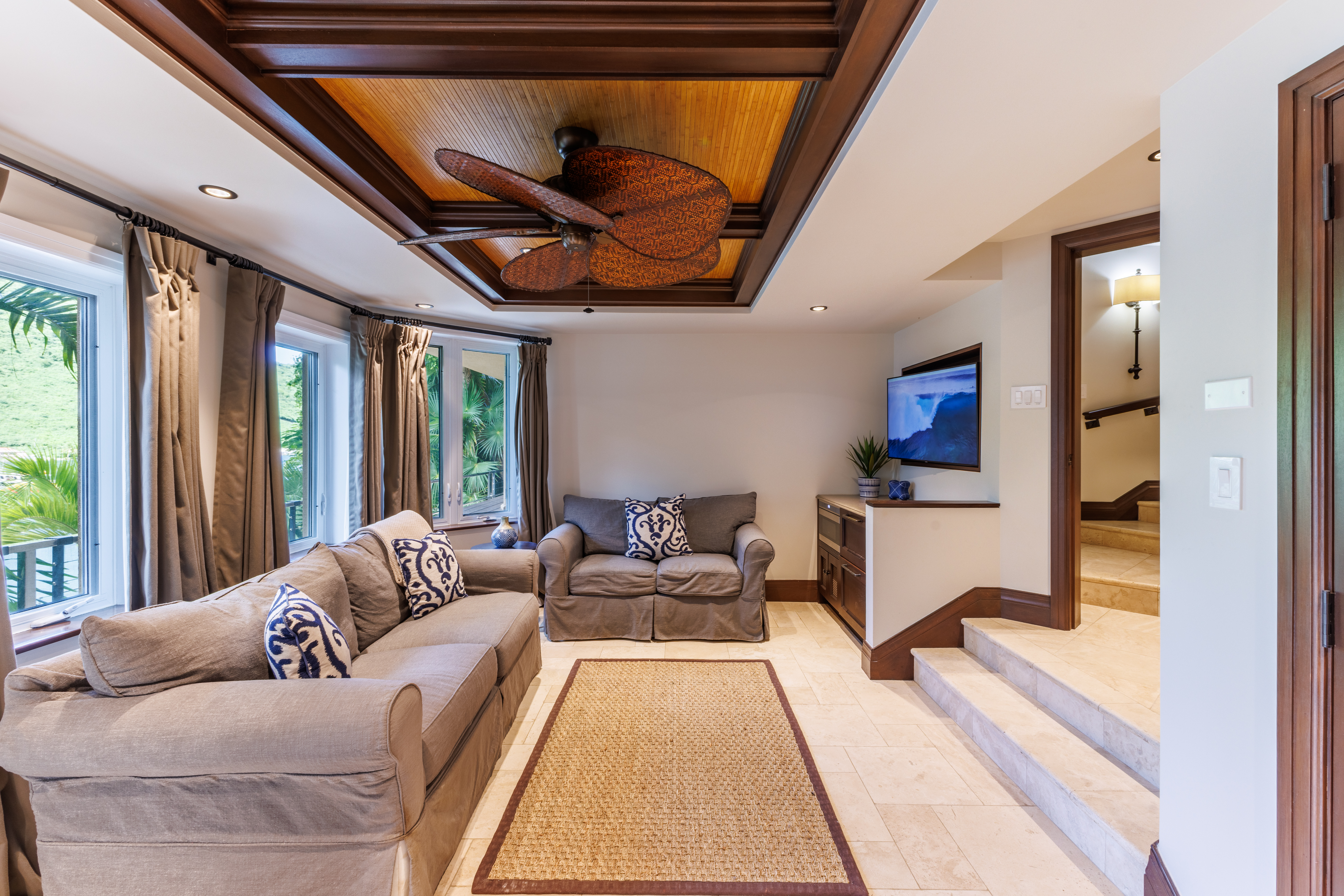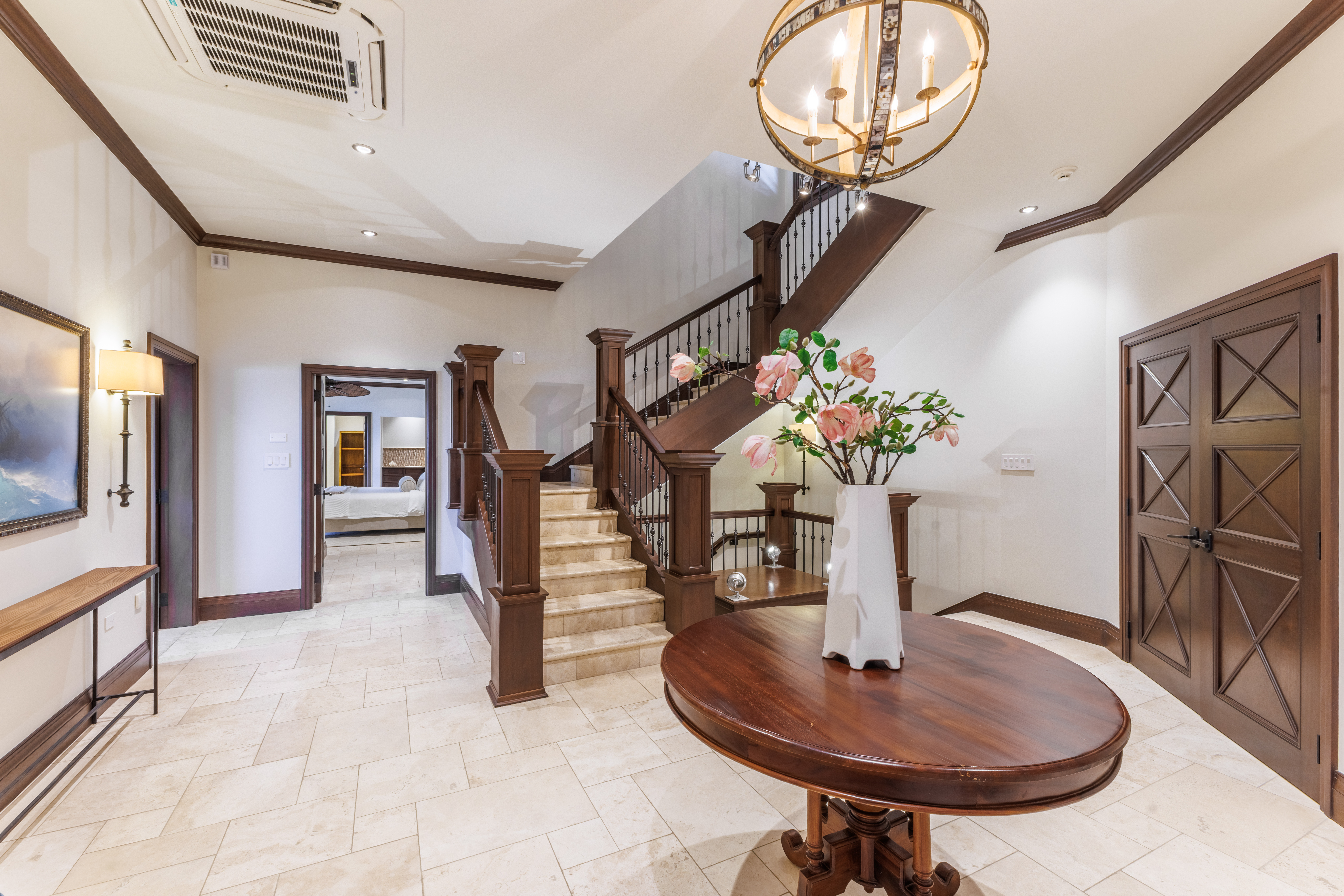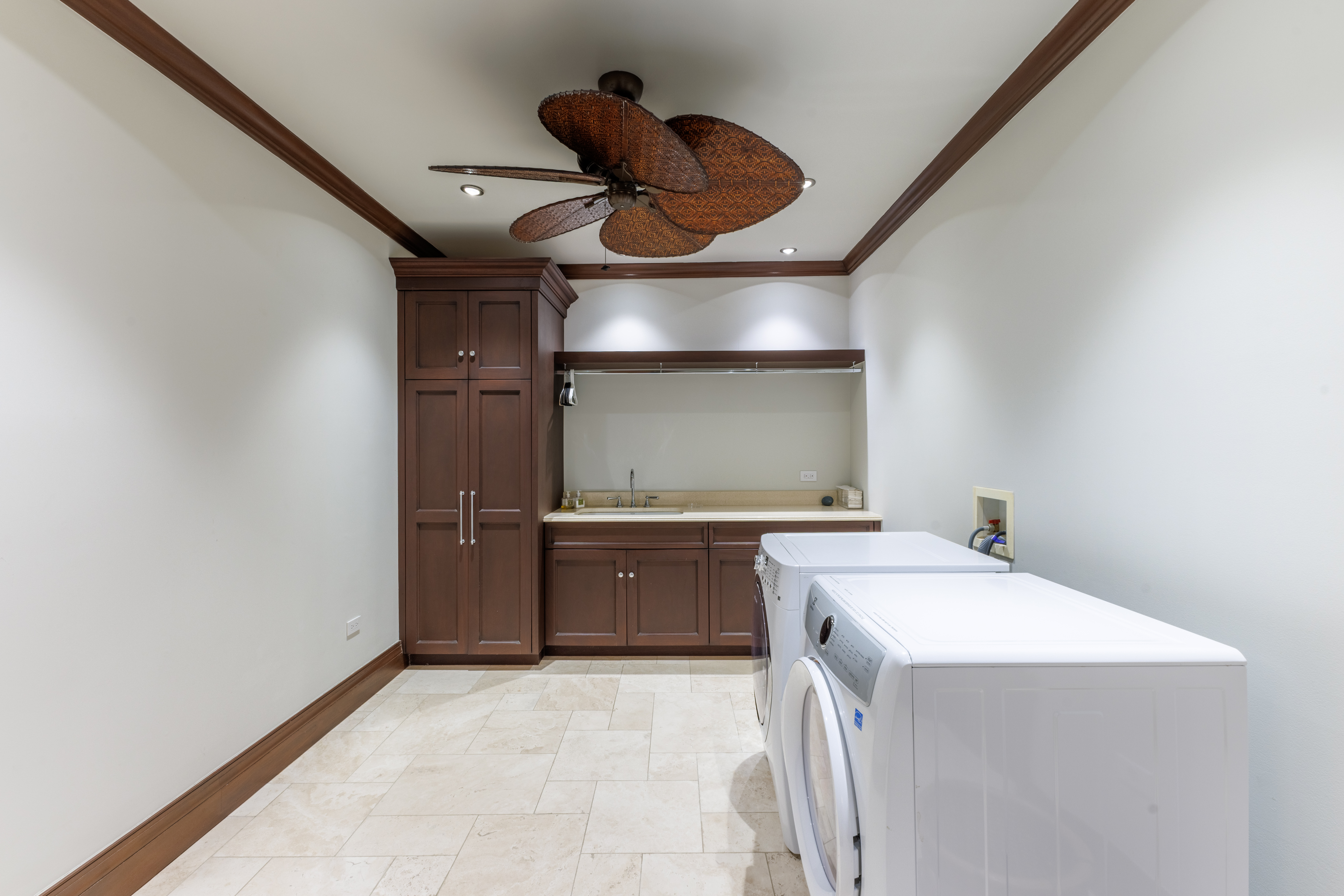 The second floor hosts two king rooms, each with their own en suite bathroom with shower, and a third room with two twin beds with an en suite bathroom with shower, all of which open out on to another covered deck looking out over the aqua blue ocean right outside. There is also a laundry room available for your use on this level.Â