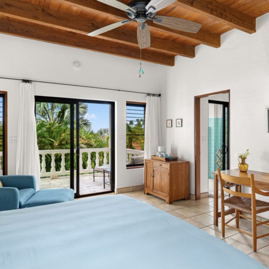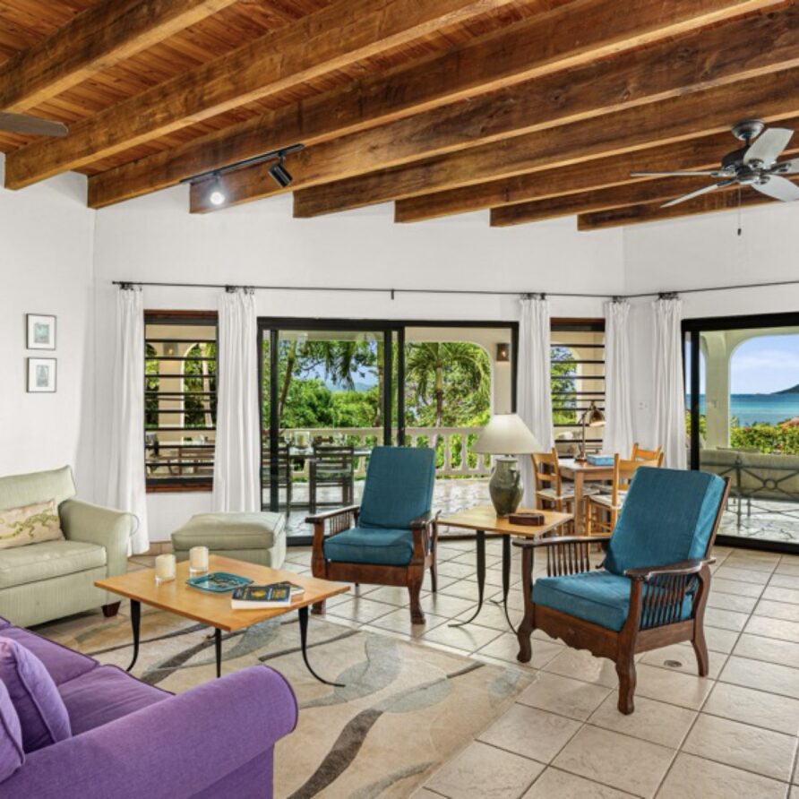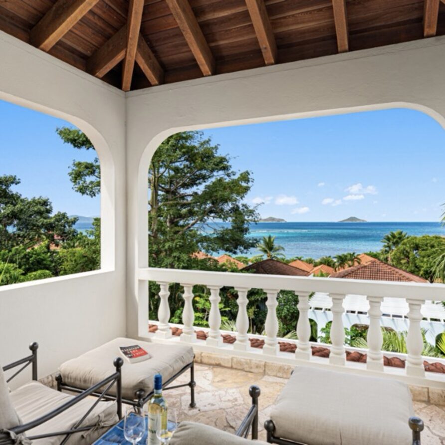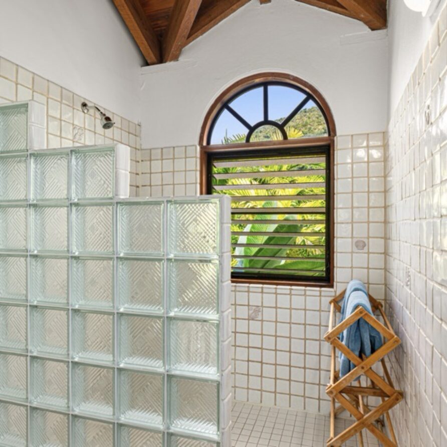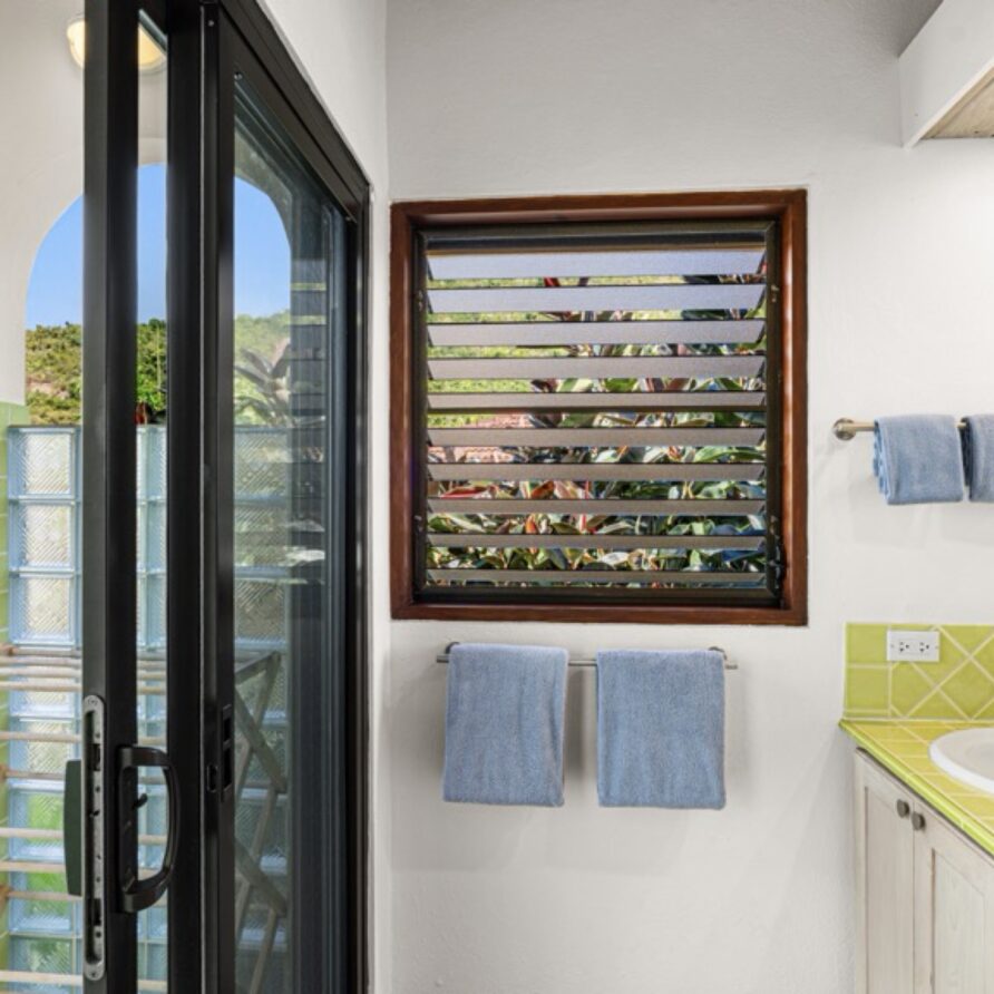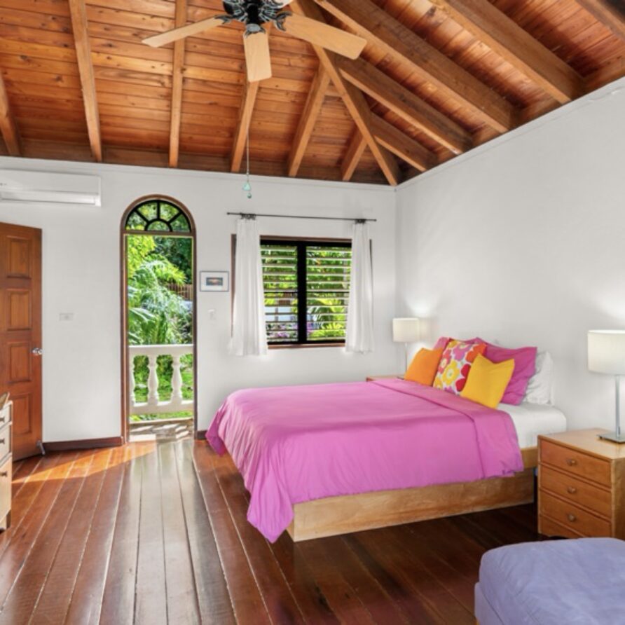 In the adjoining guesthouse, the first level bedroom has a King bed, with ensuite bath, outdoor shower, private veranda facing Mahoe Bay and a secluded patio off the back of the bedroom. The second floor bedroom in the guesthouse has a Queen bed and ensuite bath with outside shower, The attached, covered veranda provides beautiful views of sunsets over Mahoe Bay and Seal Island.