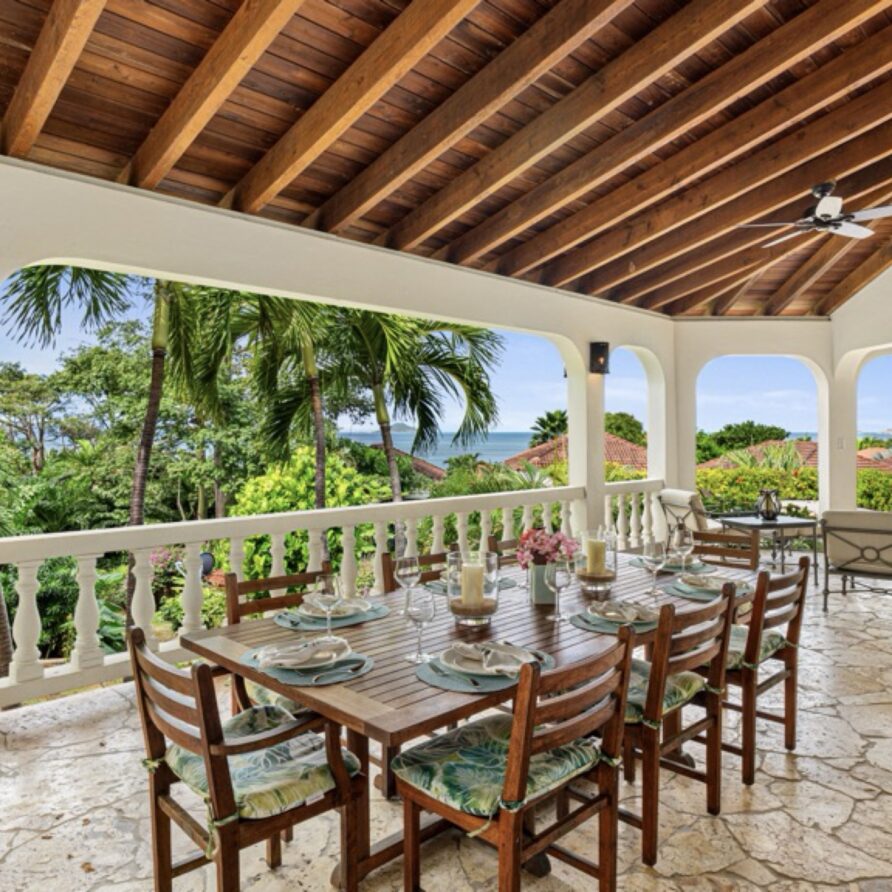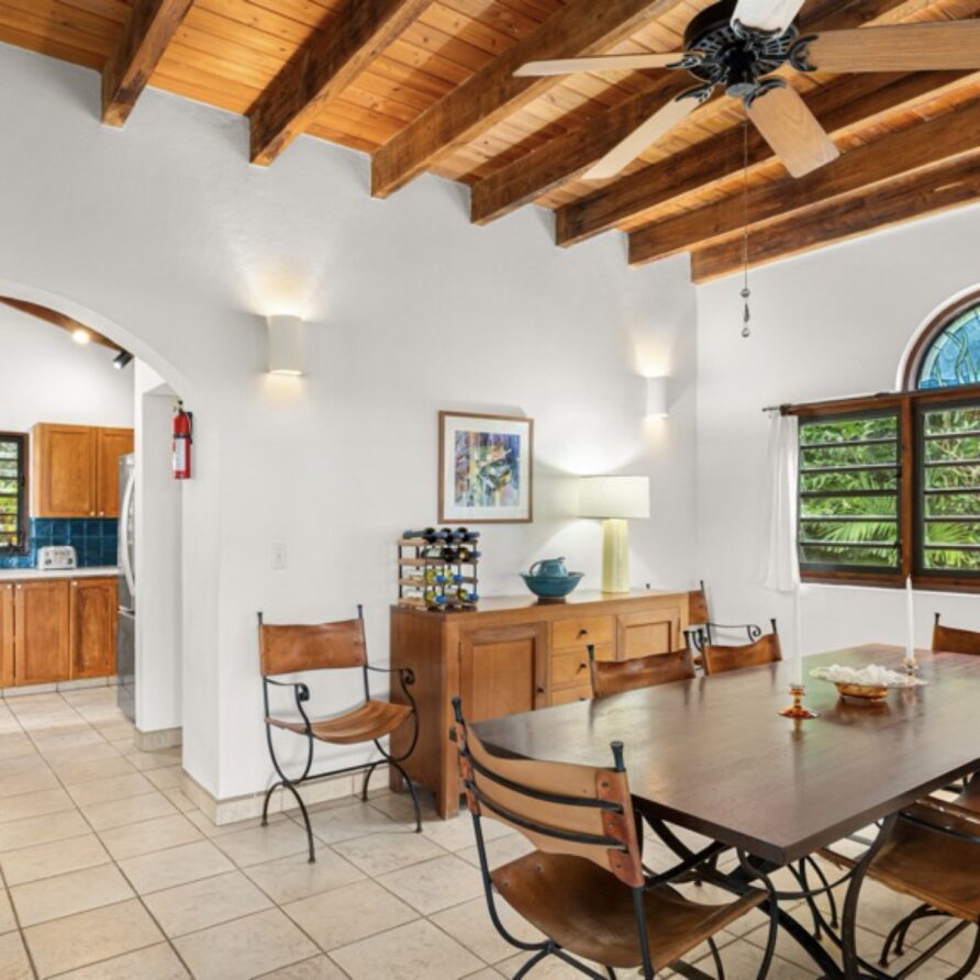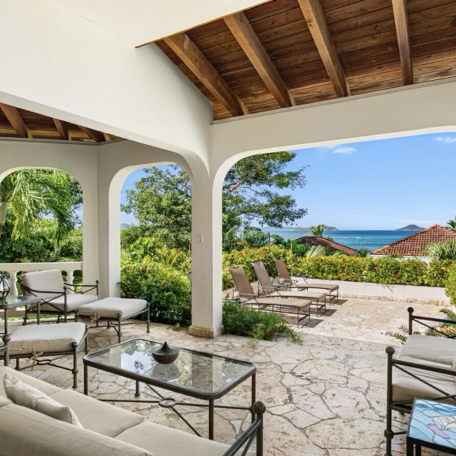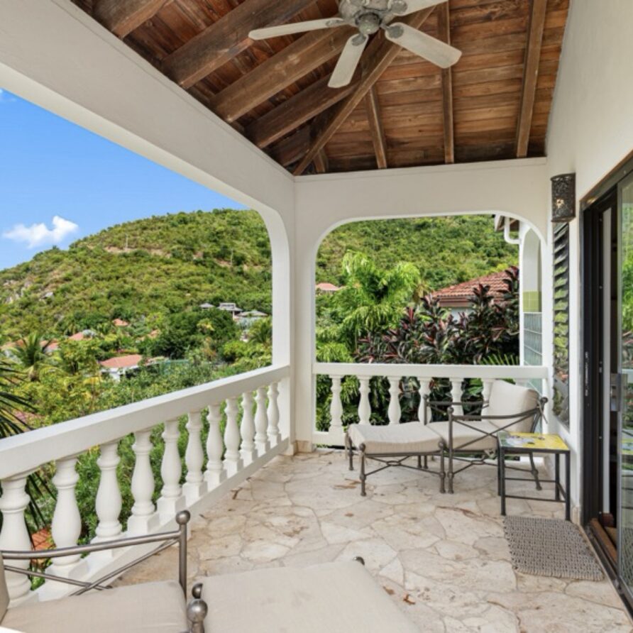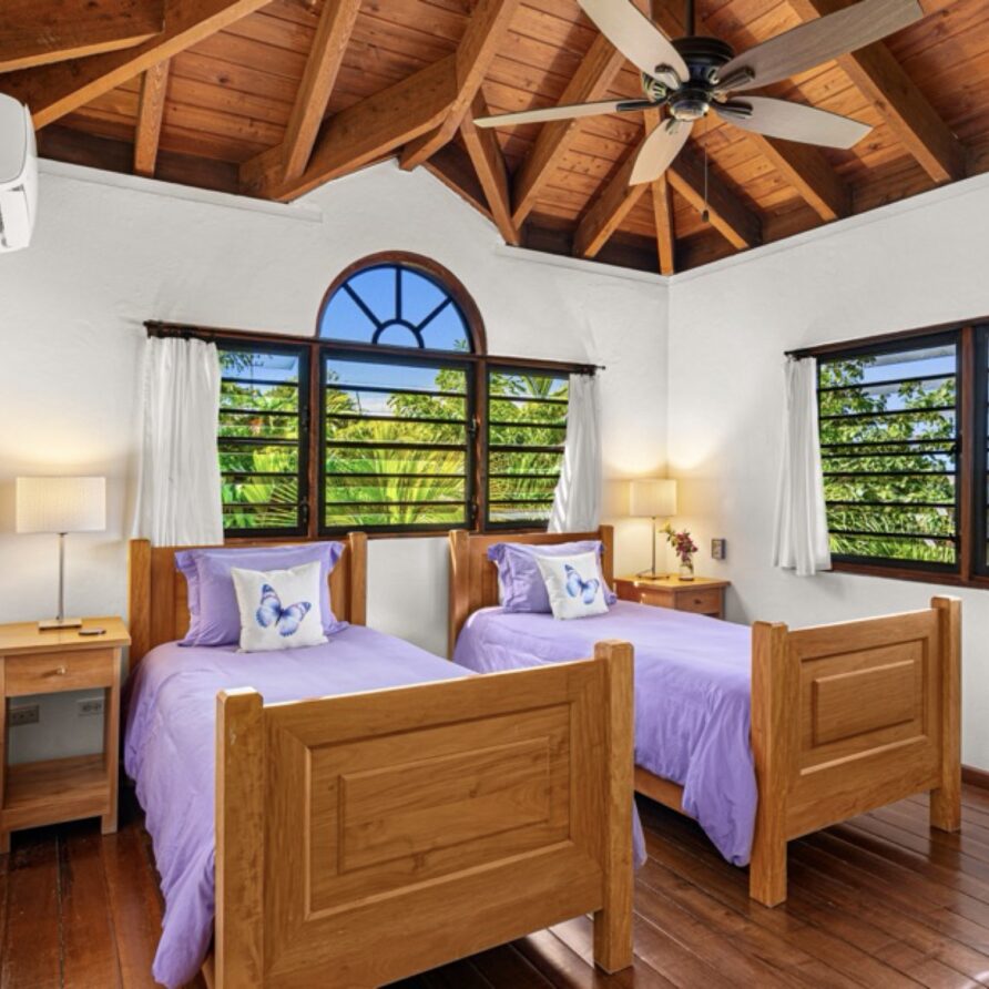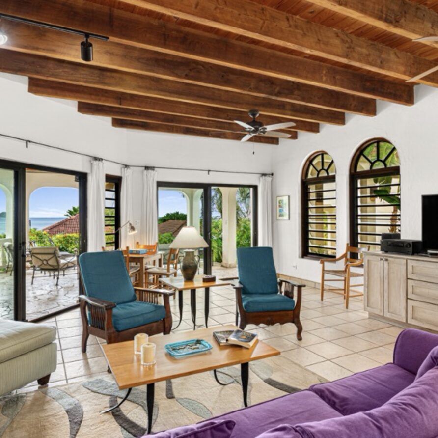 In the adjoining guesthouse, the first level bedroom has a King bed, with ensuite bath, outdoor shower, private veranda facing Mahoe Bay and a secluded patio off the back of the bedroom. The second floor bedroom in the guesthouse has a Queen bed and ensuite bath with outside shower, The attached, covered veranda provides beautiful views of sunsets over Mahoe Bay and Seal Island.