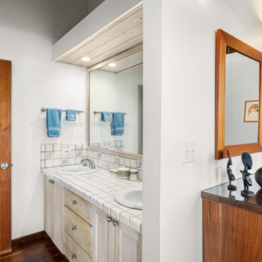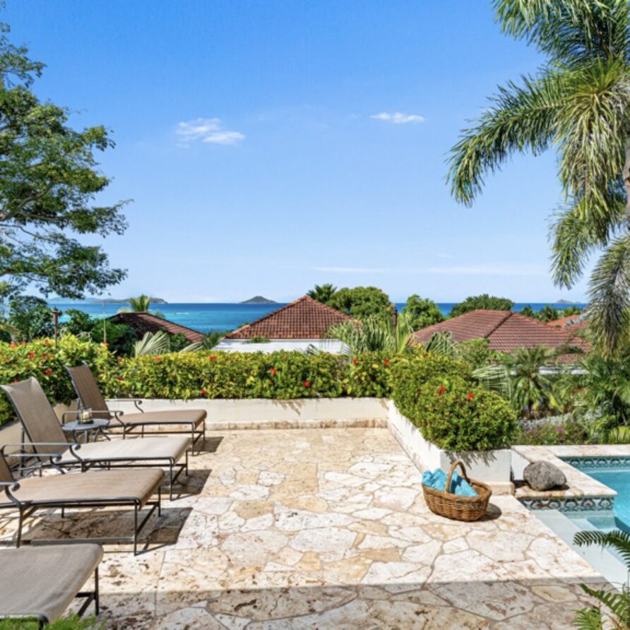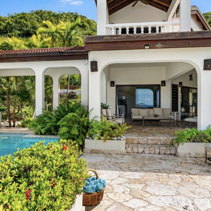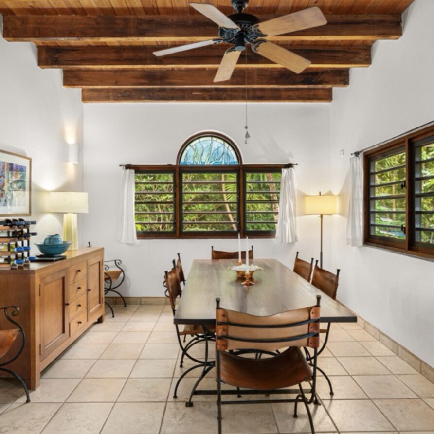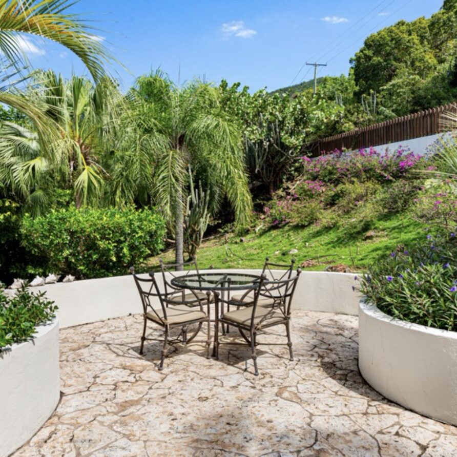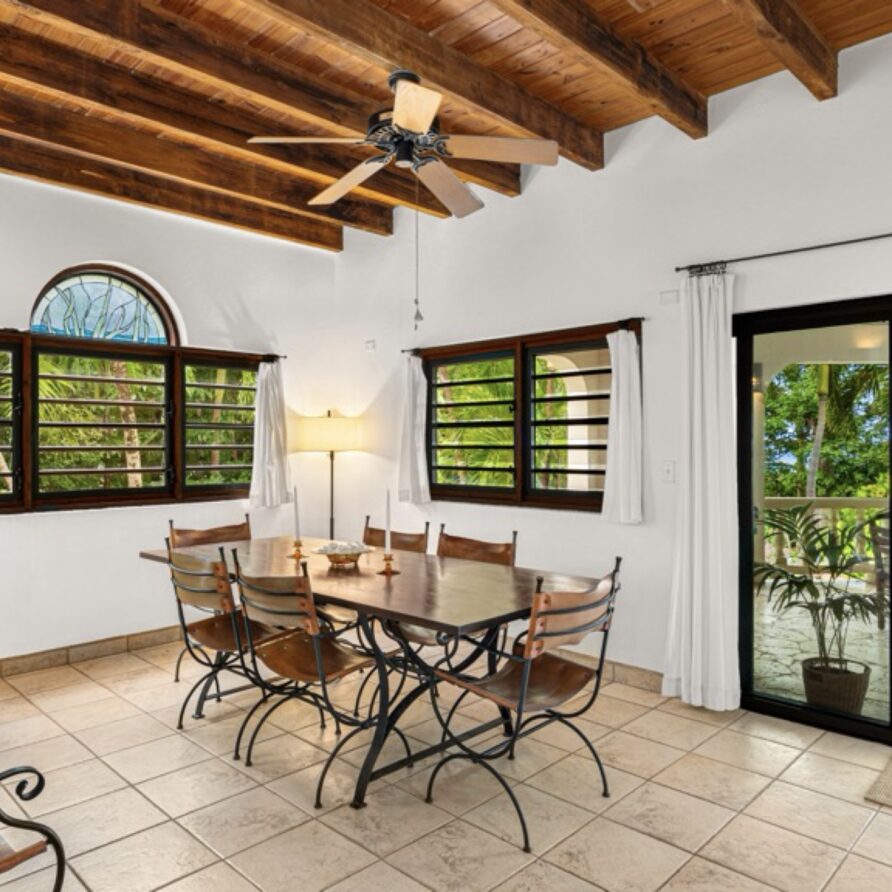 In the adjoining guesthouse, the first level bedroom has a King bed, with ensuite bath, outdoor shower, private veranda facing Mahoe Bay and a secluded patio off the back of the bedroom. The second floor bedroom in the guesthouse has a Queen bed and ensuite bath with outside shower, The attached, covered veranda provides beautiful views of sunsets over Mahoe Bay and Seal Island.