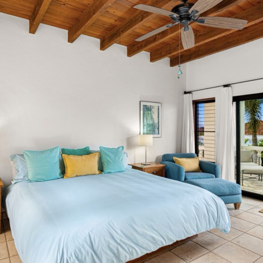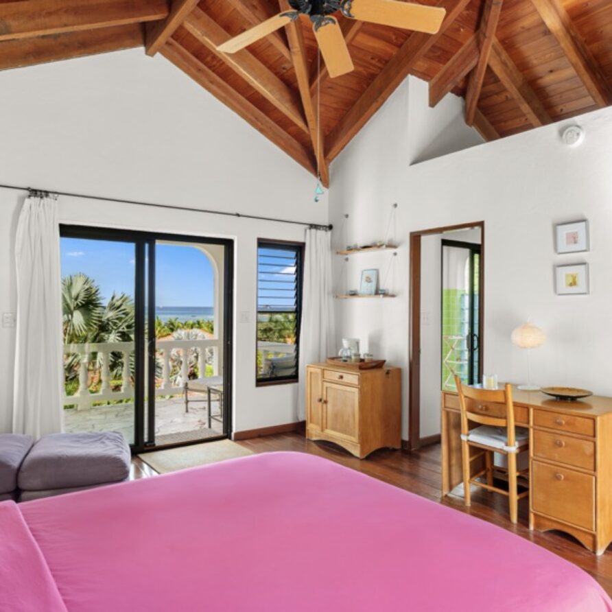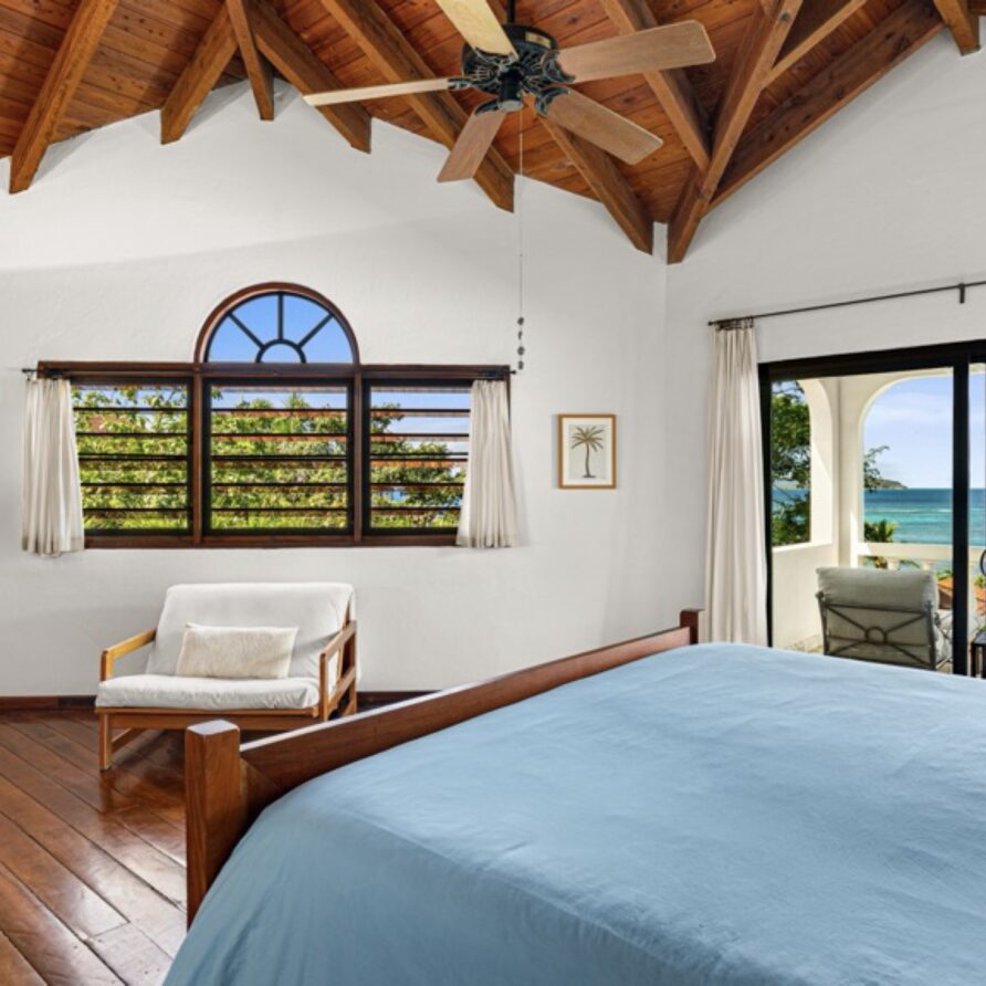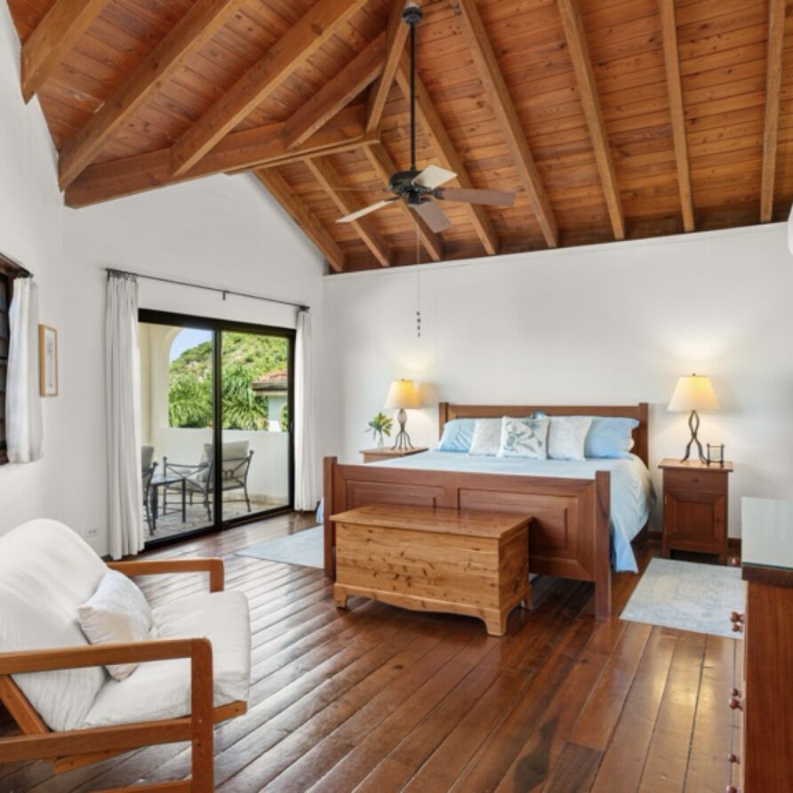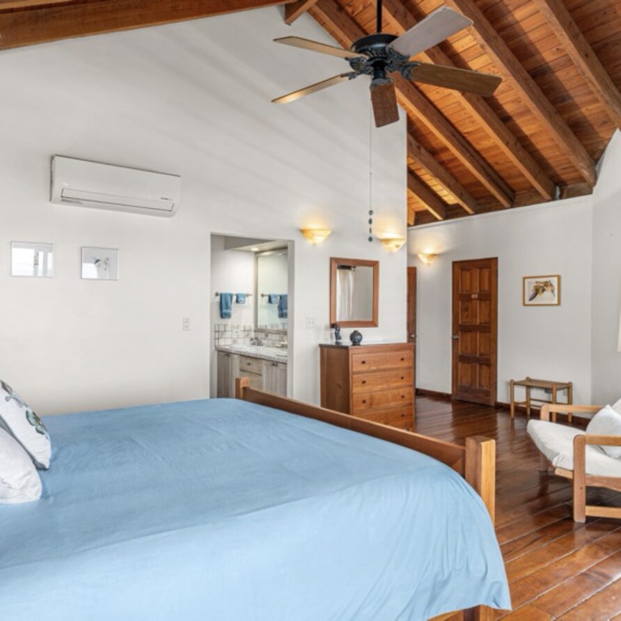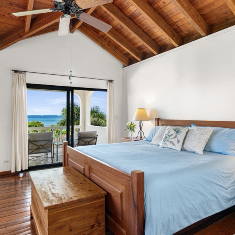 The master bedroom is largest in the villa and has breathtaking view of Mahoe Bay and George Island. The ensuite bathroom with custom made tiles is to the right with a large closet and entry way behind the viewer.