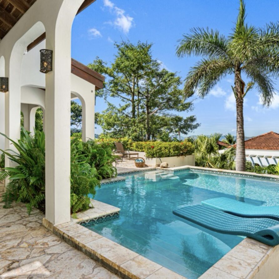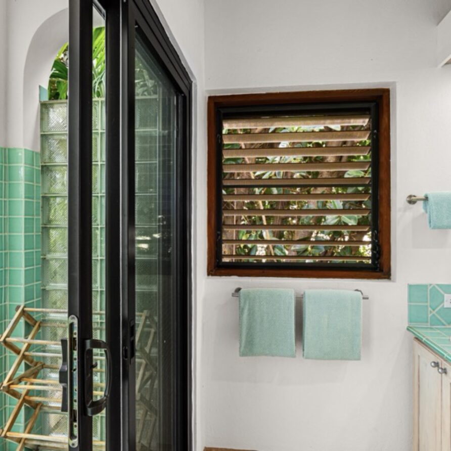 The mainhouse and the guesthouse are connected by a covered walkway that adjoins the pool and looks out towards the sundeck. The entrance to the first floor bedroom in the guest house is on the pool level with the second level bedroom up the stairs on the right.