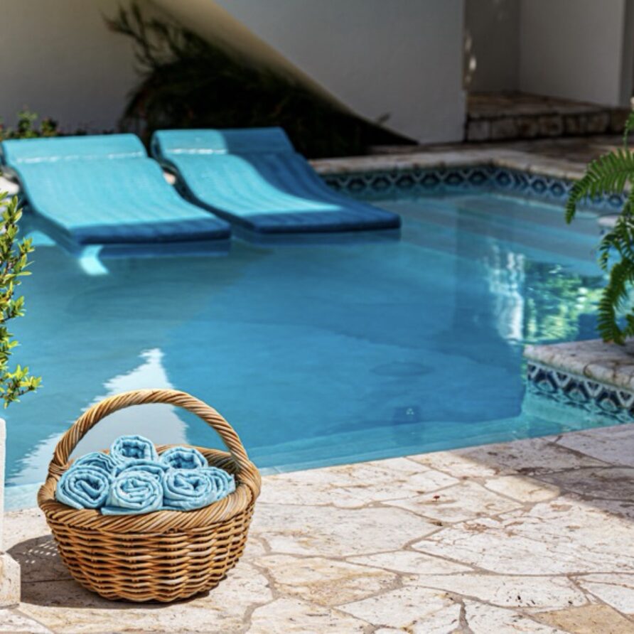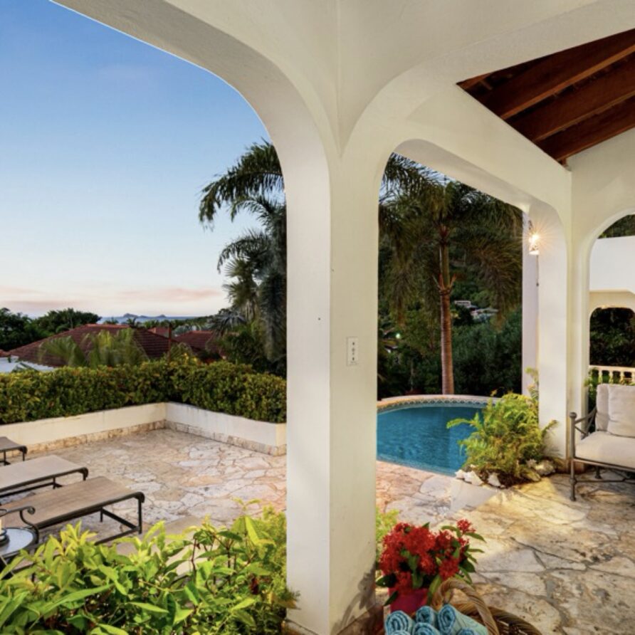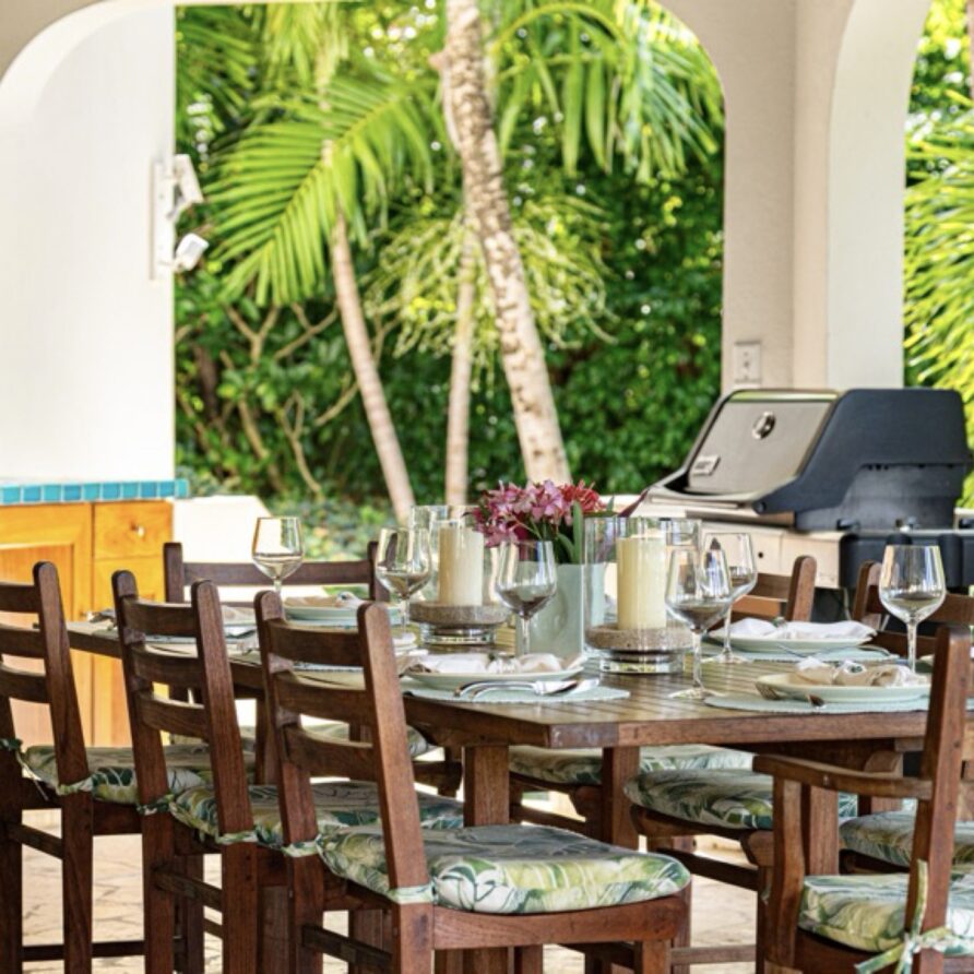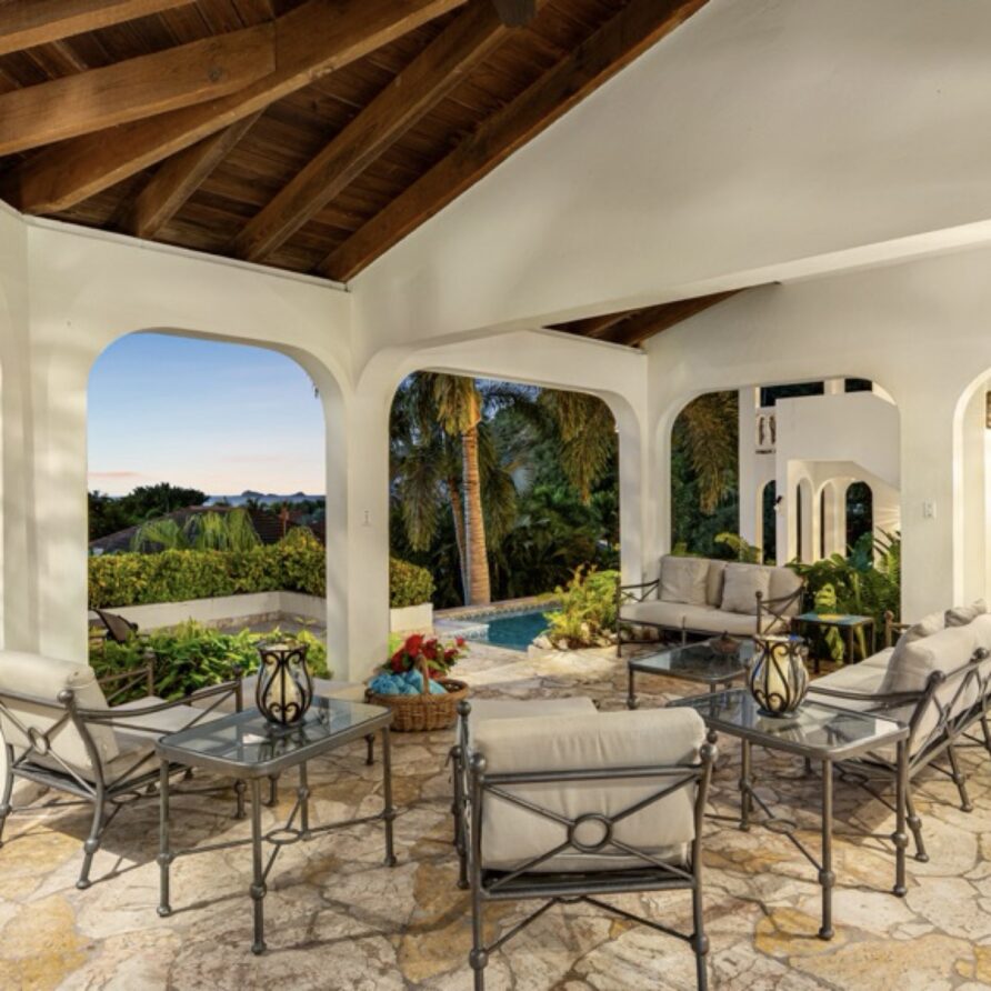 The coralstone veranda combines everything you need for alfresco dining at a teak table for eight as well as a large area adjacent to the pool for relaxing.