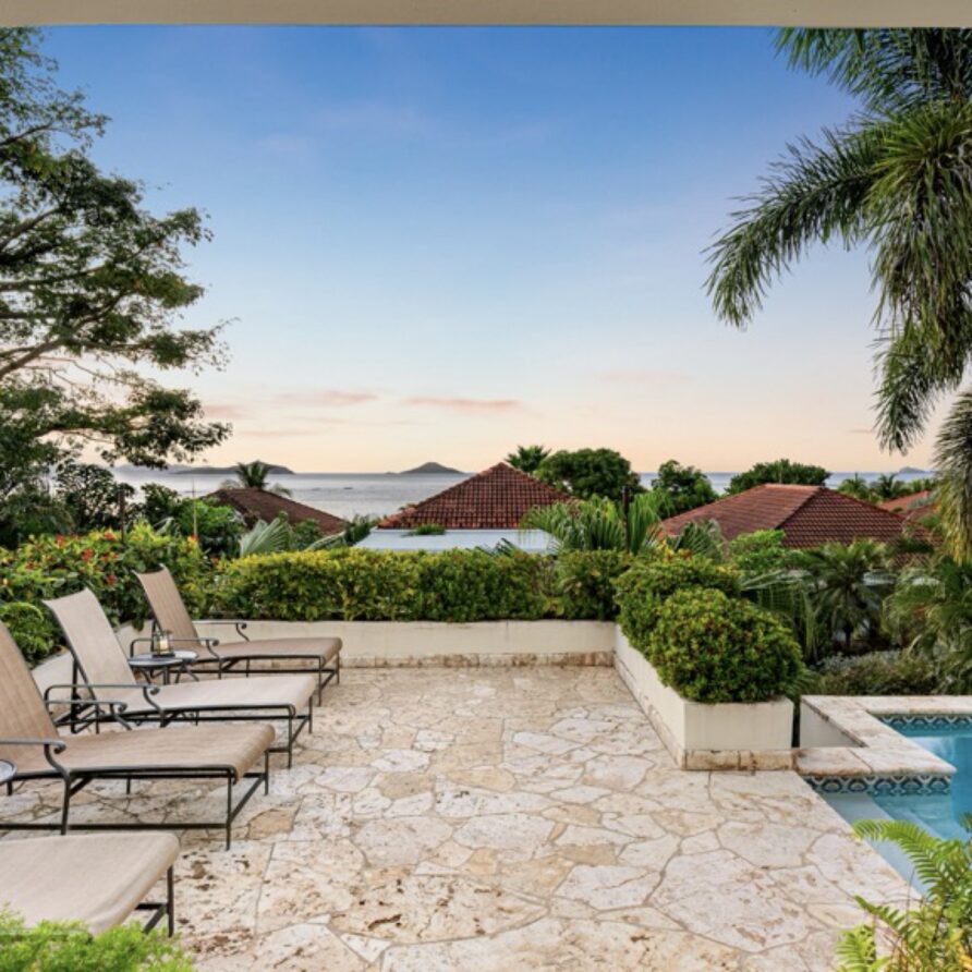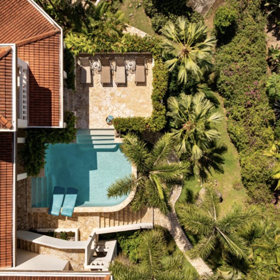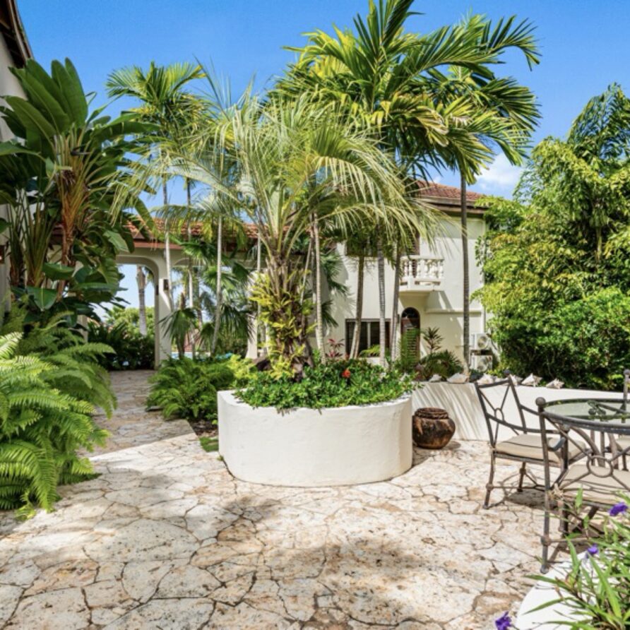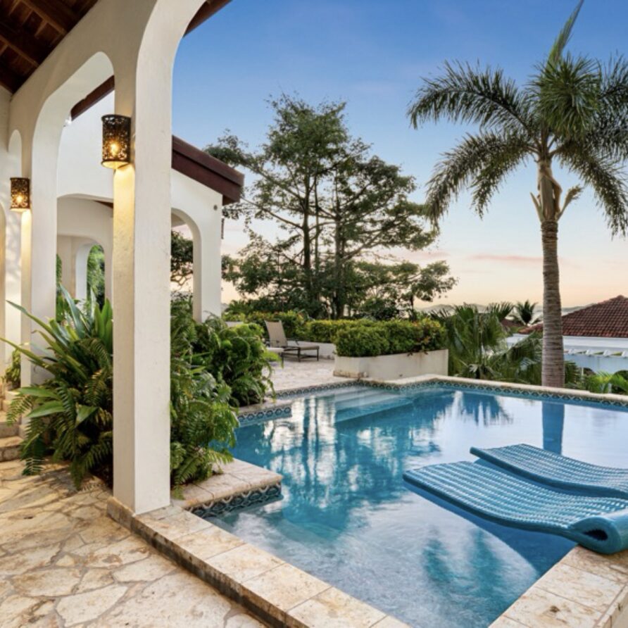 The coralstone veranda combines everything you need for alfresco dining at a teak table for eight as well as a large area adjacent to the pool for relaxing.